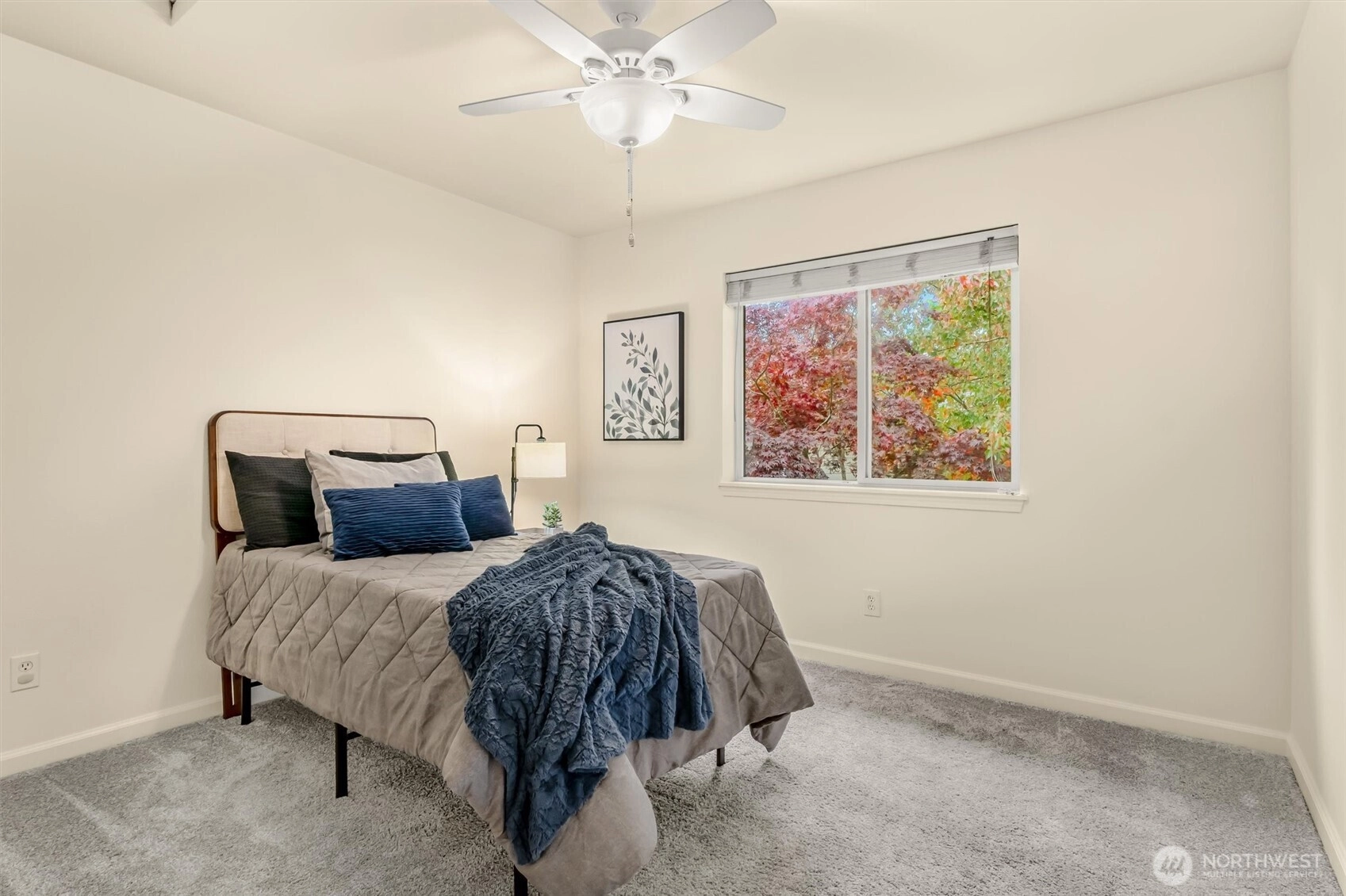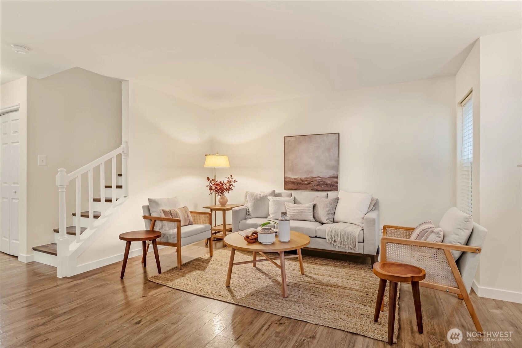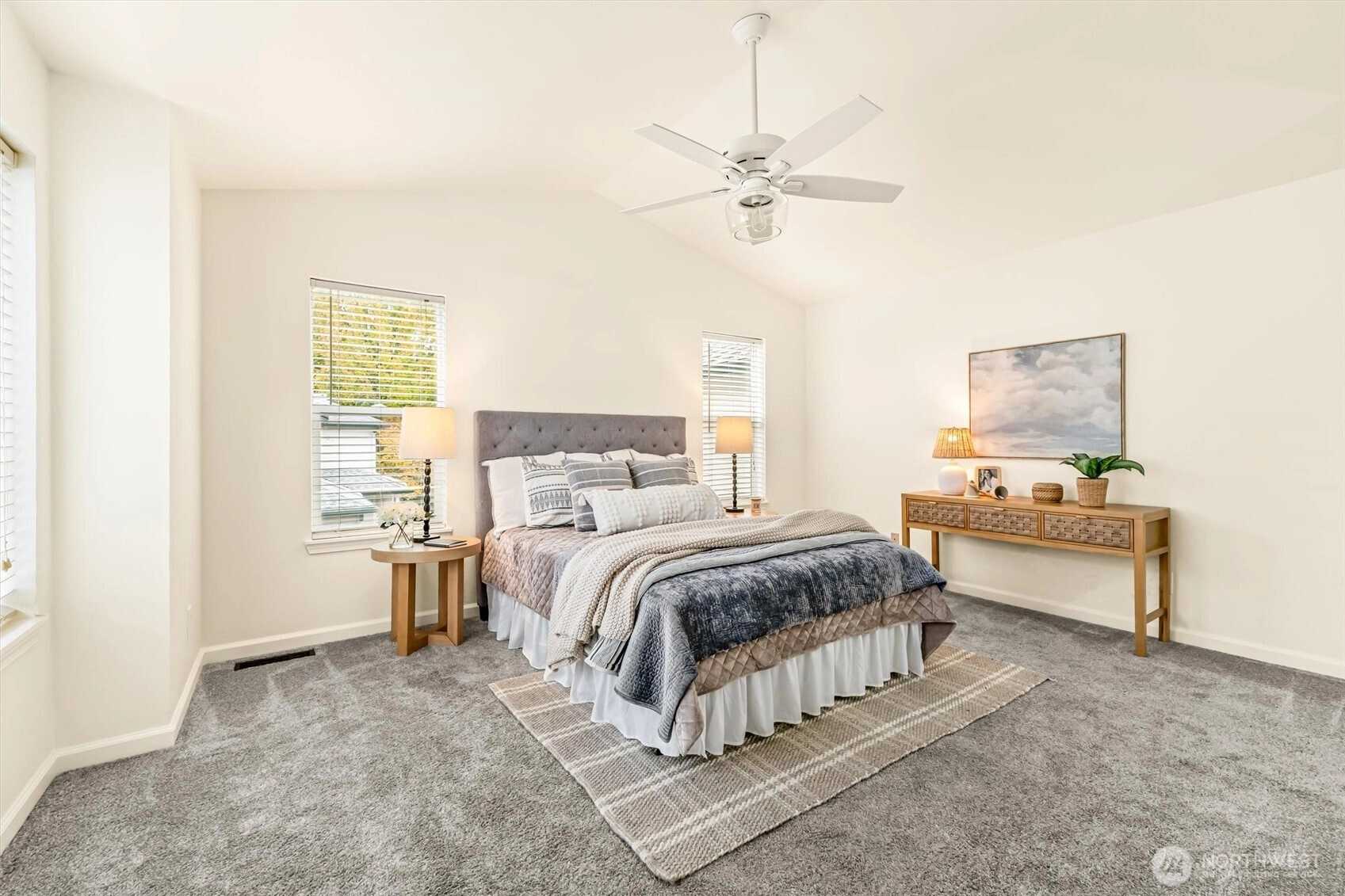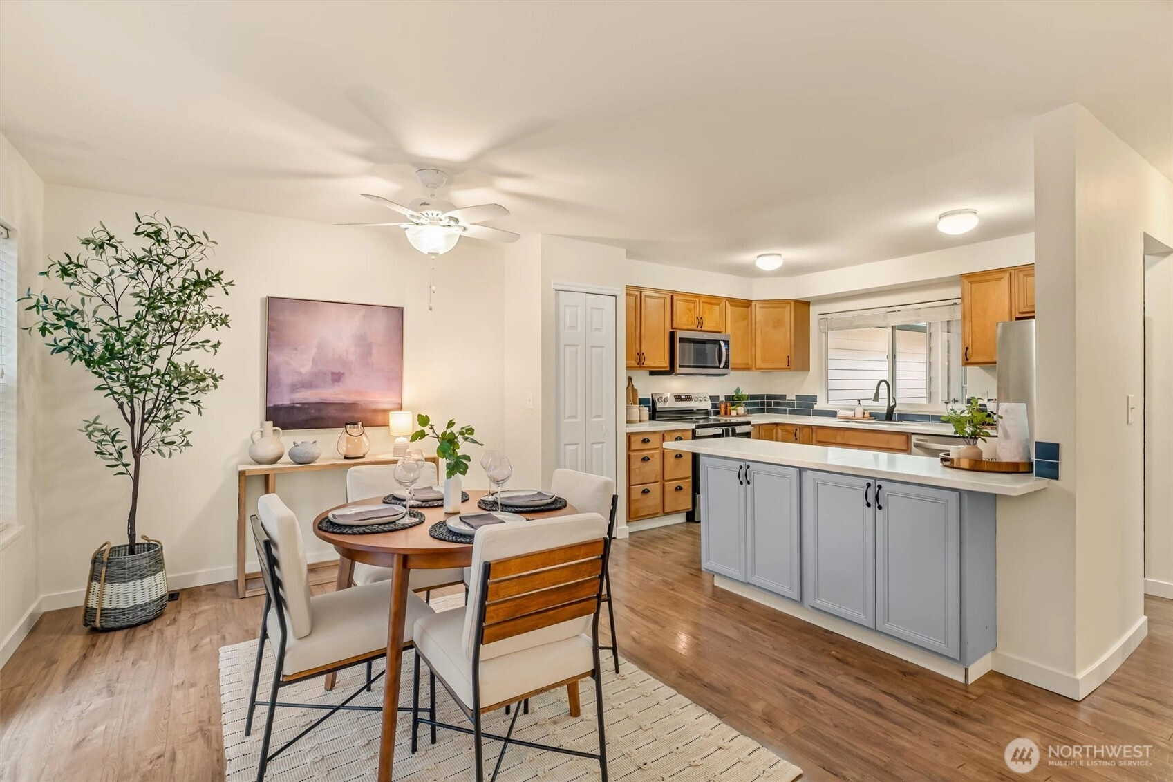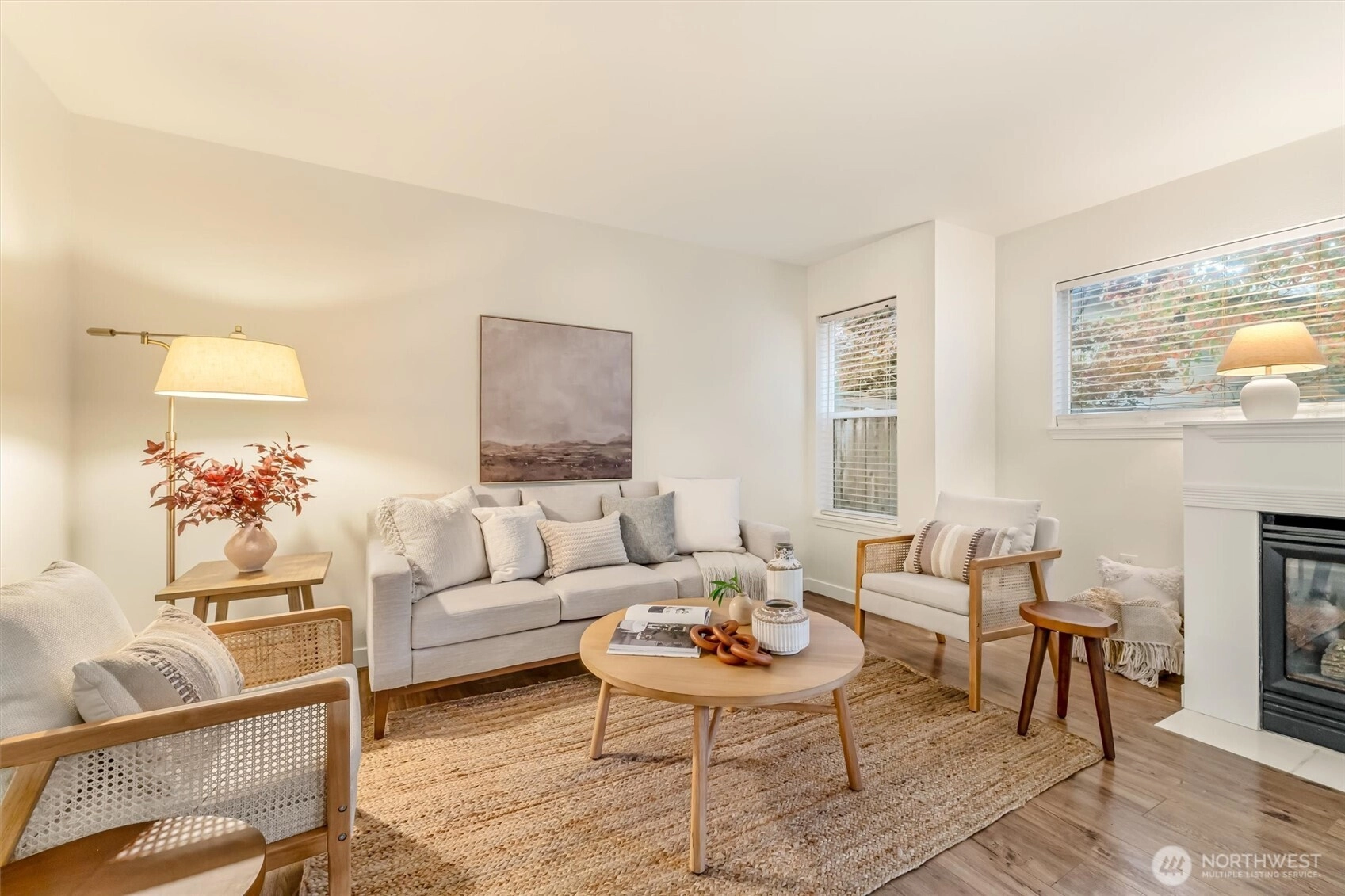 Experience refined living in this beautifully updated + freshly painted 3BR TOWNHOME in desirable Kassie's Way. Open-concept main level features a spacious living room with big windows + gas fp, dining room, and a modern kitchen with counter seating. Upstairs are large bedrooms including a luxurious primary suite with soaring vaulted ceiling, two expansive closets and updated en-suite with double sinks + walk-in shower. Enjoy AIR CONDITIONING (2022) and a private FENCED YARD with extended patio, raised garden bed, storage shed and gate to common lawn with easy access to community sports court, playground and picnic area. Parking for 2 in oversized garage + 2 more in driveway. Prime location near schools, Boeing, SR-99, and I-5. Mukilteo SD.
