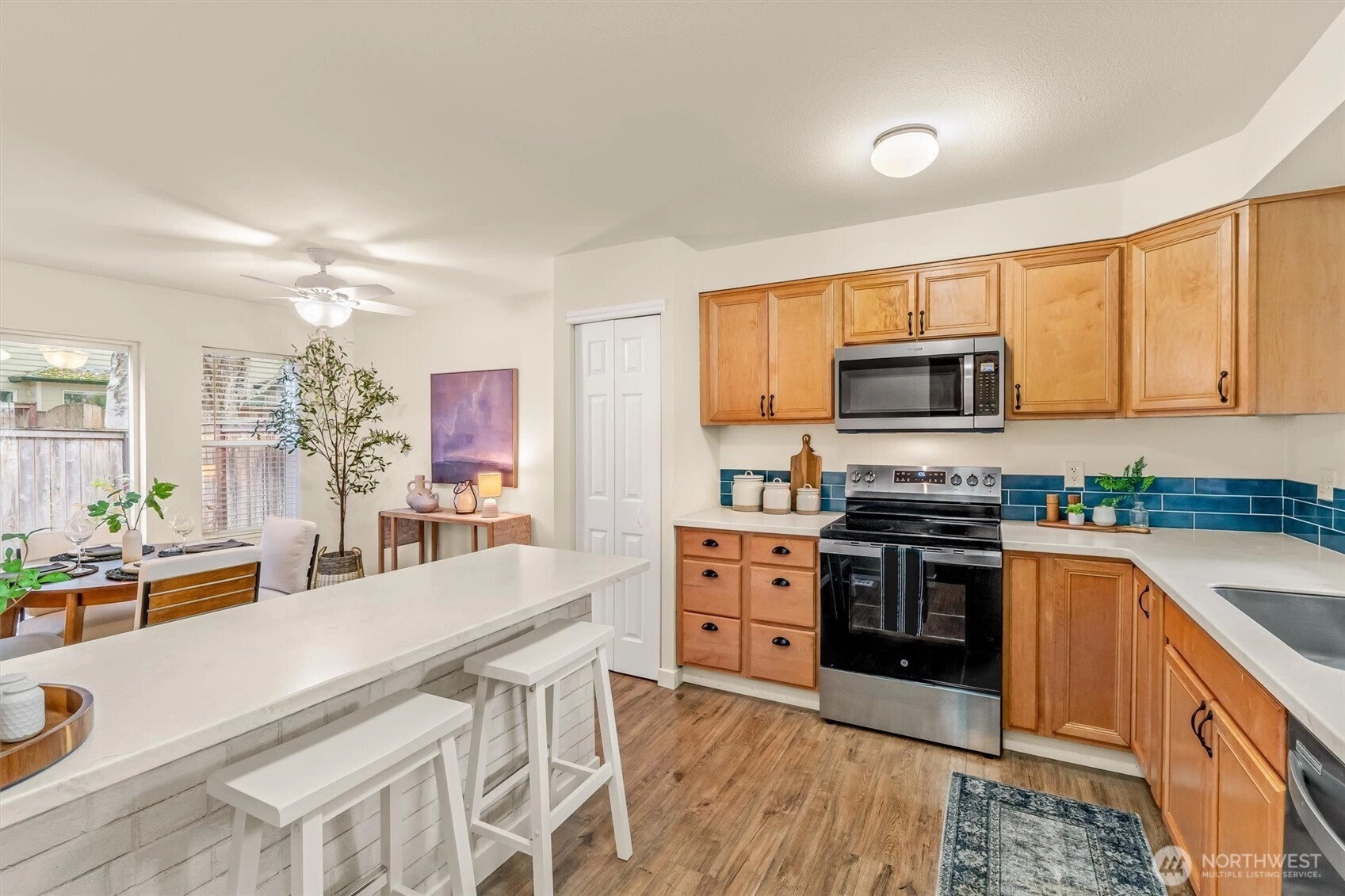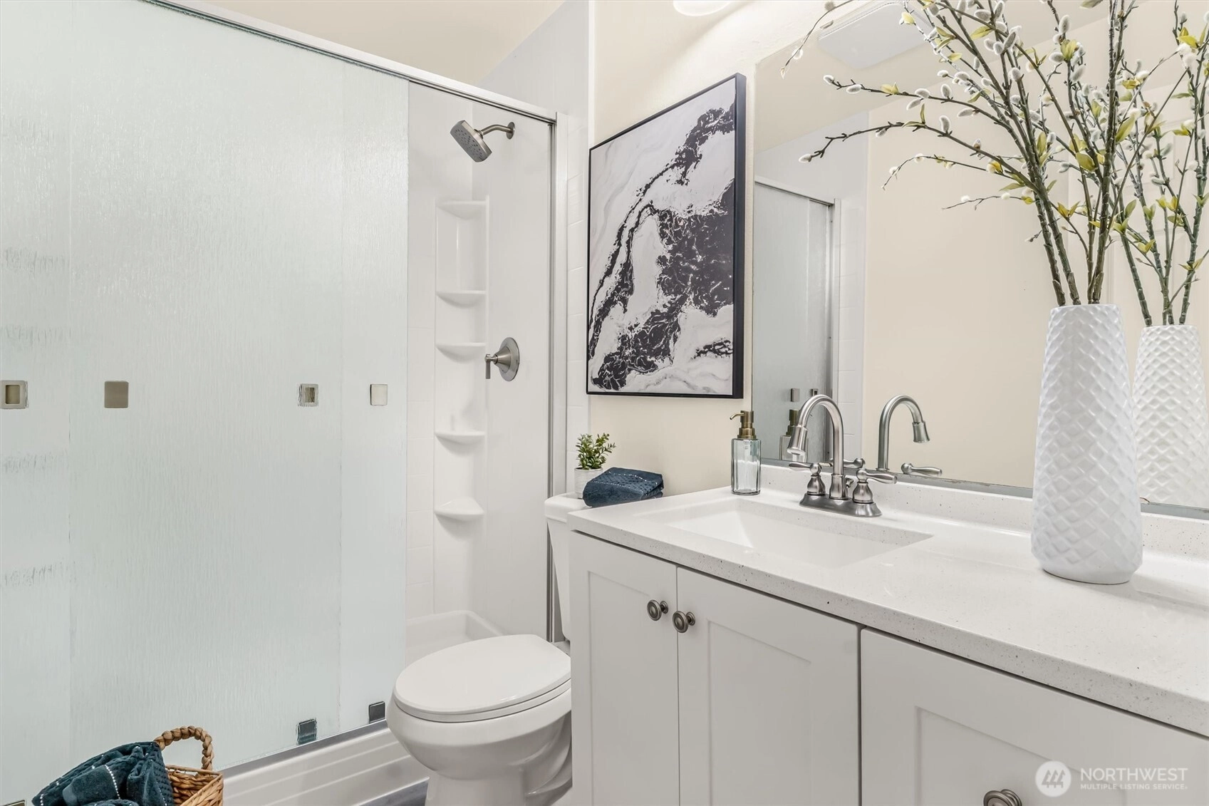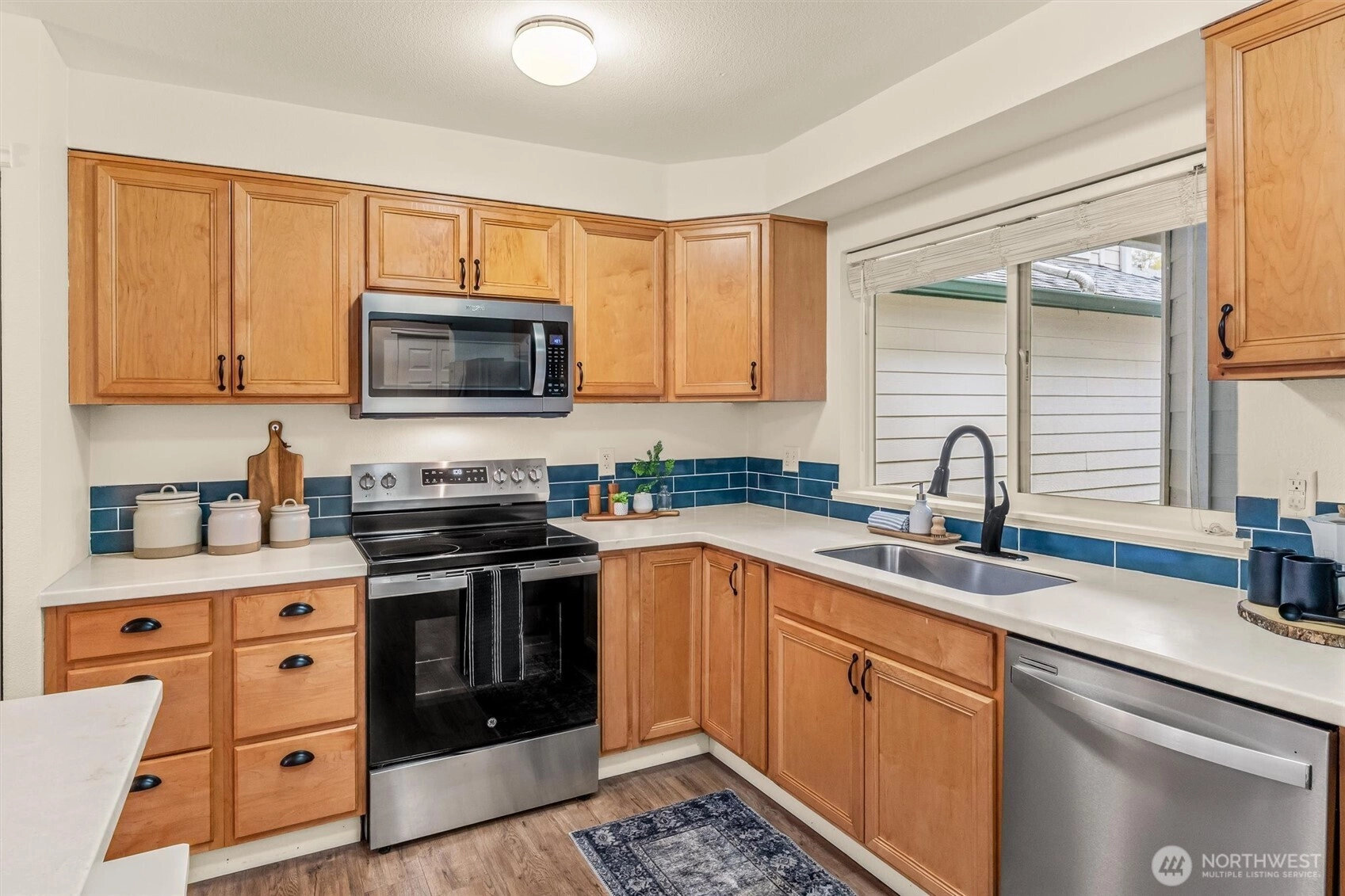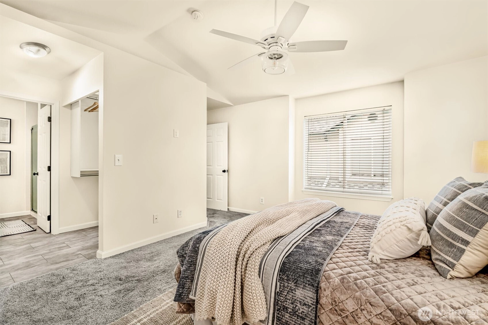 Experience refined living in this beautifully updated + freshly painted 3BR TOWNHOME in desirable Kassie's Way. Open-concept main level features a spacious living room with big windows + gas fp, dining room, and a modern kitchen with counter seating. Upstairs are large bedrooms including a luxurious primary suite with soaring vaulted ceiling, two expansive closets and updated en-suite with double sinks + walk-in shower. Enjoy AIR CONDITIONING (2022) and a private FENCED YARD with extended patio, raised garden bed, storage shed and gate to common lawn with easy access to community sports court, playground and picnic area. Parking for 2 in oversized garage + 2 more in driveway. Prime location near schools, Boeing, SR-99, and I-5. Mukilteo SD.