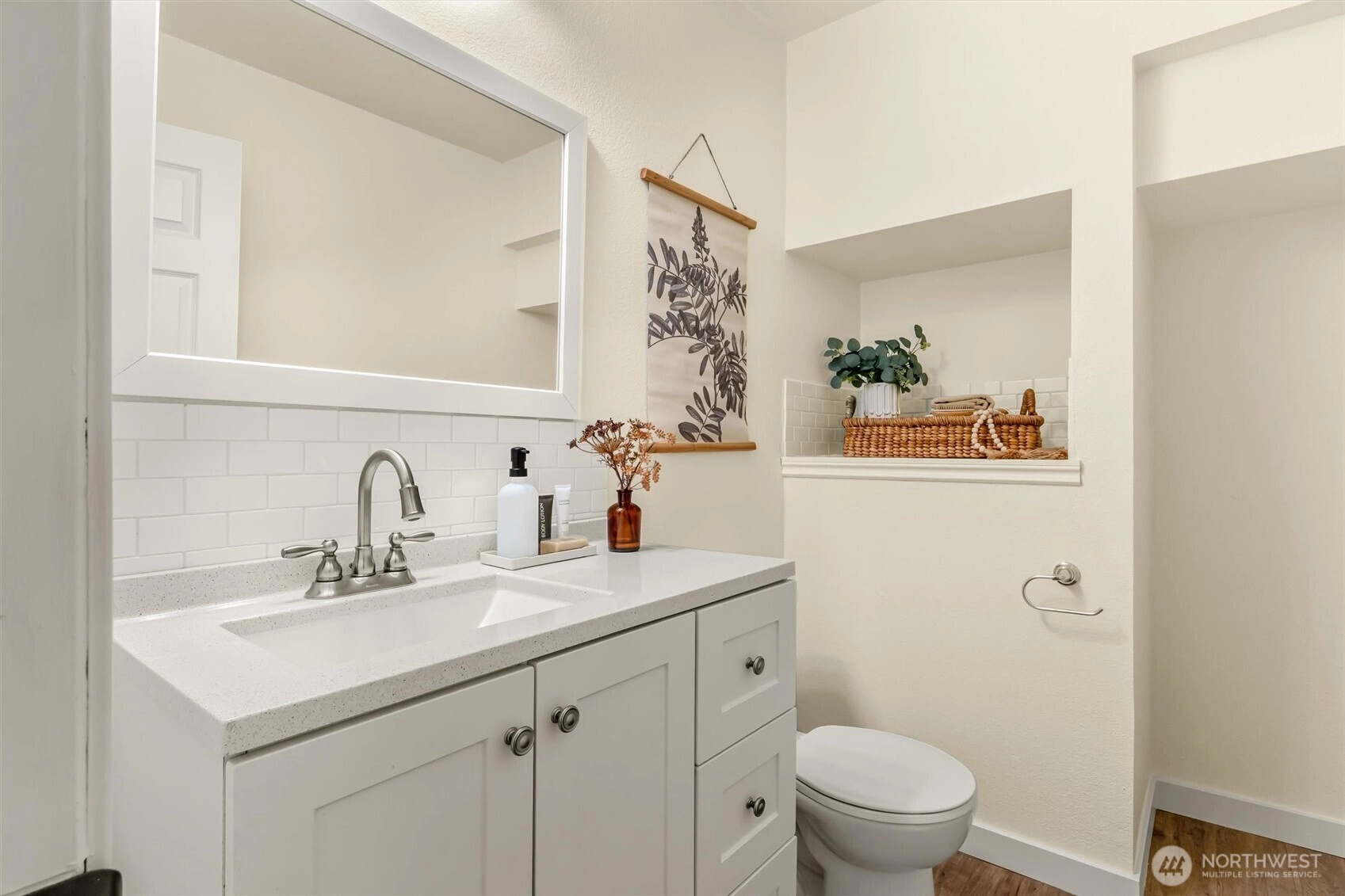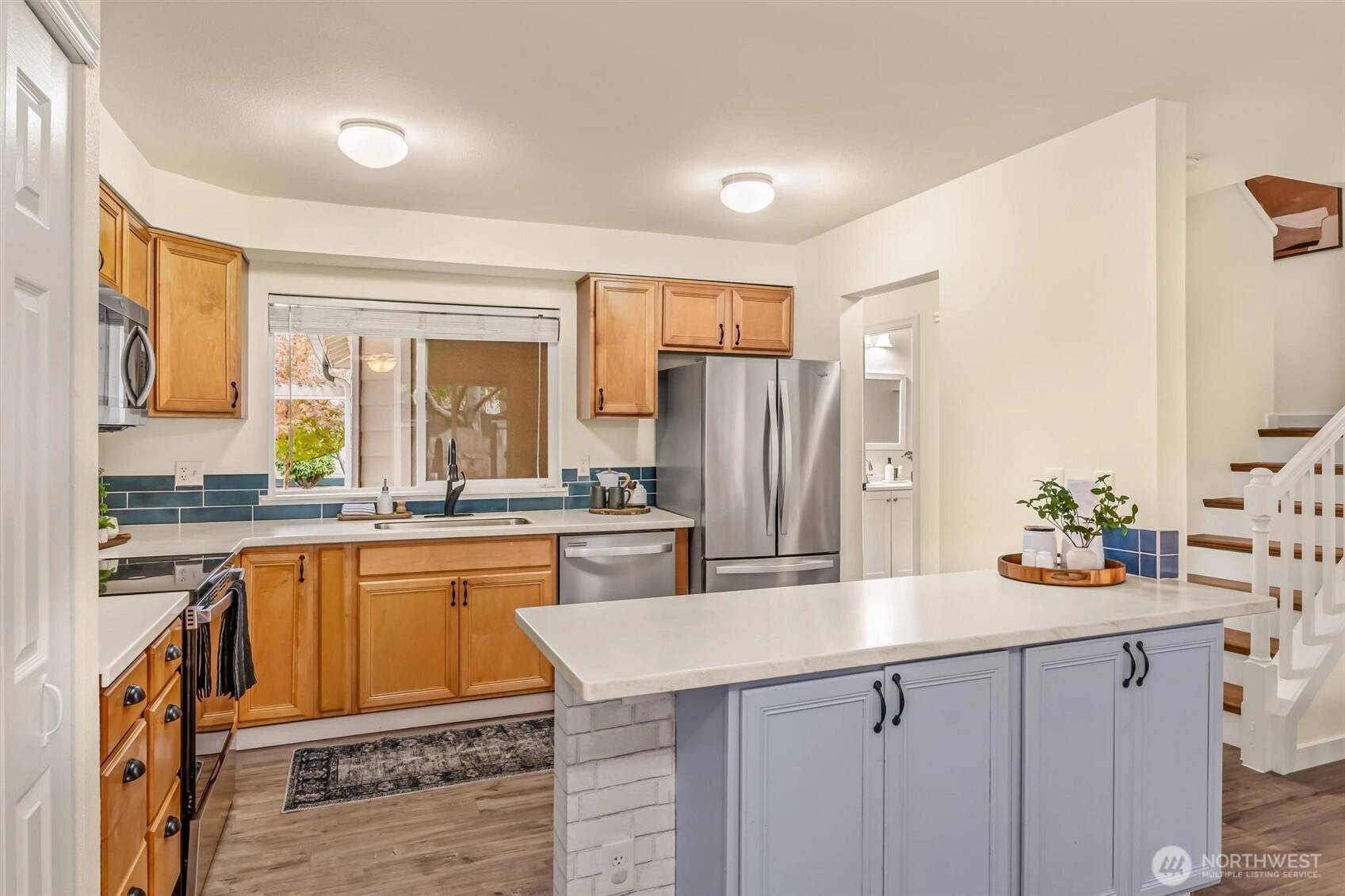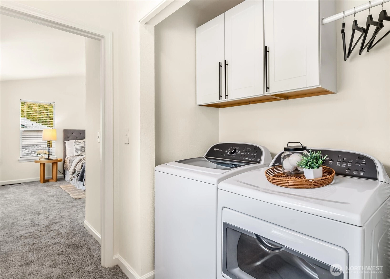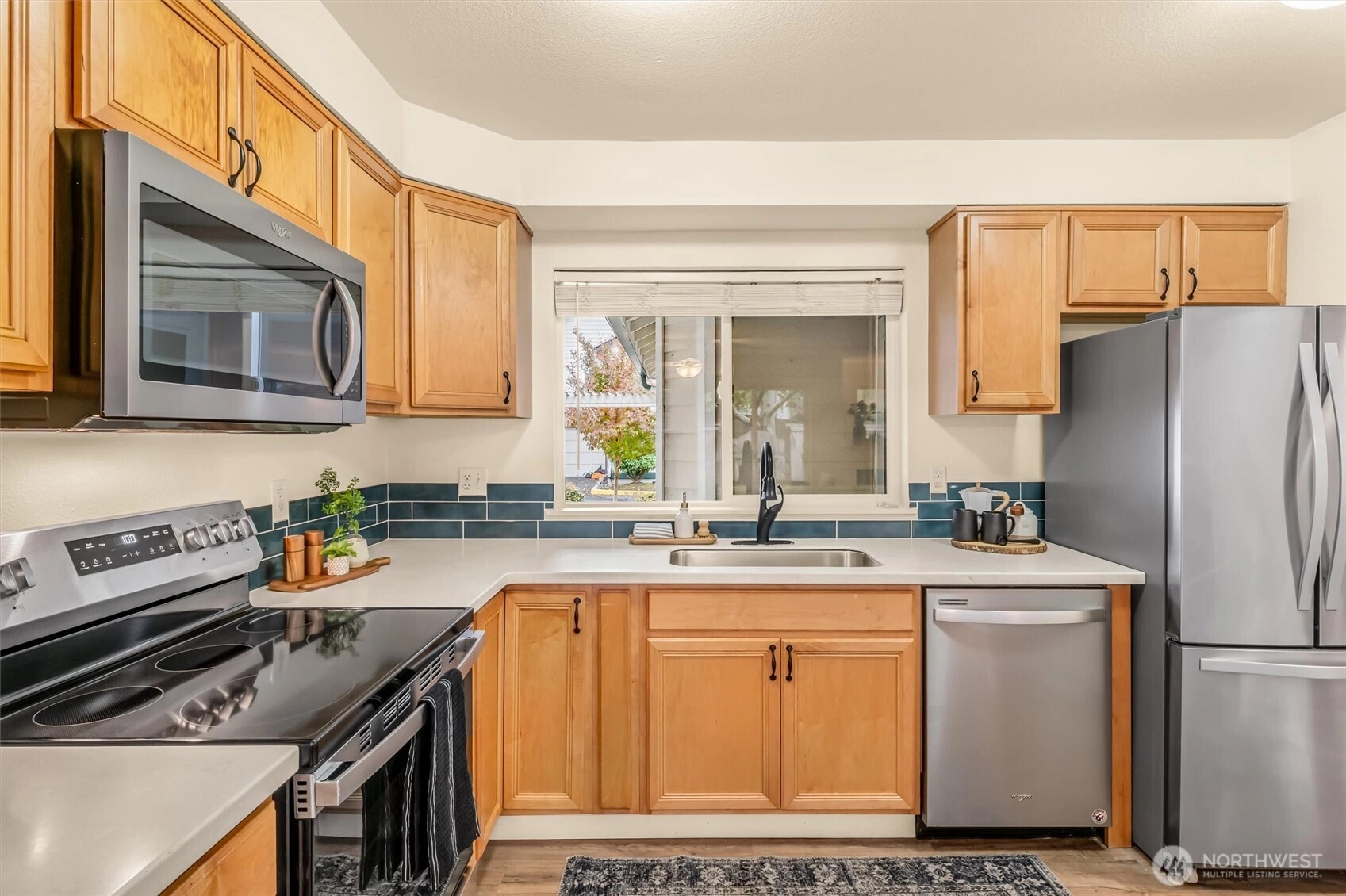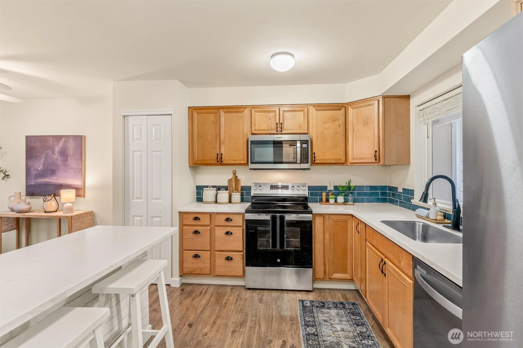 Experience refined living in this beautifully updated + freshly painted 3BR TOWNHOME in desirable Kassie's Way. Open-concept main level features a spacious living room with big windows + gas fp, dining room, and a modern kitchen with counter seating. Upstairs are large bedrooms including a luxurious primary suite with soaring vaulted ceiling, two expansive closets and updated en-suite with double sinks + walk-in shower. Enjoy AIR CONDITIONING (2022) and a private FENCED YARD with extended patio, raised garden bed, storage shed and gate to common lawn with easy access to community sports court, playground and picnic area. Parking for 2 in oversized garage + 2 more in driveway. Prime location near schools, Boeing, SR-99, and I-5. Mukilteo SD.