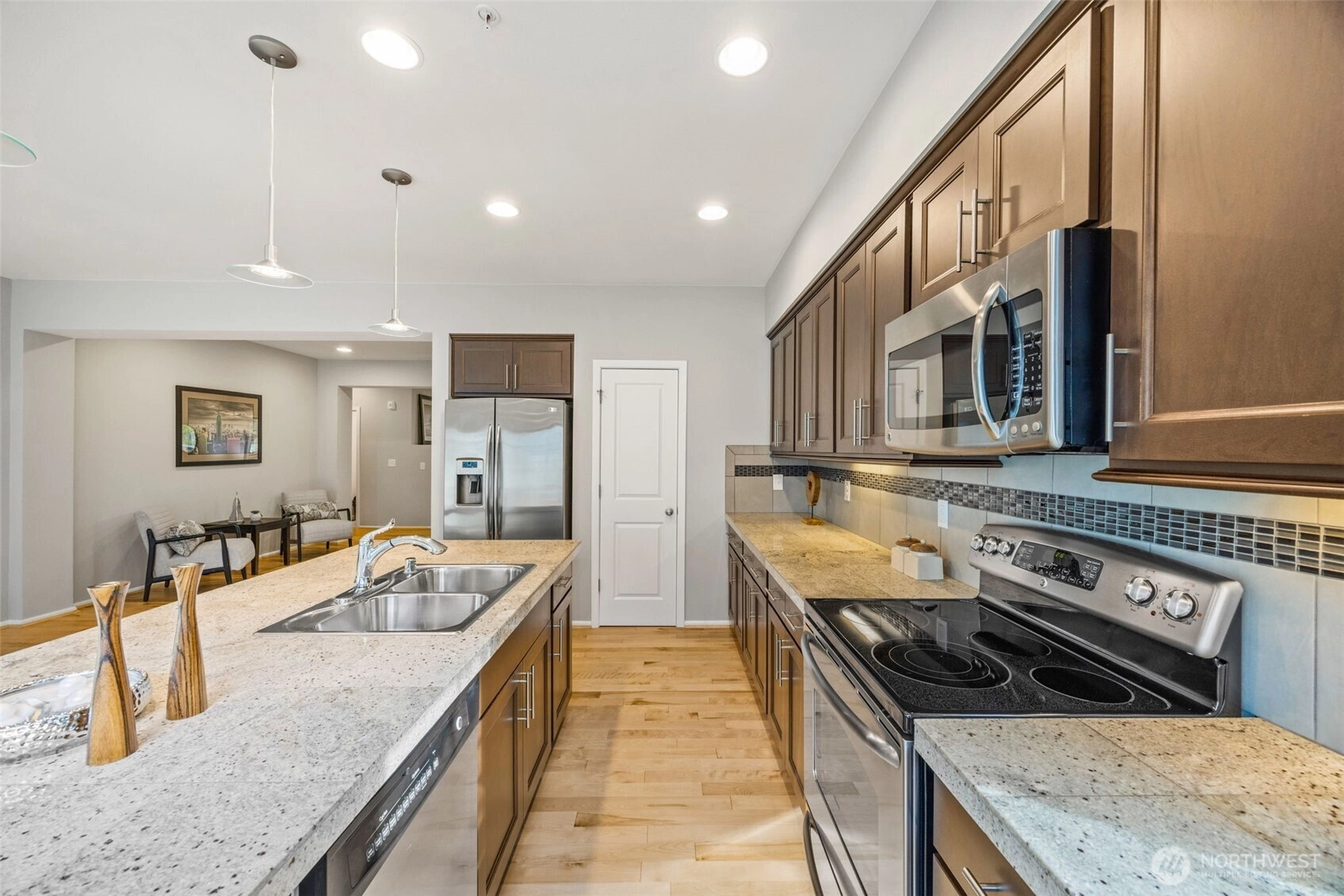 This gorgeous 3 bd 2.5 bth end unit residence in sought after Villas at Mondavio is truly special! Prime location surrounded by beautiful greenbelt & next to Sammamish River Trail path!Steps to Dntn Redmond, Town Center, shopping & dining. EZ commute to MSFT, Meta,Google & Amazon.Spacious & sunlit main level boasts beautiful maple hardwood floors,gourmet chef's kitchen w/endless cabinetry,granite countertops,tile backsplash,granite island,breakfast bar,ss appliances & pantry.Large living room w/cozy fireplace is perfect for those cold Winter days!Upstairs Owner's suite w/spa-style bth,dbl vanity,granite countertop,tile floor & WI tile shower.2 addl bds & 2nd bth up!Downstairs bonus/flex/media rm! 2 car garage. Pre-inspected & home warranty!