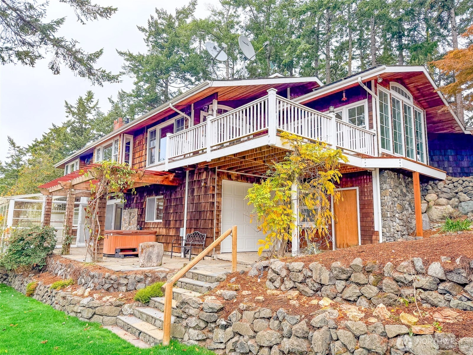 Welcome Home! Spectacular, extremely private & unique home nestled on .48 ac of Discovery Bay, Olympics views & beyond! Spacious foyer to the expansive living area with engineered Brazilian Cherry flooring & fireplace with propane insert. Full size dining w/double doors to the deck looking out to the views as well as the gourmet kitchen w/lovely breakfast "room" all glassed. Primary bedrm w/free standing propane FP, gorgeous bath w/walk-in shower and oversized tub & closet. Lower level enjoys the 2nd bed, 3/4 bath and 1/2 bath, office and wet bar and another full size fireplace and propane insert. Lg greenhouse! 44 solar panels for efficiency, 22.5KW generator. Full renovation in 2025!! The property also enjoys an electric gate for privacy.
