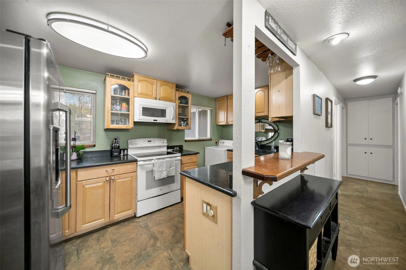 Welcome to this beautifully updated 2-bedroom, 1-bathroom home located in the heart of Bridgeport, Washington. This charming property features a sunken living room with direct access to the deck, a dining area with a ceiling fan, and a modern kitchen with a breakfast bar, perfect for everyday living and entertaining. The primary bedroom offers abundant storage space and a picturesque bay window that fills the room with natural light. An upper-level bonus room offers flexible storage space. Recent updates include new tile flooring and carpet throughout, interior and exterior paint, ensuring a clean, move-in-ready home.