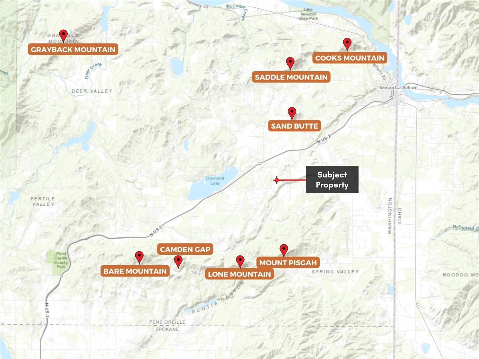 20 acres of forested land just outside Newport near Diamond Lake. Situated at the end of a private lane offering exceptional privacy & seclusion. Property is primarily wooded w/ Douglas Fir & Ponderosa Pine. Elevation ranges from 2,300 to 2,400 ft. USDA soil map shows mostly gravelly silt loam & sandy loam soils — both which should be suitable for a septic system. A private well is needed for development, & electric is on Moonlight Lane. No wetlands. About 1 mile from US HWY 2, 10 mins from Newport, & an hour north of Spokane. Lots of recreational activities nearby for hiking, fishing, & boating. Plus this property offers great hunting for bear, bobcat, elk, moose, and both white-tailed & mule deer. Existing road & trail system in place.