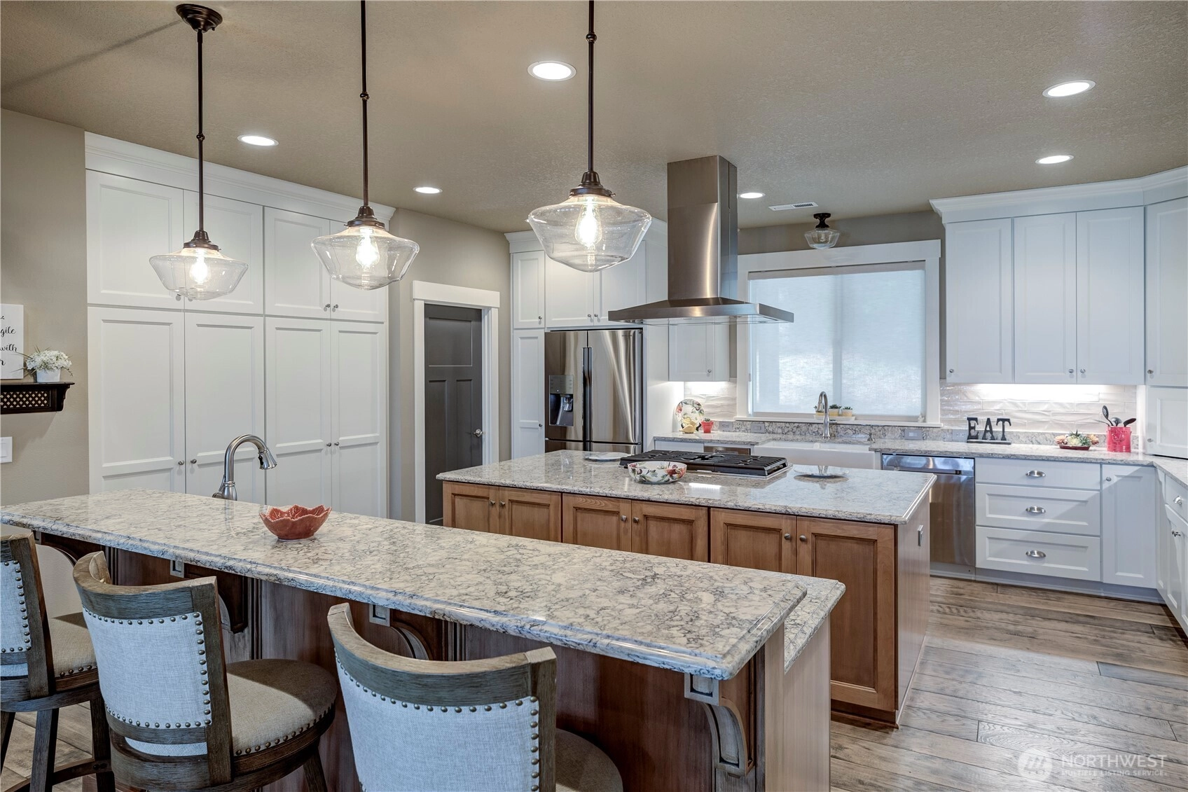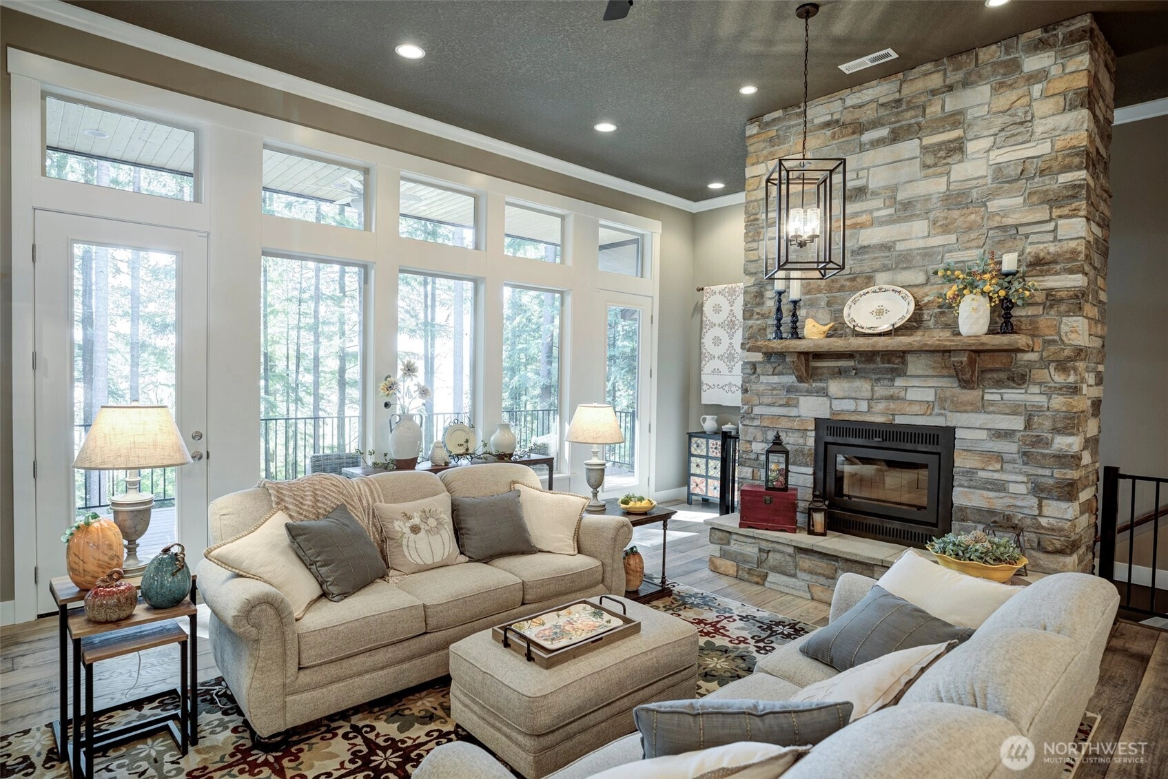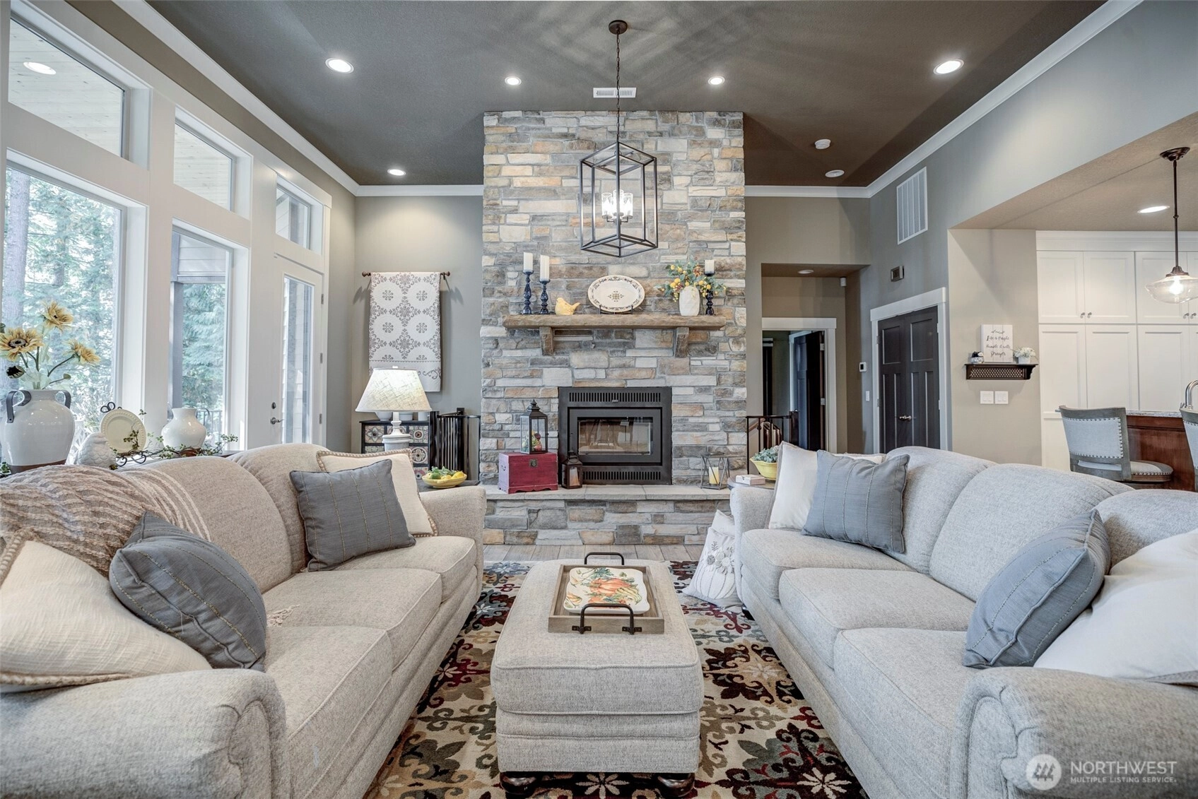 Discover lakeside living at its finest in this immaculate 2017 home with stunning Silver Lake and mountain views. Designed for comfort and style, the gourmet kitchen boasts granite counters, ceiling-high cabinets, butler pantries, double ovens, built-in microwave, 5-burner gas stove, and two oversized islands. Enjoy cozy evenings in front of 1 of 3 fireplaces. The spacious primary retreat overlooks the lake with spa bath; double sinks, soaking tub, and walk-in shower. A fully finished walk-out basement offers added living space with sliding doors, carpet, and bath off every bedroom. Built-in vacuum system. Outside is a quiet wooded setting with a huge 4-bay shop with 1 lrg RV bay & metal roof. A boater's dream -This home has it all!