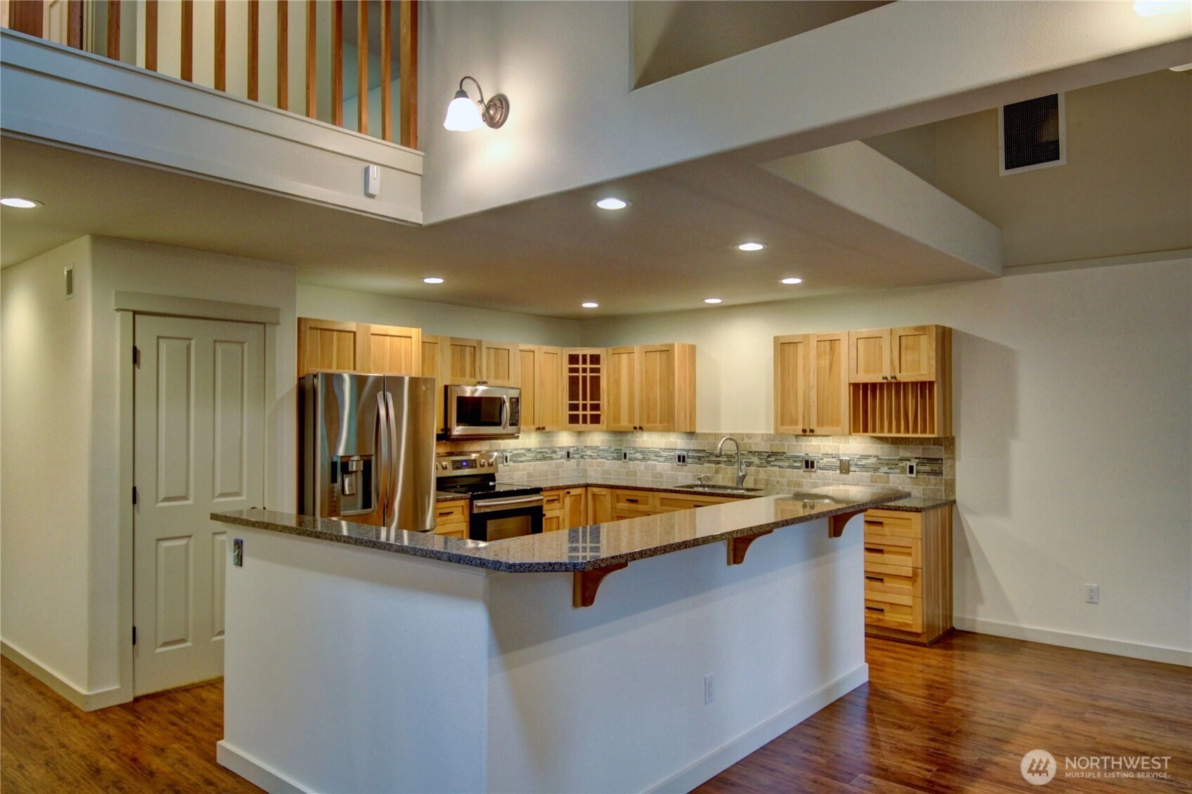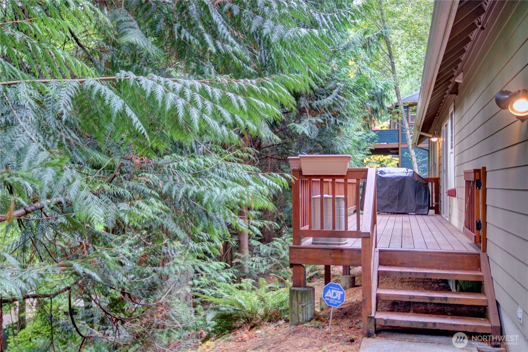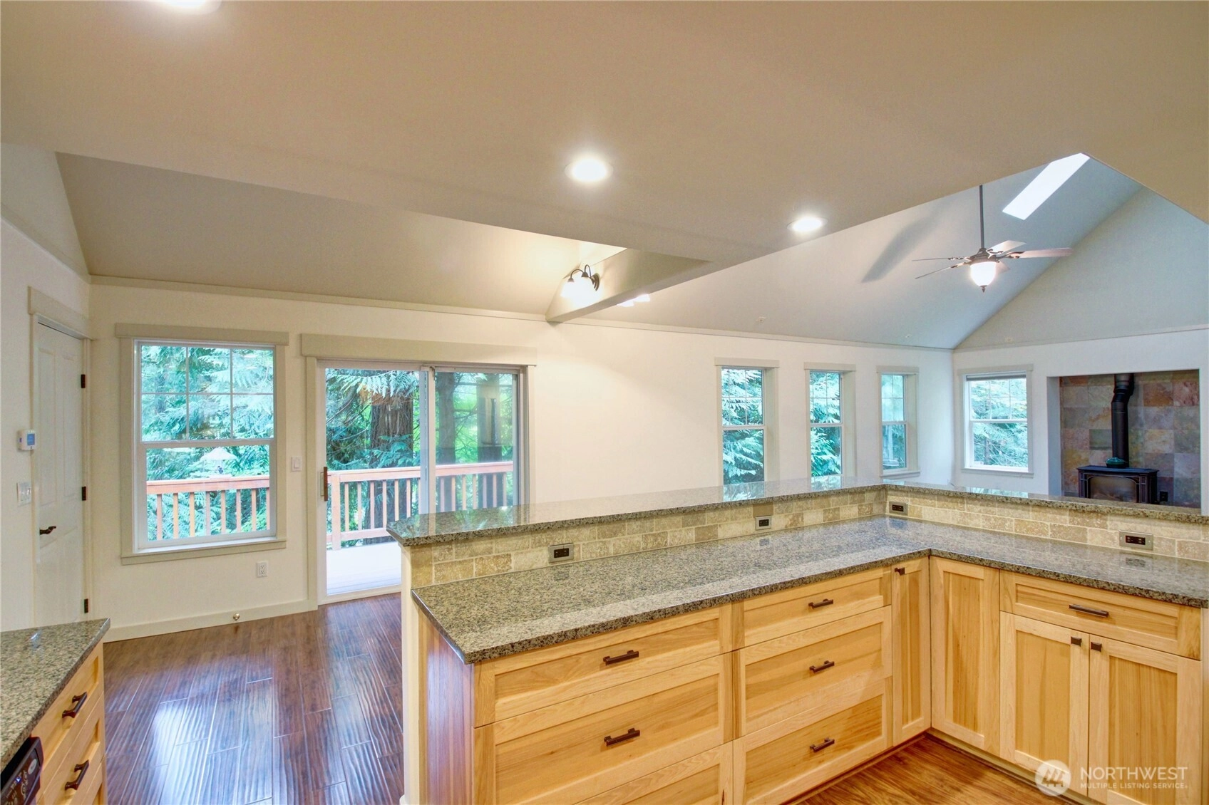 Enjoy loads of natural light and an easy access entry into this custom built 3-bedroom home - with office. Built in 2001, the home is located on a large double lot, has an open floor plan, and the primary bedroom & office are on the main level. The open kitchen has stainless steel appliances, walk-in pantry, slab granite counter tops, and a large island - which is wonderful for entertaining! The great room area has soaring ceilings, free standing gas stove, and access to the private rear deck. The primary bedroom has updated full bath (separate bath and shower) and walk-in closet. Updated heating / cooling system. A large 2-car garage and double lot complete the home. Nicely landscaped property.