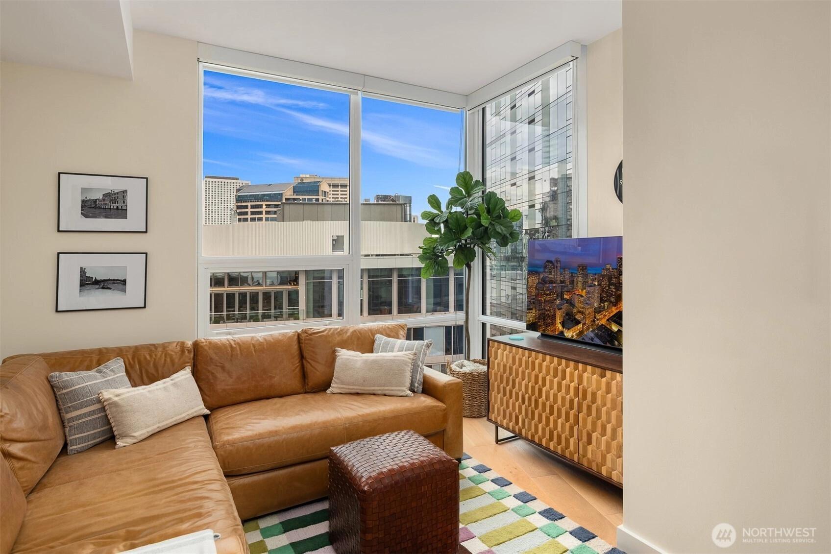 Fully furnished and turnkey, this stylish one-bedroom residence at The Emerald offers effortless in-city living just one block from Pike Place Market and steps from the revitalized waterfront. Perched on the 16th floor, it showcases sweeping city views through floor-to-ceiling windows. Designed for modern comfort, it features engineered hardwood floors, a sleek kitchen, in-unit washer/dryer, and central A/C. Enjoy premier amenities including 24-hour concierge, high-speed internet, fitness center, pet relief and grooming areas, plus a spectacular rooftop deck perfect for barbecuing, entertaining, or soaking in the Seattle skyline. A refined, low-maintenance city retreat in the heart of downtown.