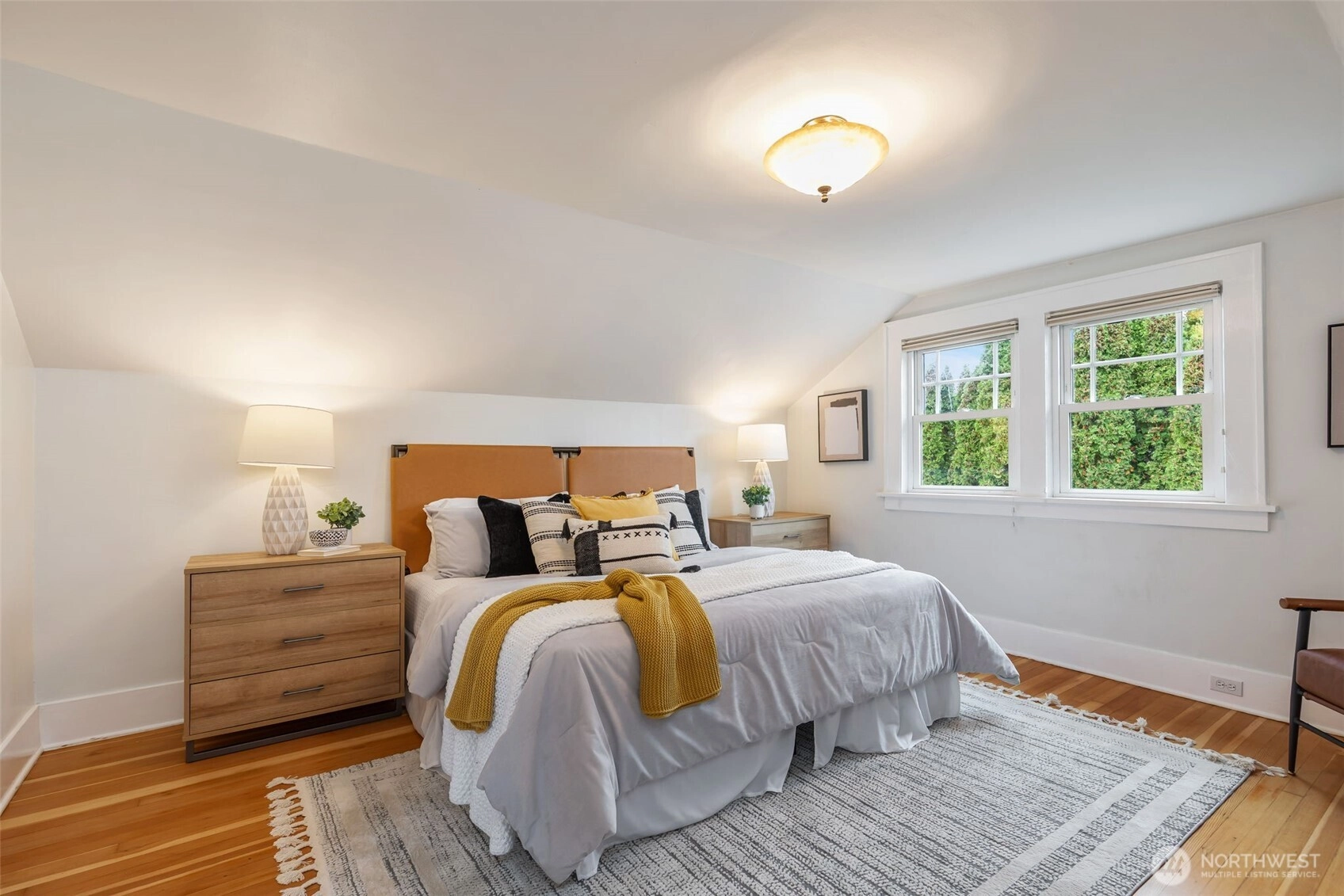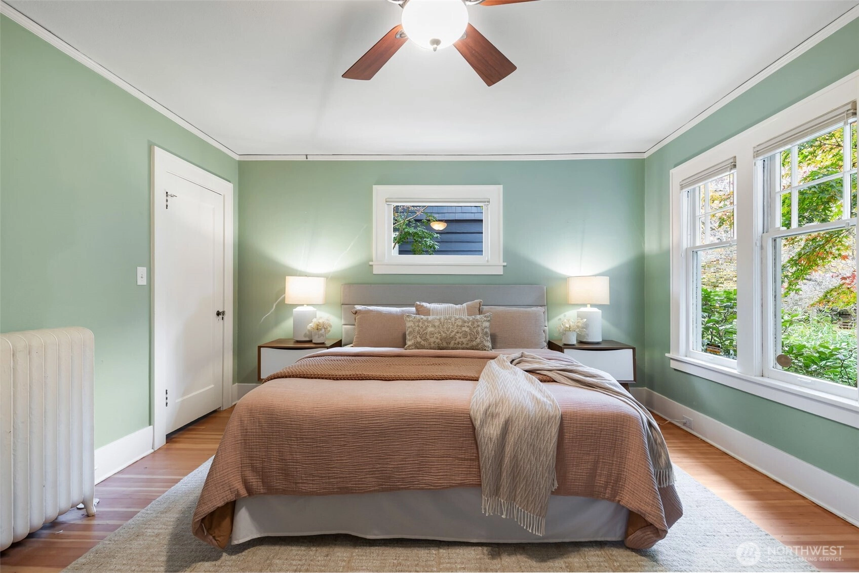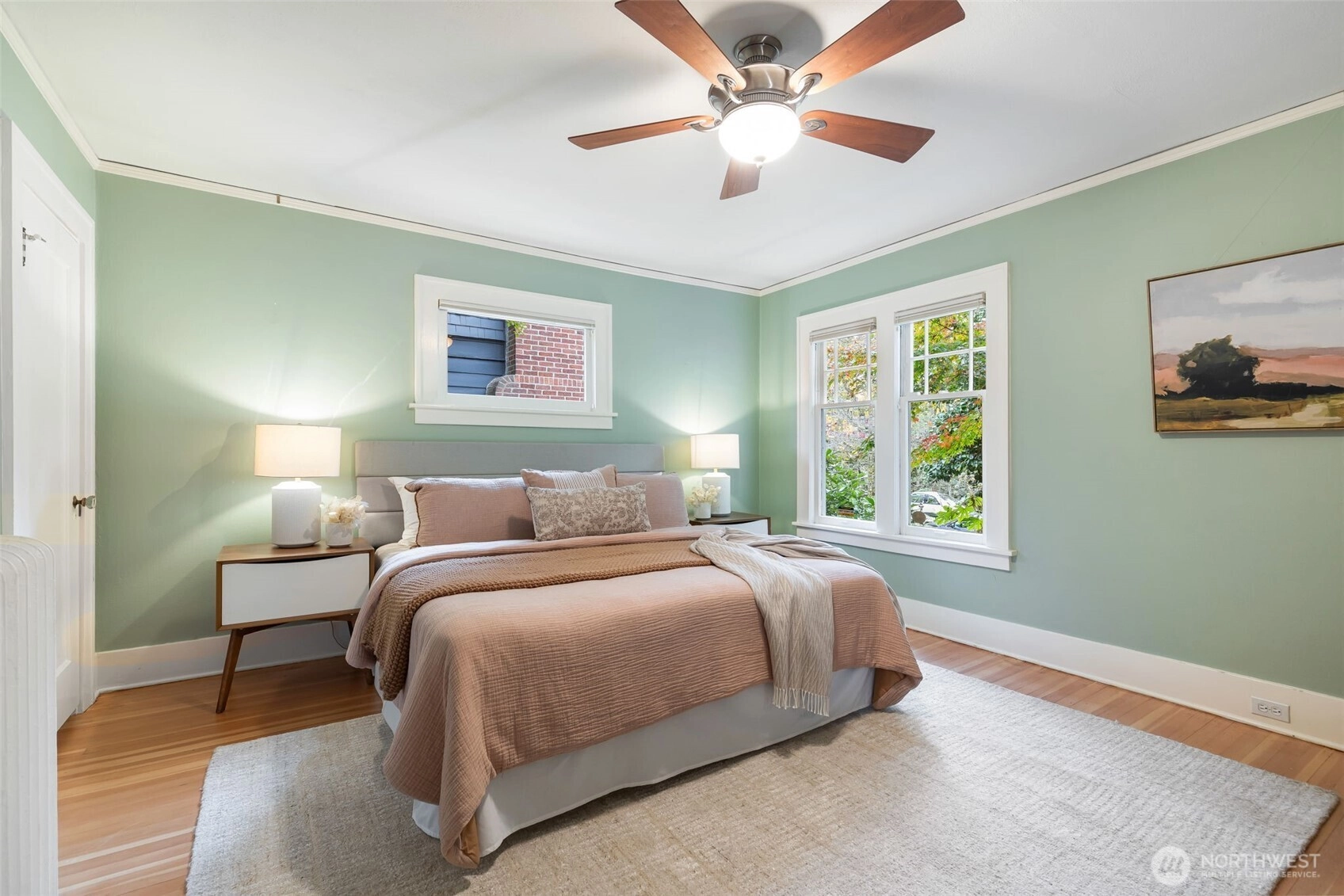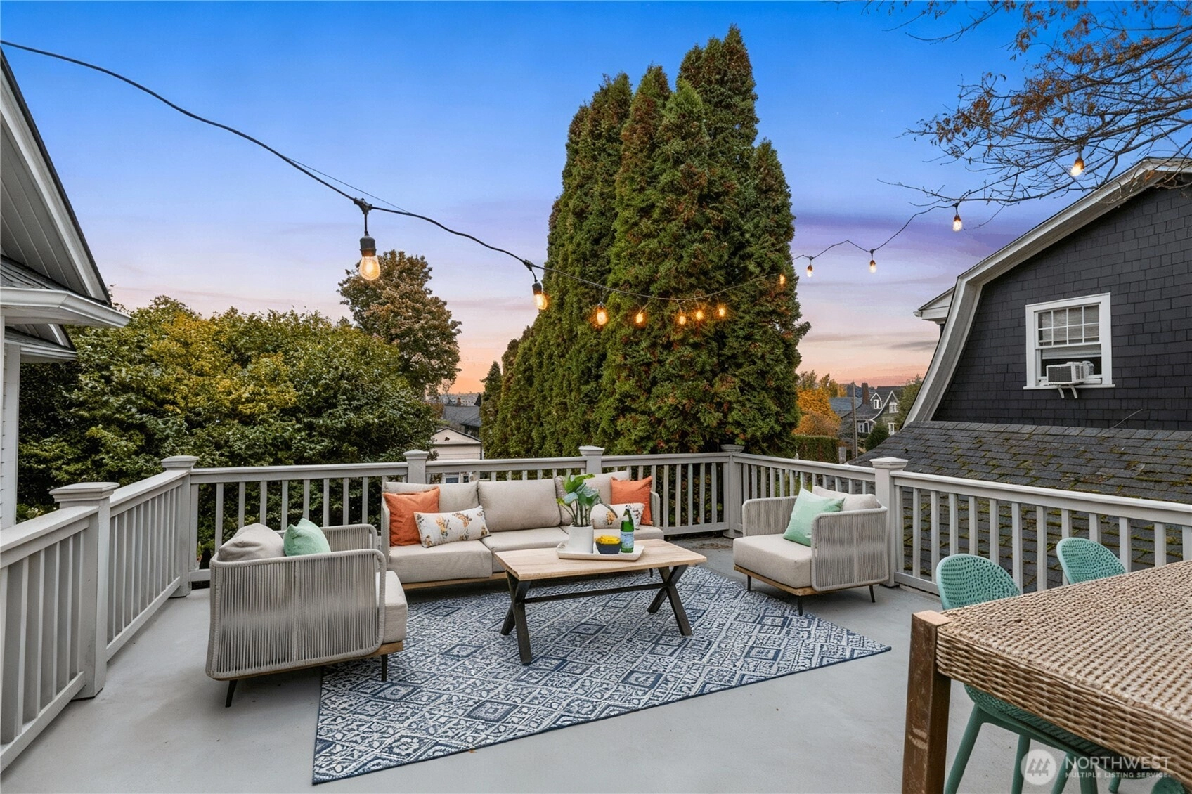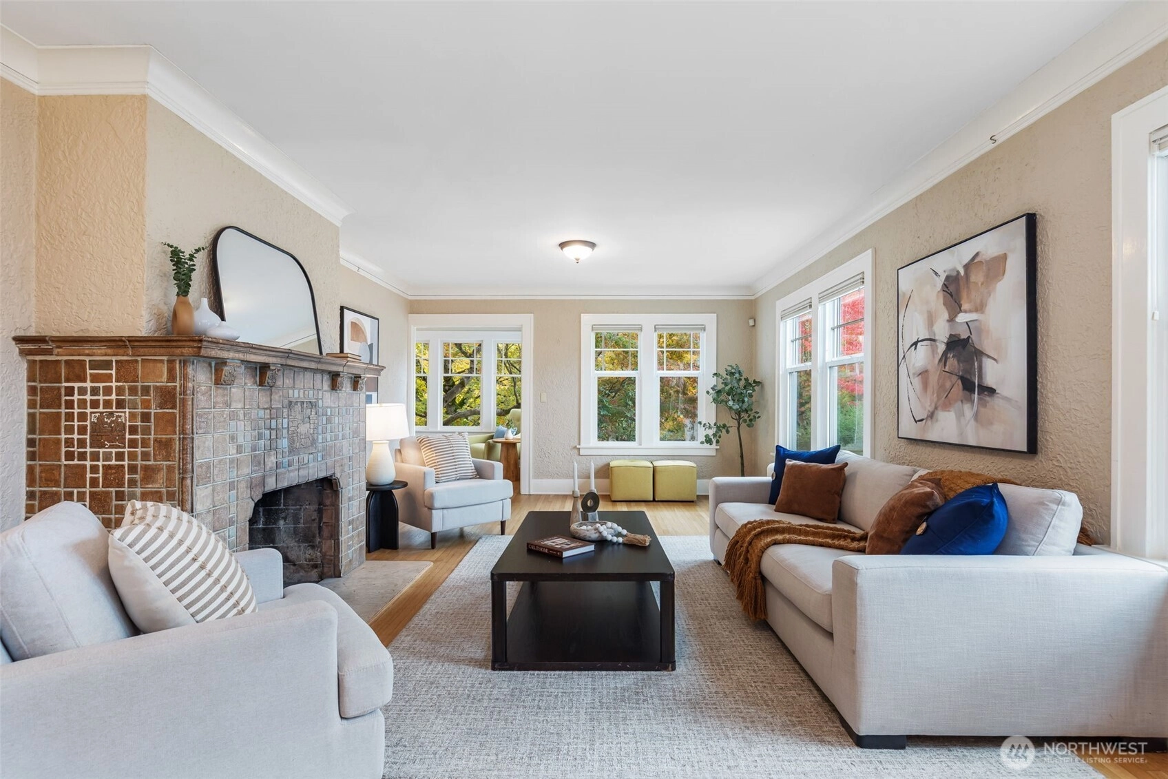 Set on the corner of an idyllic tree lined street in Mt Baker, this 5 bedroom house (all bedrooms above grade) captures the charm of 1922 and the convenience of today surrounded by landscaped gardens. Big south facing windows bathe the living and formal dining rooms with natural light. High ceilings, refinished hardwoods, picture rails, and a Batchelder fireplace showcased on the main floor with two spacious bedrooms and a beautifully remodeled large bathroom. Kitchen has been updated with easy access to the garage and huge entertainment deck. 3 bedrooms, huge closets, a spa inspired bath, plus an additional cozy central living space upstairs with Mt Rainier views. Basement has a finished rec room and tons of extra storage. Updated systems!