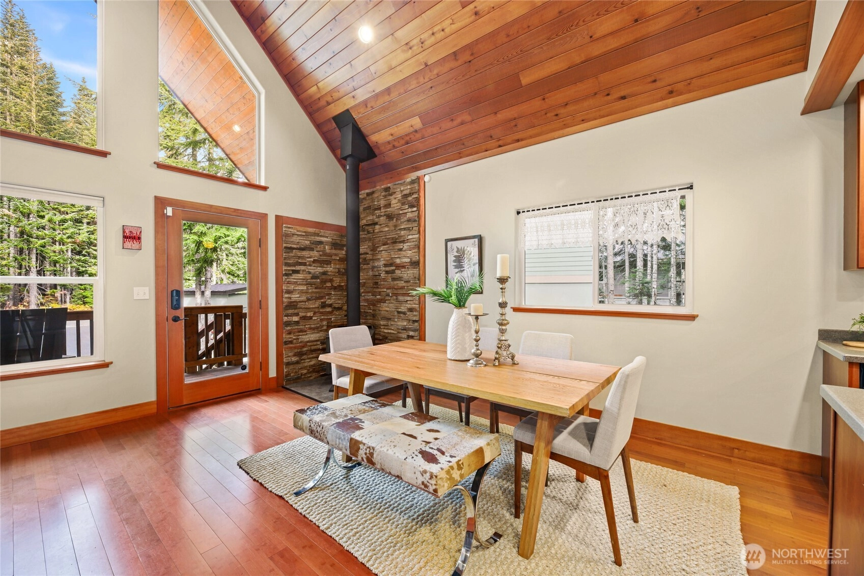 Year-round mtn living, second home or investment property situated on a private road tucked away in a secluded neighborhood of Snoqualmie Pass. Close to slopes and amenities; far enough away to feel like you are truly in the mountains. Tongue and groove wood ceilings accent the massive beams. A wall of windows frames a forested view. Open concept main level with modern kitchen and stainless steel appliances. Thomasville cherrywood cabinets in kitchen and bathrooms. Solid wood doors and two bedroom closets with Thomasville shelving. Lofted master bedroom suite with large modern bathroom with both a designer bathtub and two person European type shower. Private decks on the front and back. Listen to the birds, gaze at the snow covered trees.