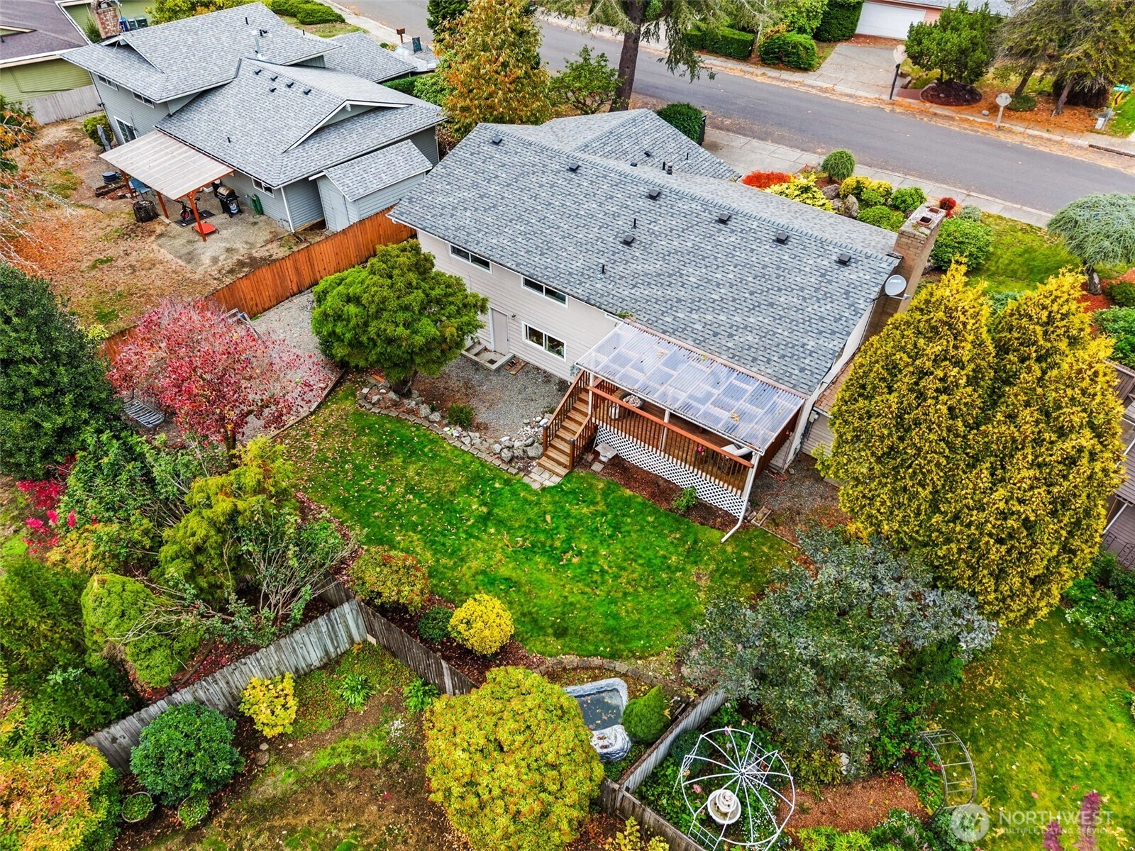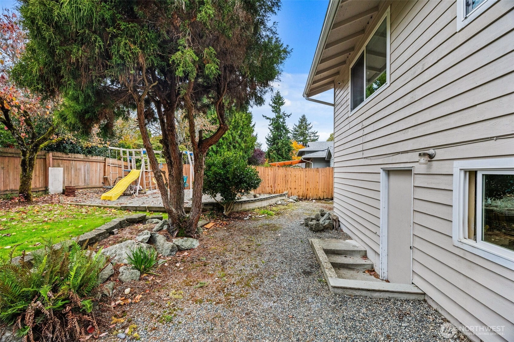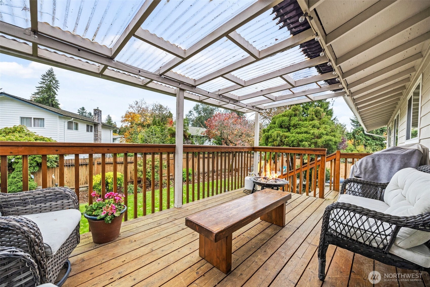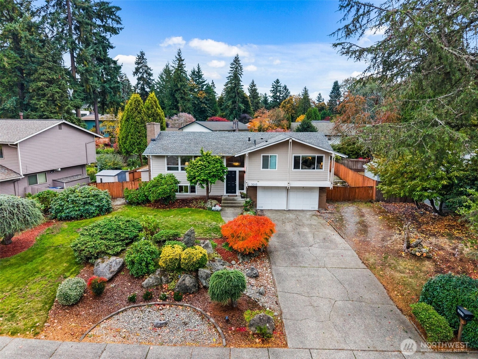 Step inside and feel instantly at home! The cozy front room with a wood-burning fireplace sets the tone for warm, relaxed evenings. The open kitchen and living area create an ideal space for entertaining, with an island, eating space, and beautiful hardwood floors. Enjoy year-round outdoor living on the covered deck with your gas fire pit—perfect for morning coffee or rainy PNW nights. Upstairs features three bedrooms and the main living area, while the lower level offers an additional bedroom, spacious rec room, and a utility room. Beautiful, mature landscaping enhances the front of the home, adding curb appeal and charm. A fenced yard provides space for play or pets, and a long, flat driveway with double side parking plus small RV space.