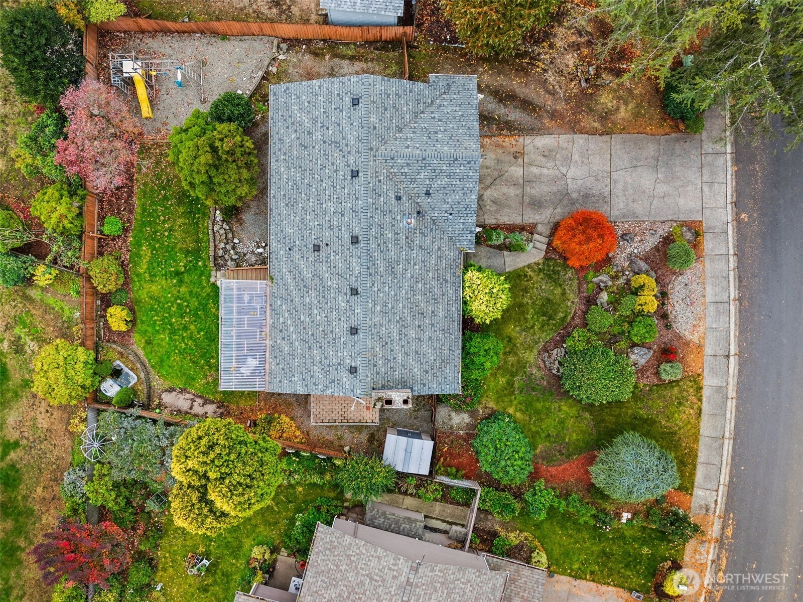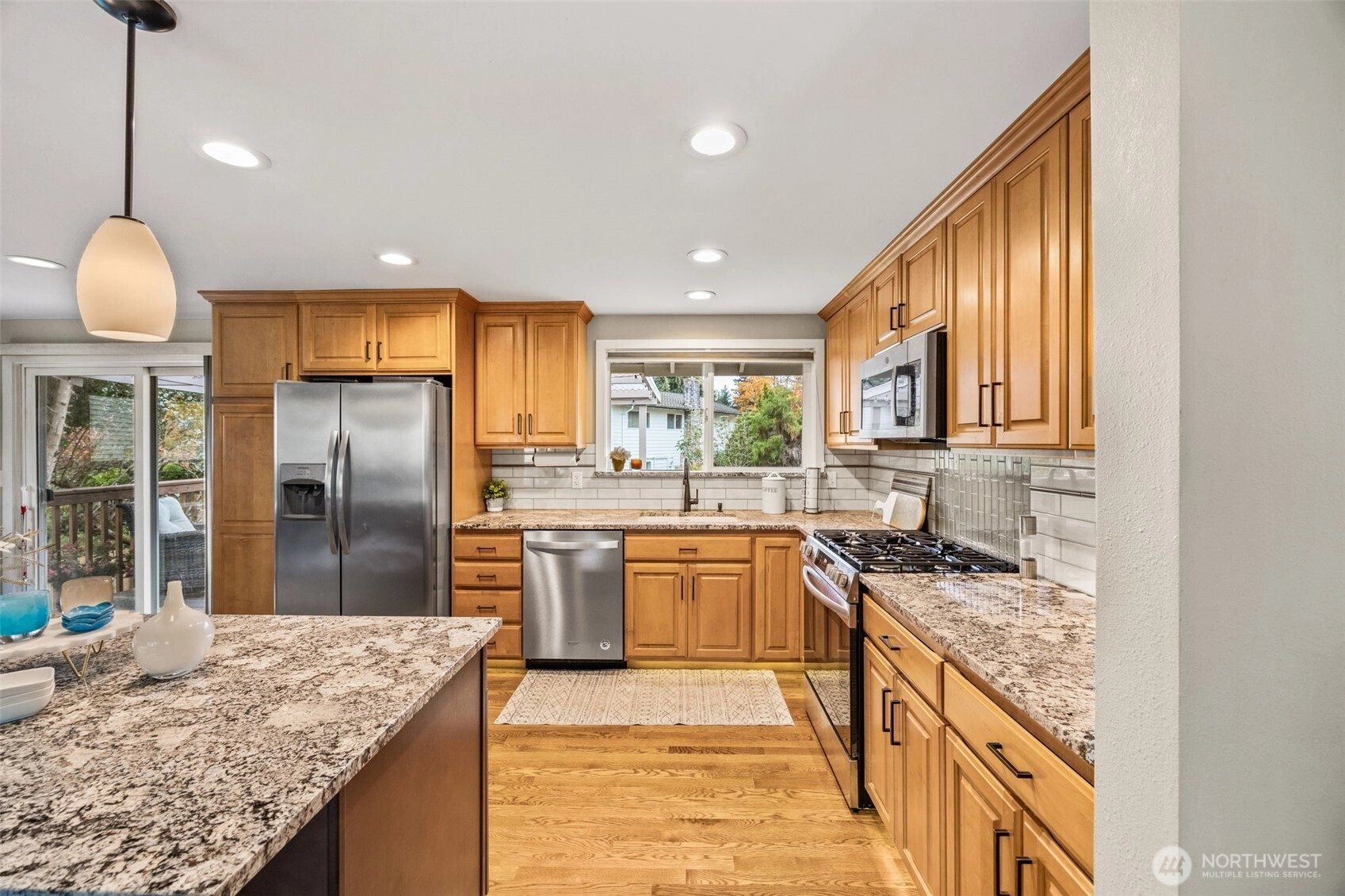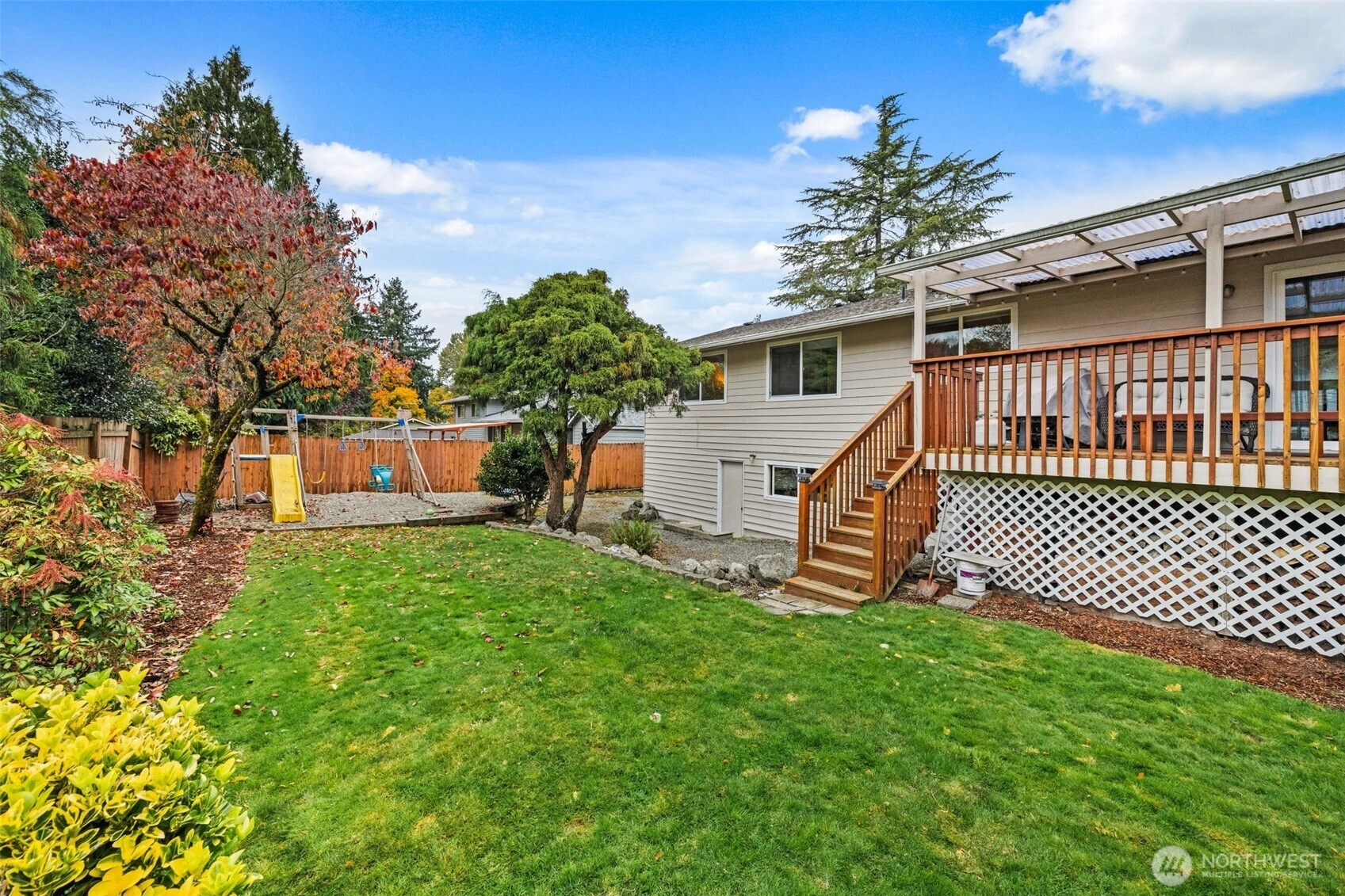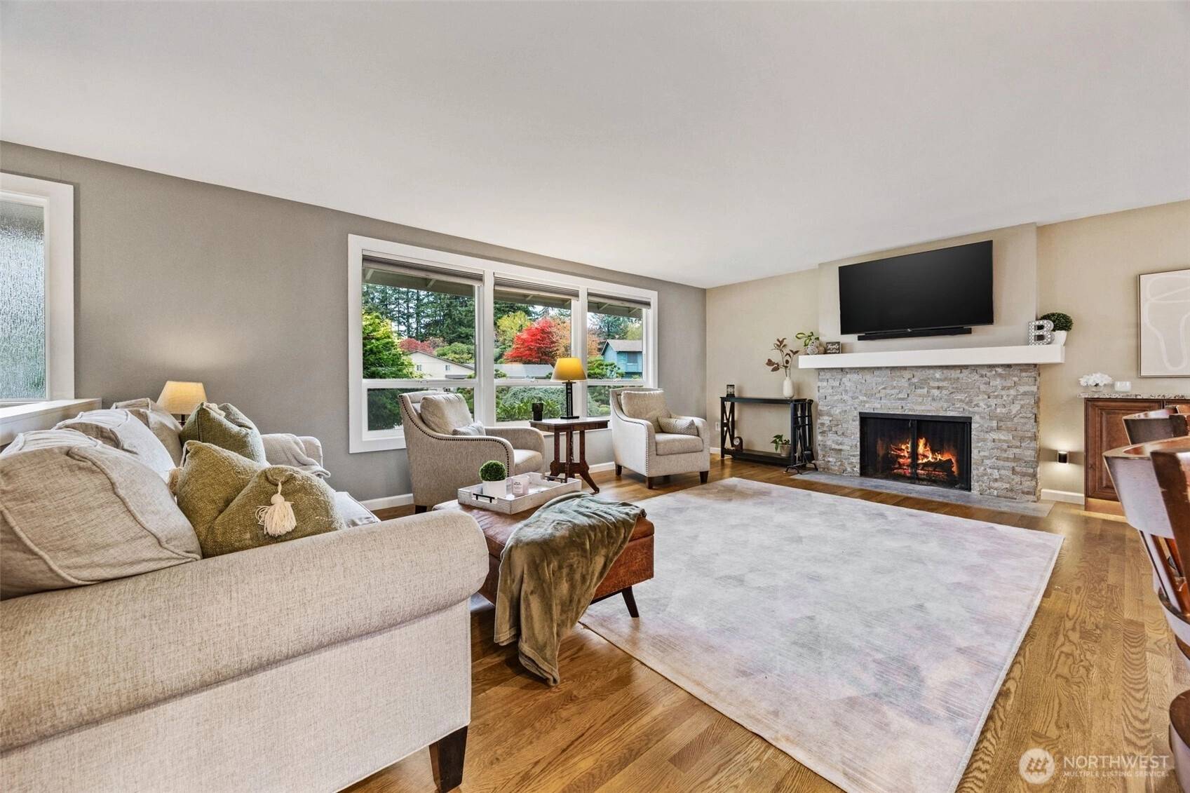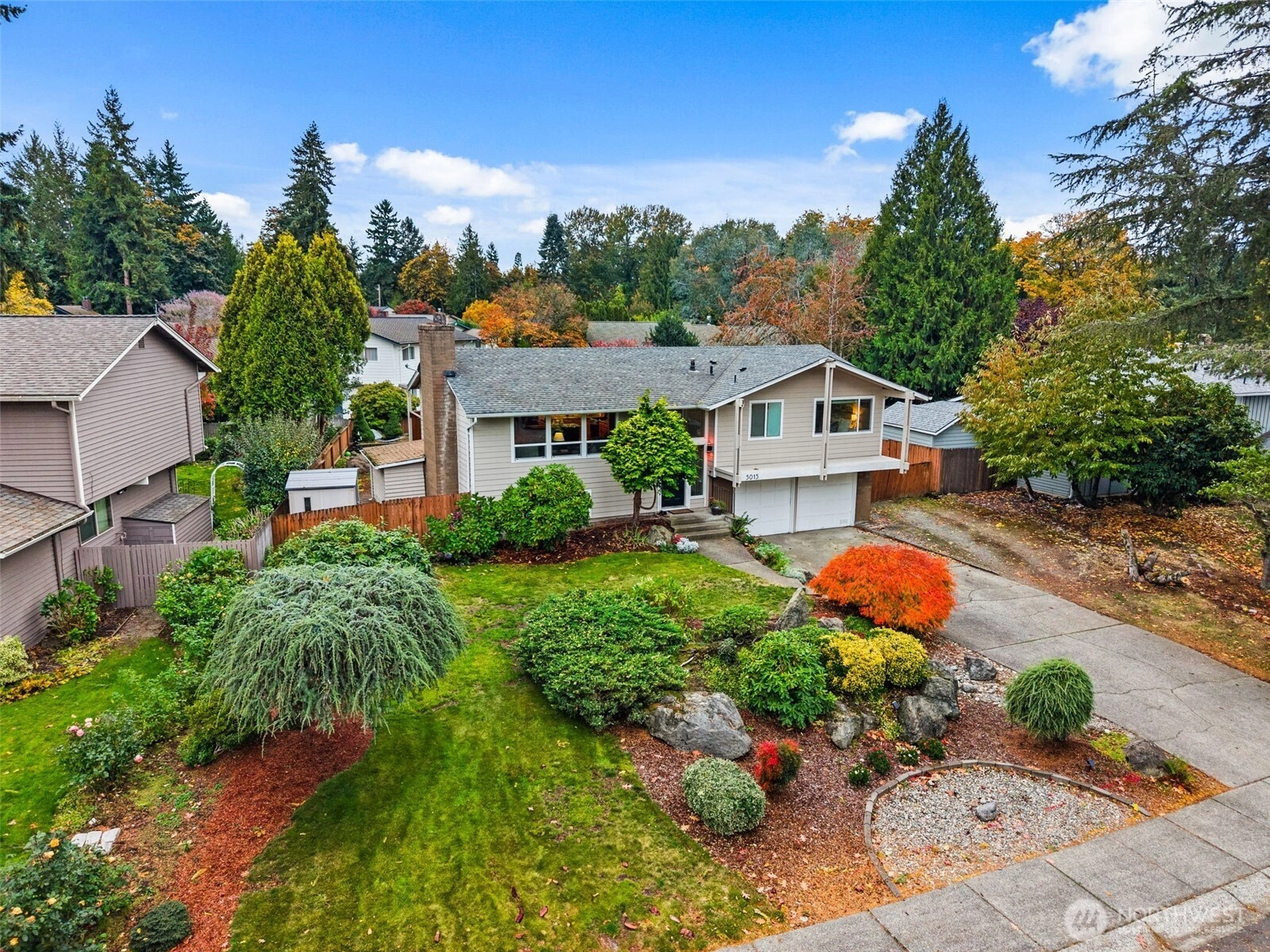 Step inside and feel instantly at home! The cozy front room with a wood-burning fireplace sets the tone for warm, relaxed evenings. The open kitchen and living area create an ideal space for entertaining, with an island, eating space, and beautiful hardwood floors. Enjoy year-round outdoor living on the covered deck with your gas fire pit—perfect for morning coffee or rainy PNW nights. Upstairs features three bedrooms and the main living area, while the lower level offers an additional bedroom, spacious rec room, and a utility room. Beautiful, mature landscaping enhances the front of the home, adding curb appeal and charm. A fenced yard provides space for play or pets, and a long, flat driveway with double side parking plus small RV space.