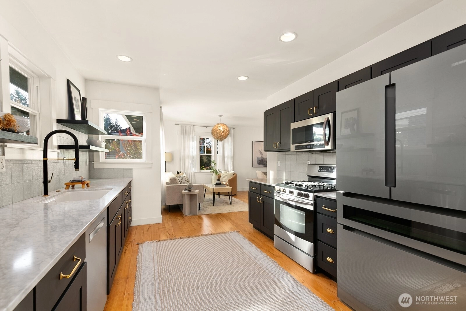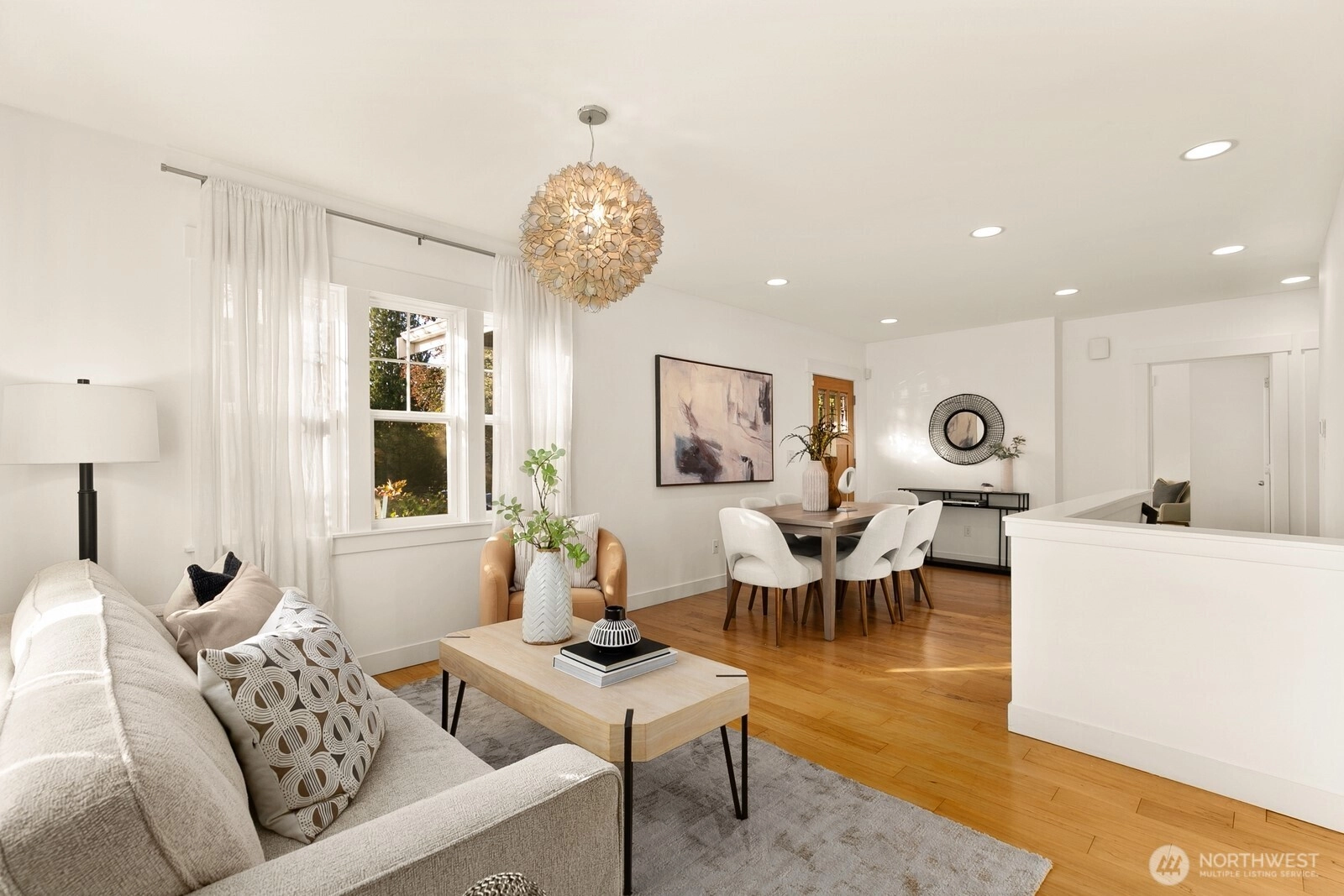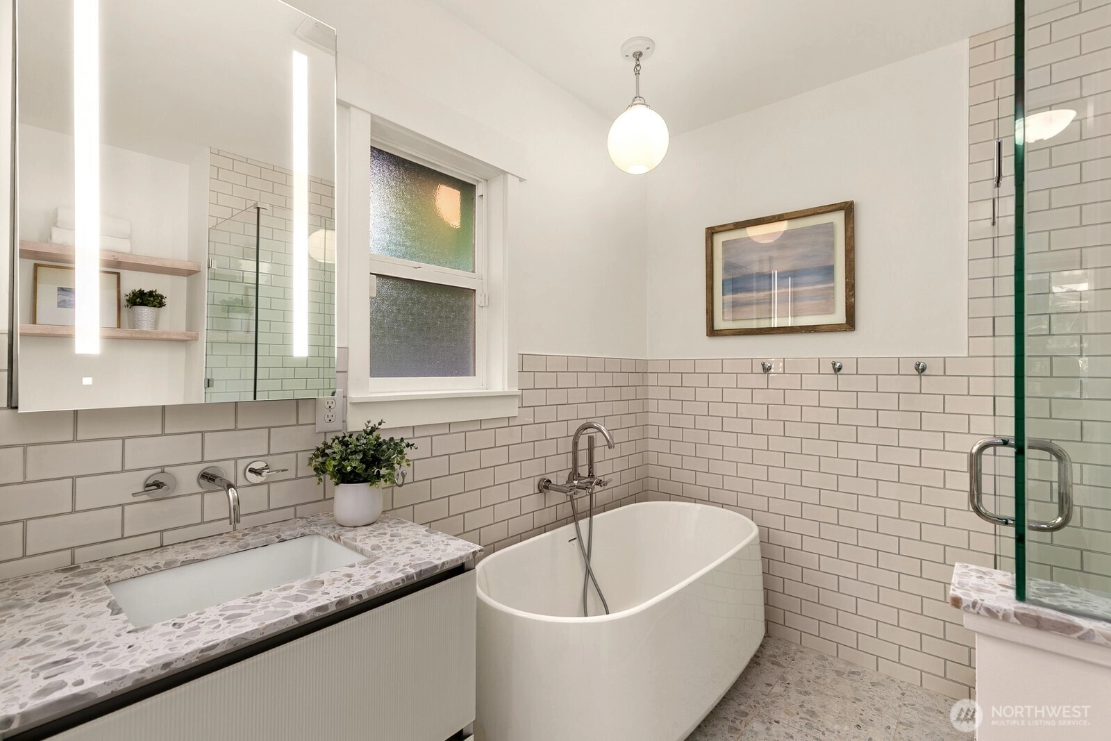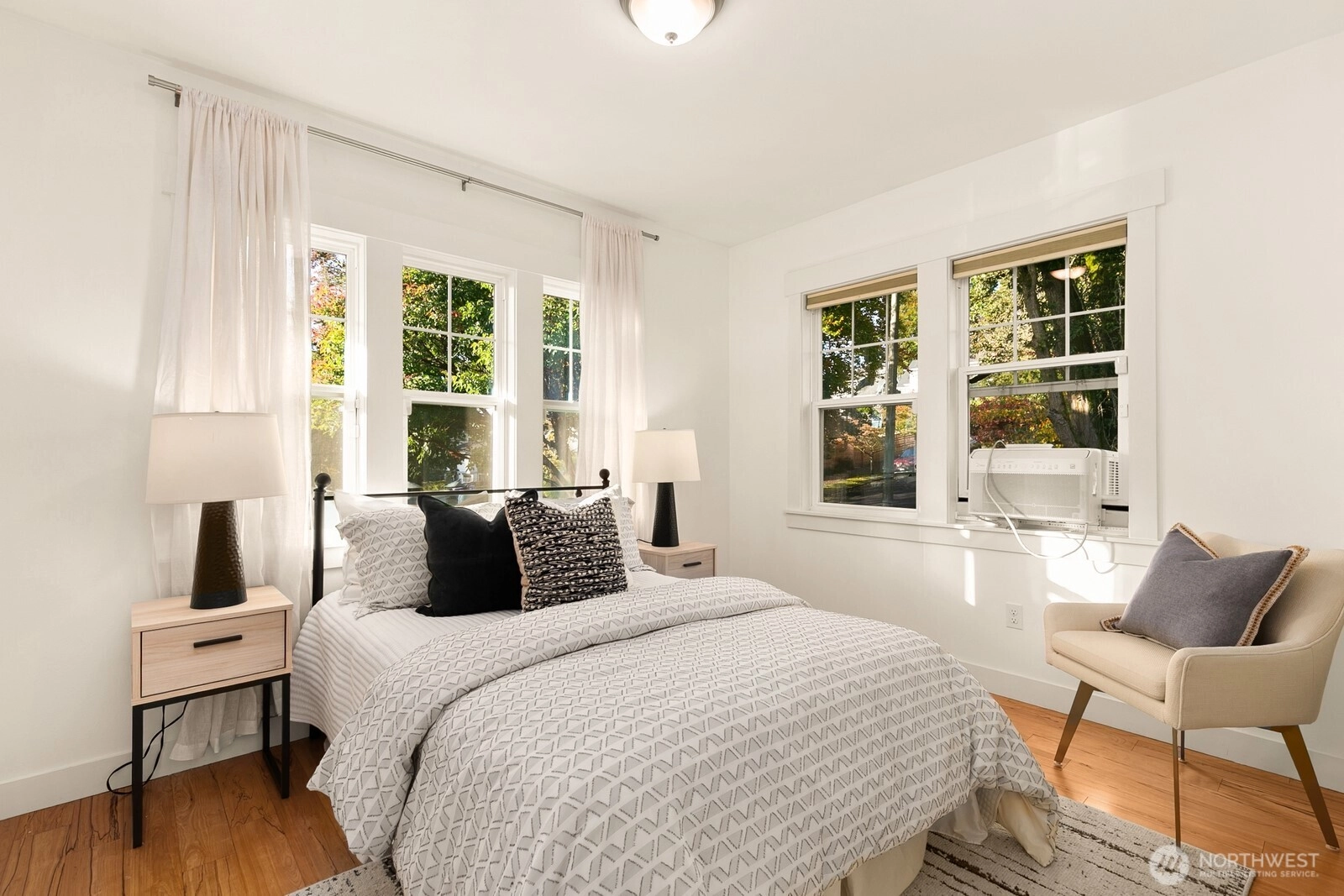 Thoughtfully upgraded and charming corner-lot home in beautiful Leschi! This home offers 4 bedrooms with California Closets, and a beautifully remodeled primary en-suite bathroom with a free-standing tub. The open-concept kitchen has been upgraded with elegant marble counter tops and beautiful Ann Sacks tiles. Radiant floor heating. A fully finished basement provides a large bedroom, a completely remodeled bathroom and a bonus room that can be used as a tv room, play room, or whatever your needs might be. Sit back and relax on the inviting front porch. Easy access to Madrona's restaurants and shops. Off-street parking.