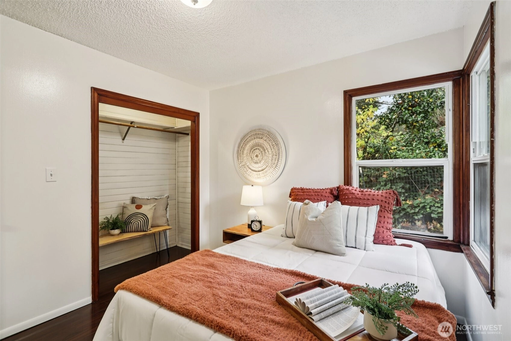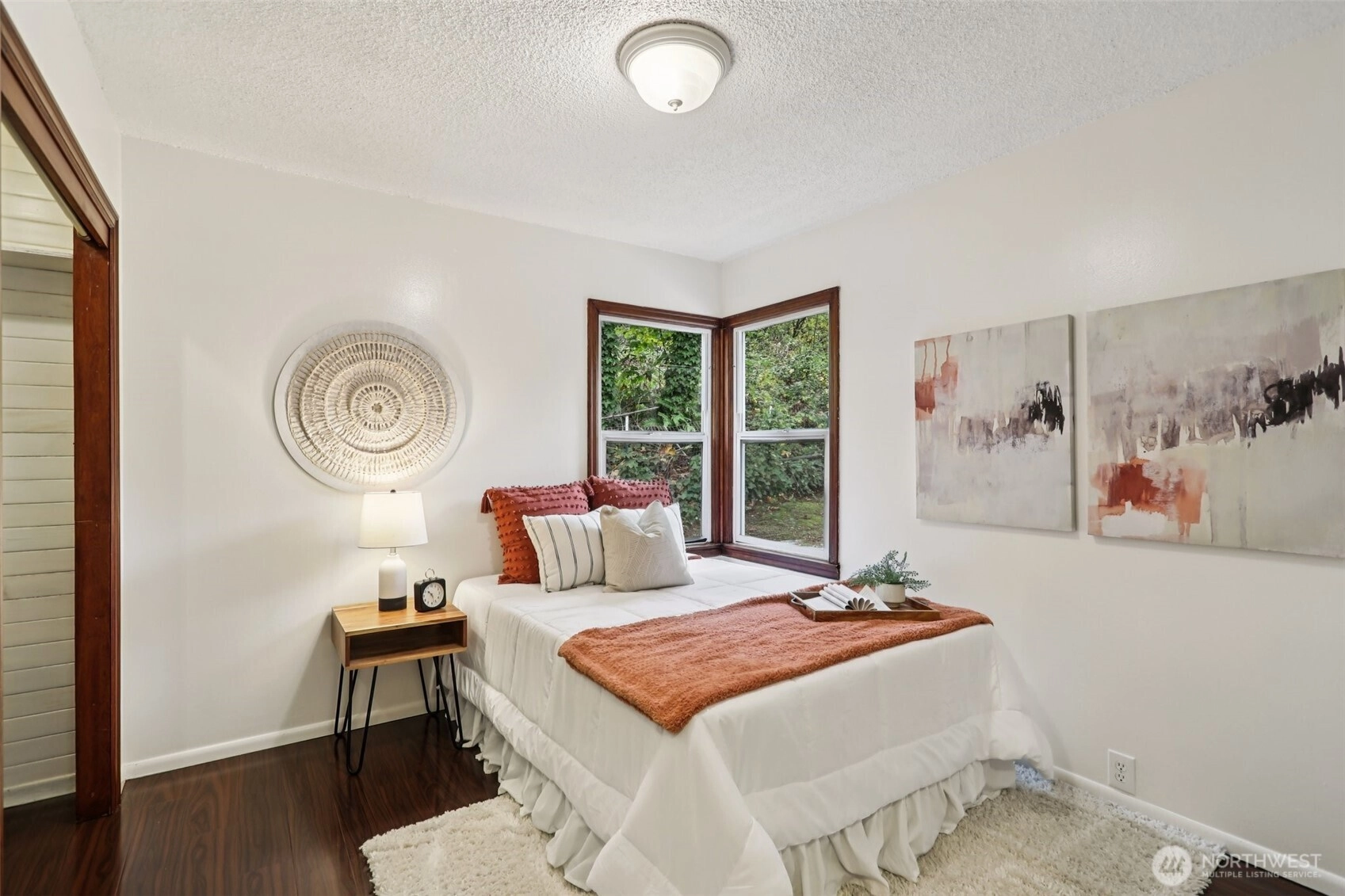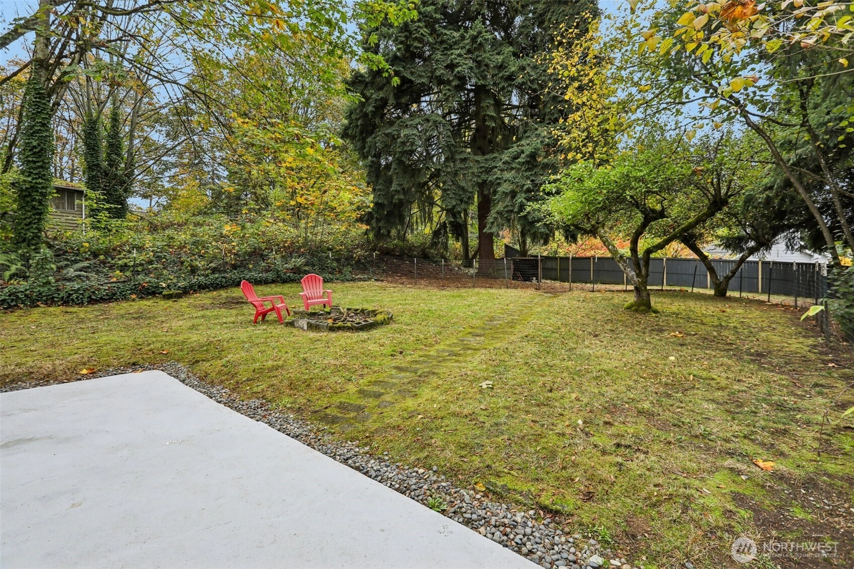 Super sweet home full of light & charm! Step inside to open living & dining room w/large floor-to-ceiling windows that fill the space w/natural light. A cozy fireplace w/insert, laminate flooring & access to the front deck create the perfect spot to relax or entertain. The dining area opens to a bright kitchen featuring plenty of cabinetry & counter space. A backdoor leads to the massive backyard—complete with a covered patio & firepit for year-round enjoyment! Both bedrooms feature charming corner, wood-wrapped windows. Fresh interior paint throughout. The garage offers a new door/remote & ample storage. Fantastic location! Close to Southcenter Mall, theaters, restaurants & more. Easy commute w/access to I-5, 405, or the light rail.