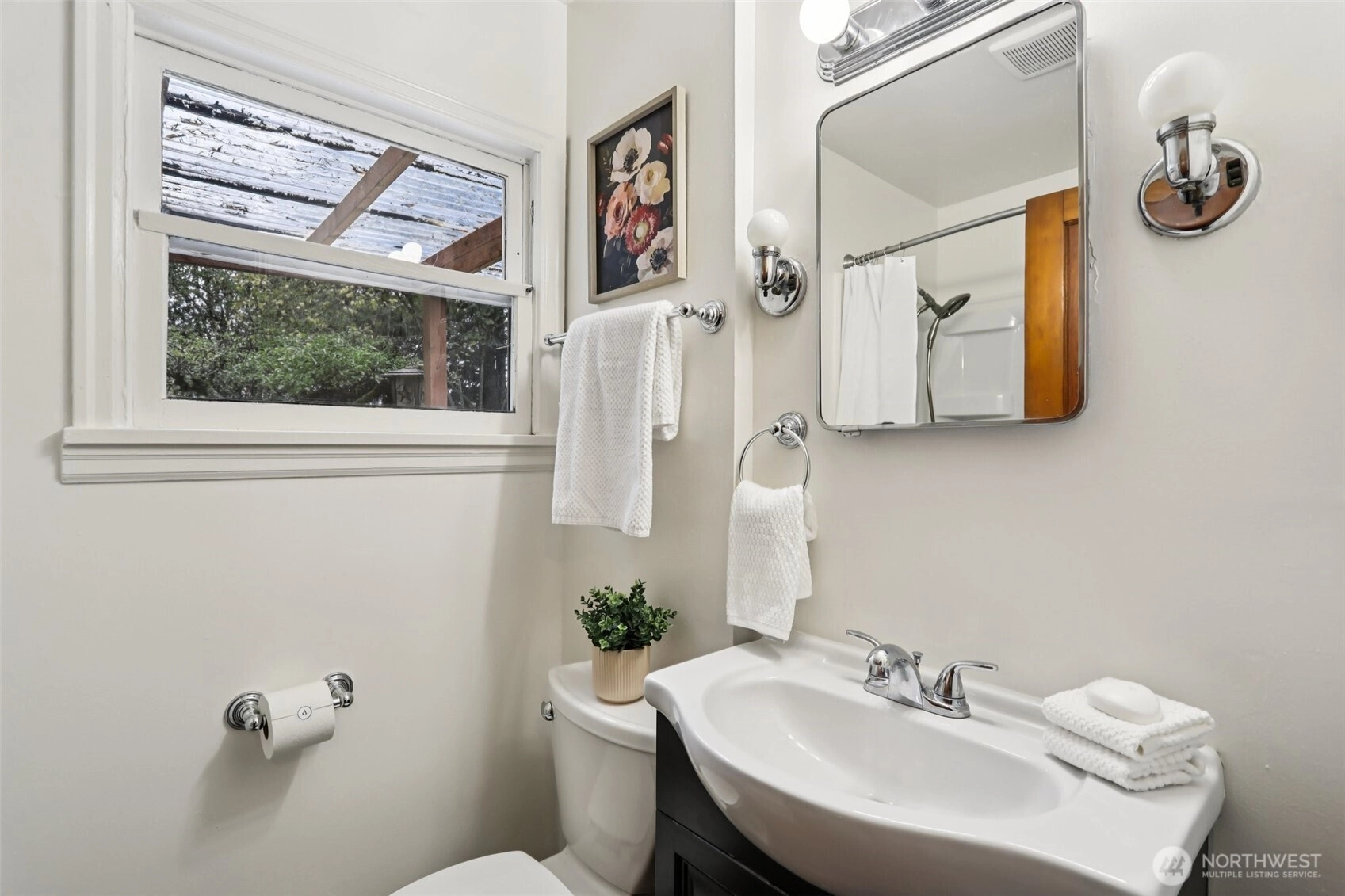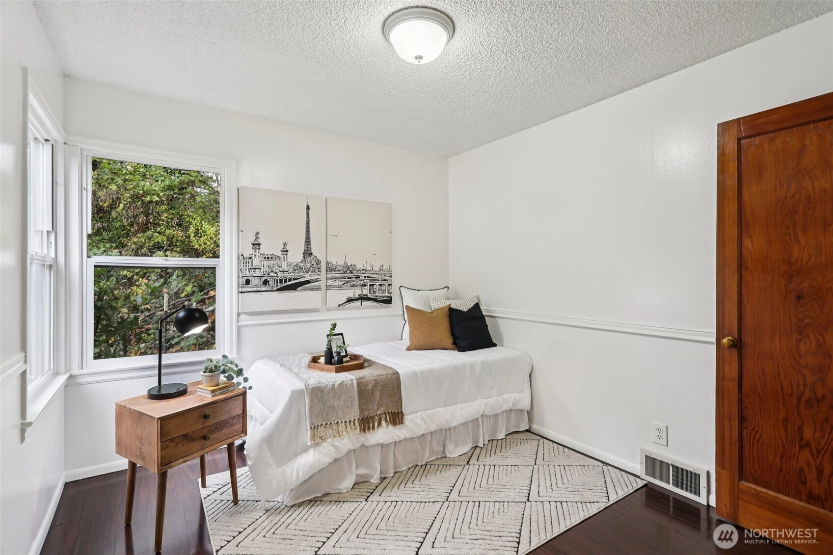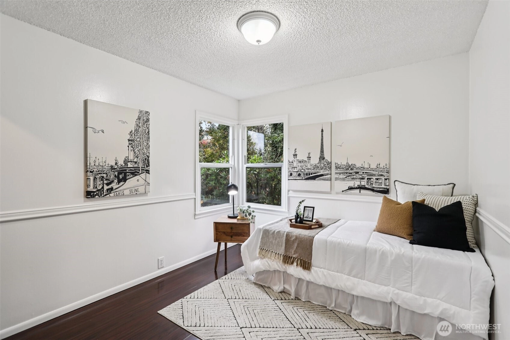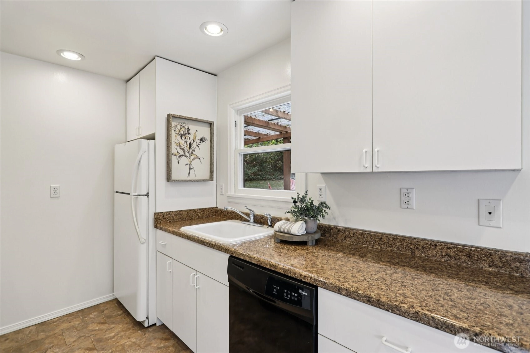 Super sweet home full of light & charm! Step inside to open living & dining room w/large floor-to-ceiling windows that fill the space w/natural light. A cozy fireplace w/insert, laminate flooring & access to the front deck create the perfect spot to relax or entertain. The dining area opens to a bright kitchen featuring plenty of cabinetry & counter space. A backdoor leads to the massive backyard—complete with a covered patio & firepit for year-round enjoyment! Both bedrooms feature charming corner, wood-wrapped windows. Fresh interior paint throughout. The garage offers a new door/remote & ample storage. Fantastic location! Close to Southcenter Mall, theaters, restaurants & more. Easy commute w/access to I-5, 405, or the light rail.