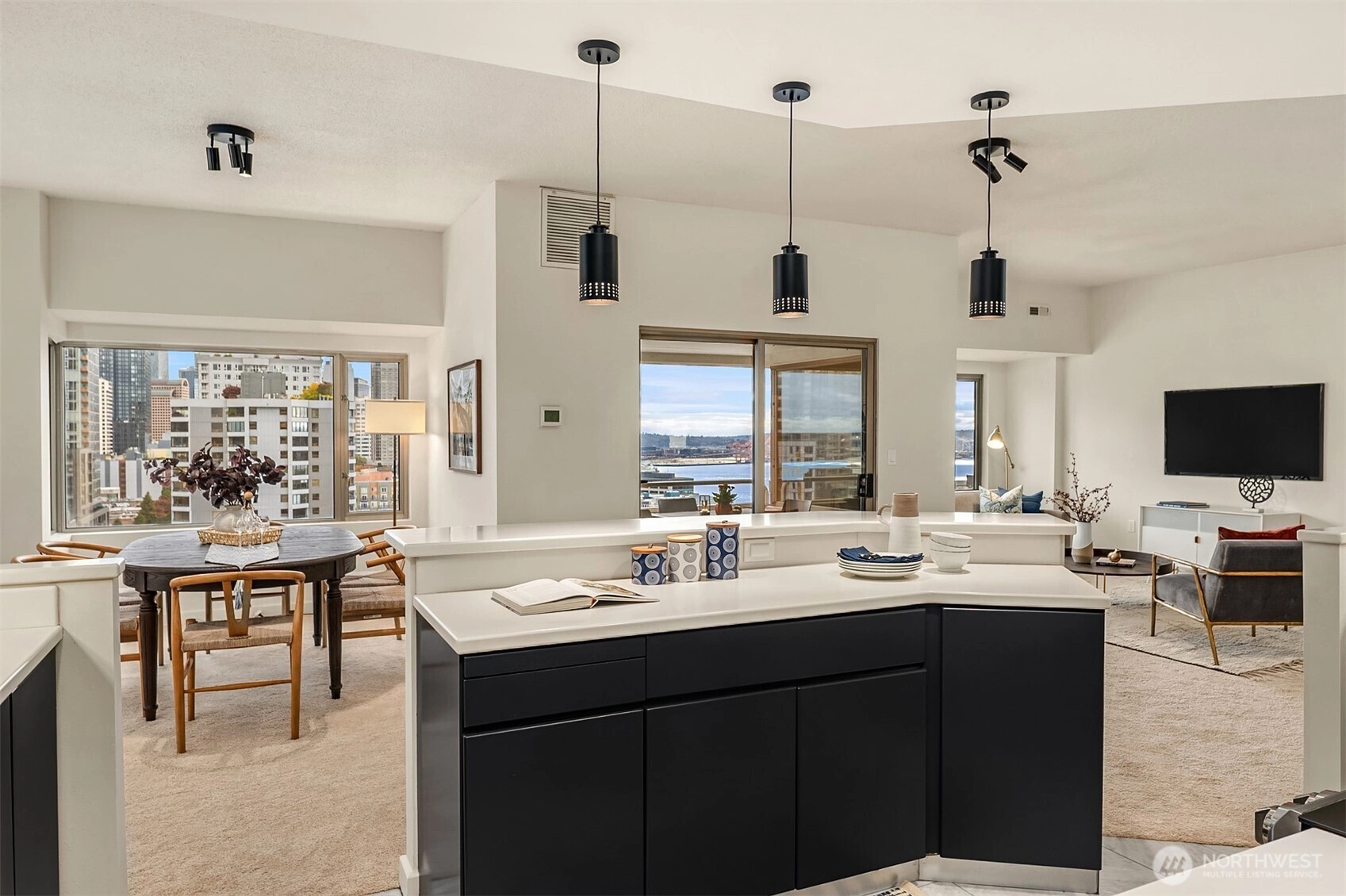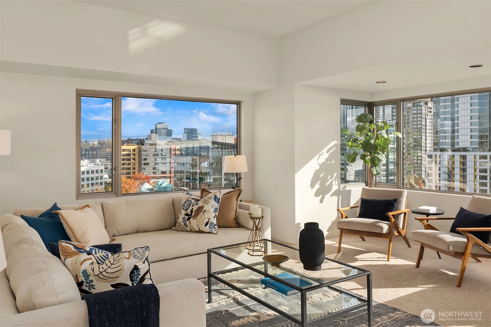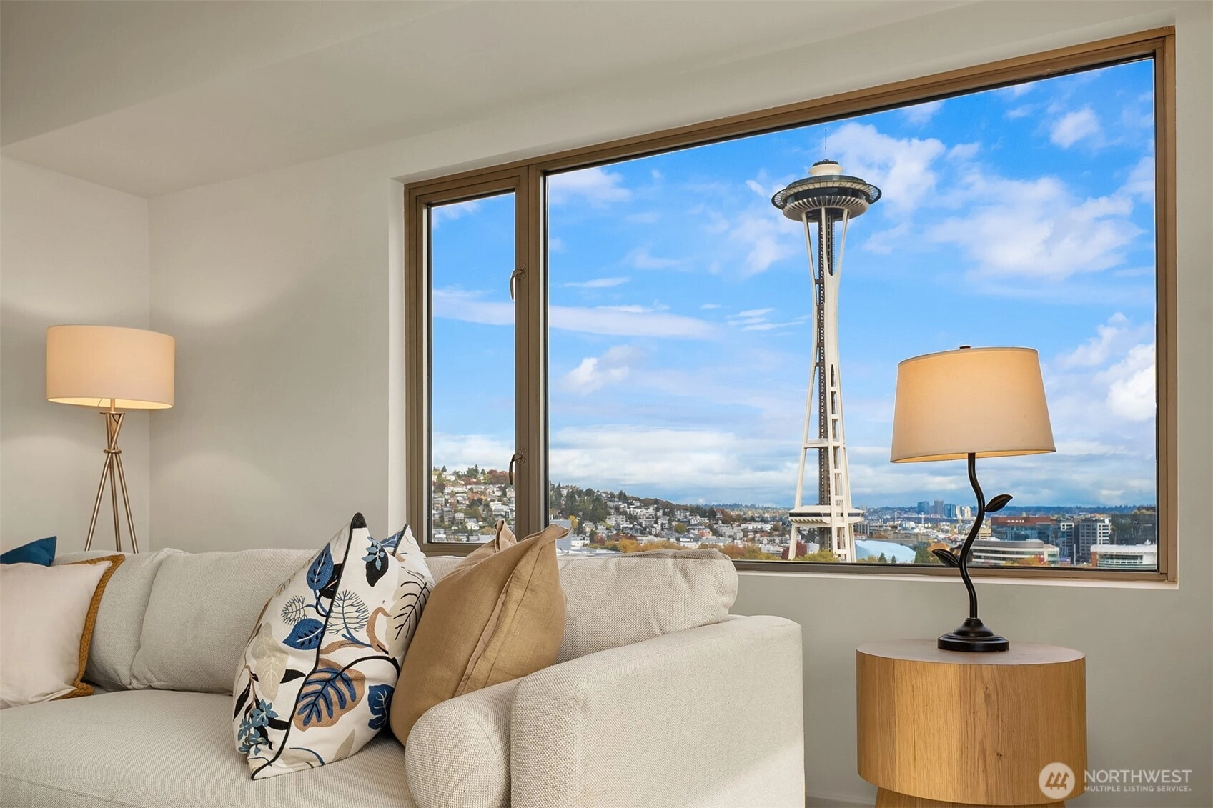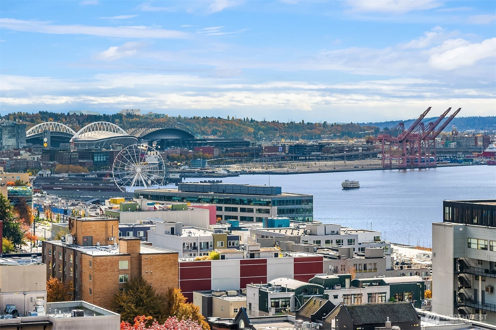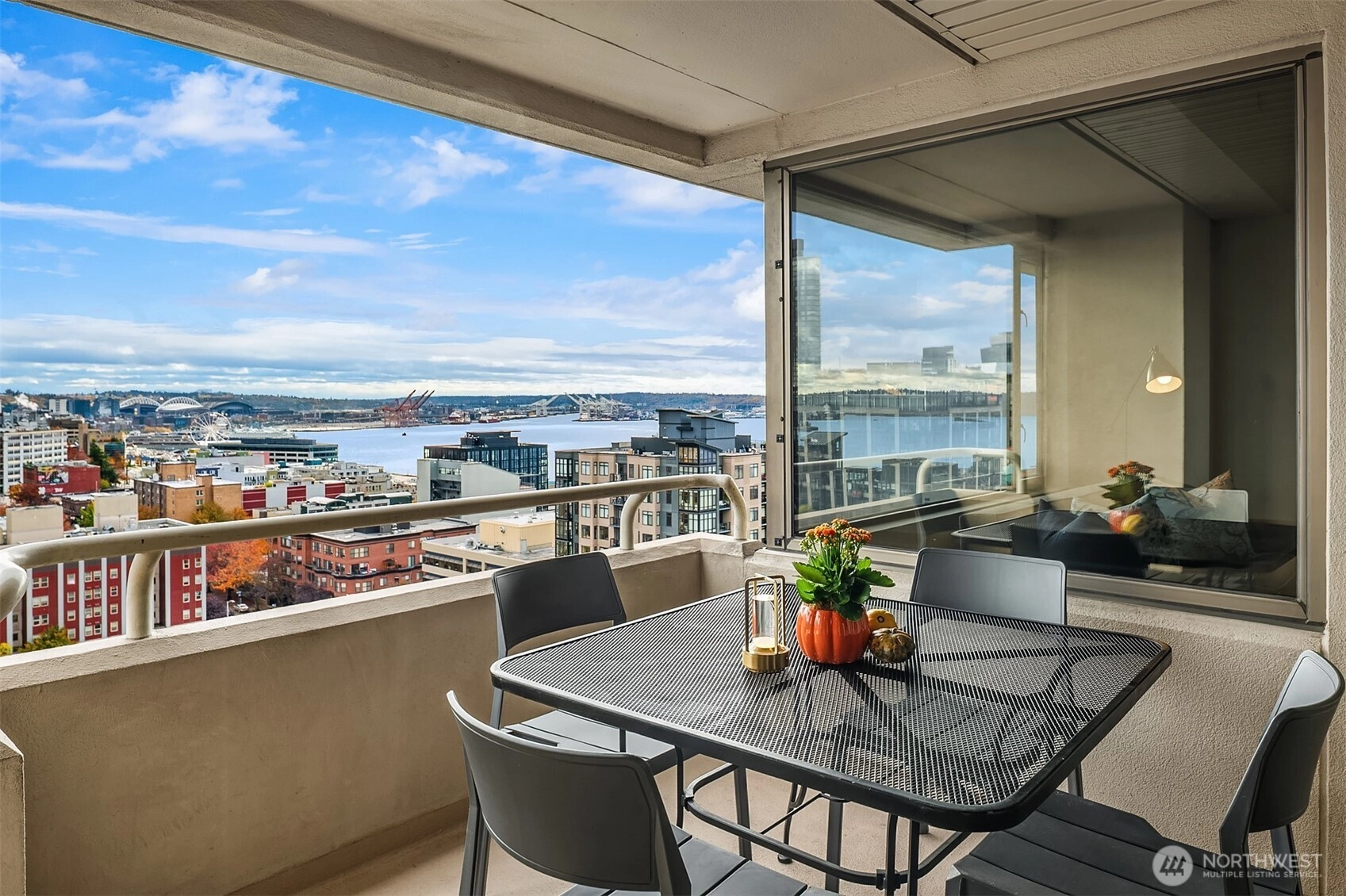 Presenting the Bay Vista- distinctive and elegant urban living at its finest. Wrapped in extraordinary views from Puget Sound to Mt. Rainier to our iconic Space Needle. This 2300+ sq. ft. SE facing home delights at every turn. The flexible lay-out enhances the spaciousness & views from living to dining to family room w/2 south facing balconies. With 3 bed/3bath + modern, bright updated kitchen prepare to live, work and enjoy life at the Bay Vista. Outdoor amenities on the 6th fl. plaza include sport court, walking path, planting gardens, & outdoor kitchen /fireplace to enjoy those views! Don't miss the pool/hot tub, sauna & guest suite. Two parking spots/two storage units. Impeccable 24/7 concierge service. Downtown living at its best.