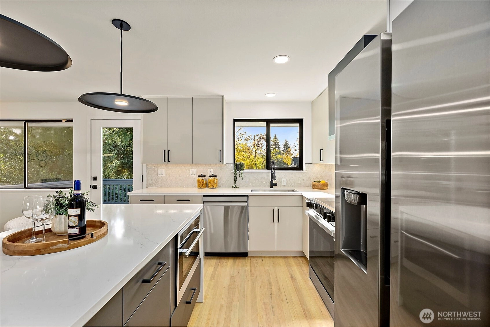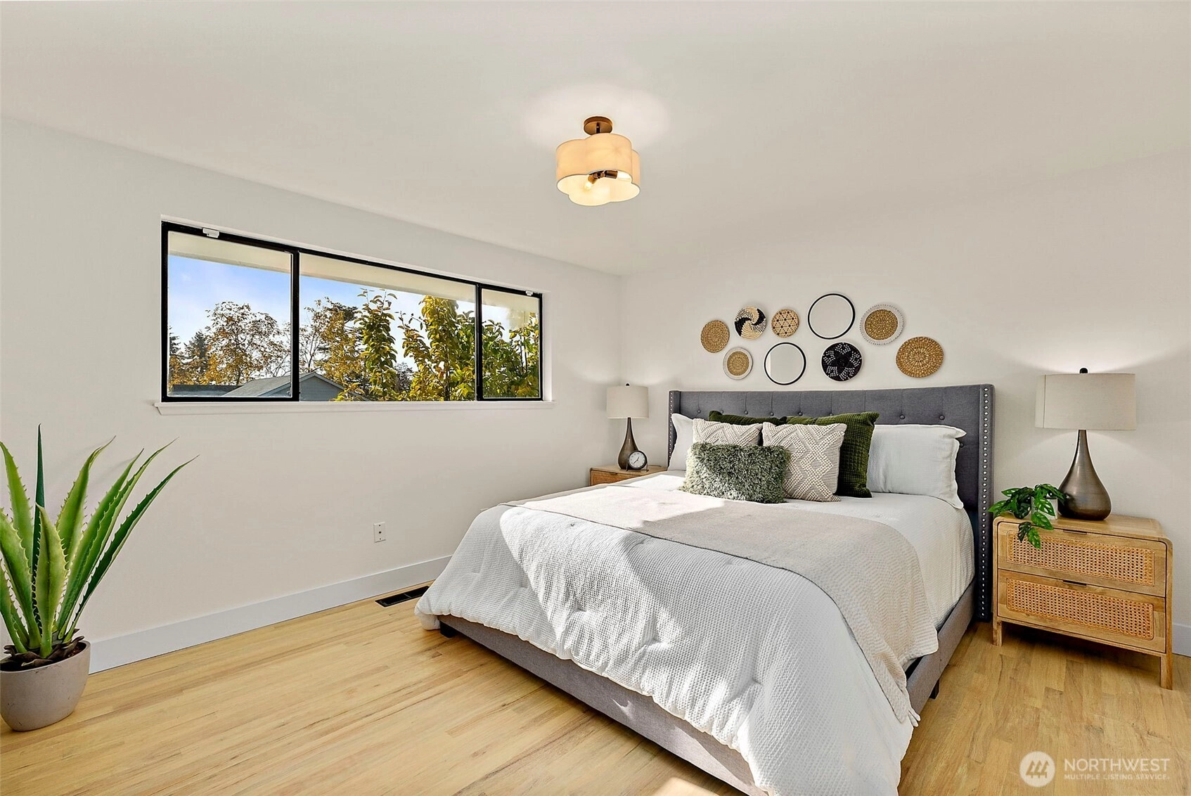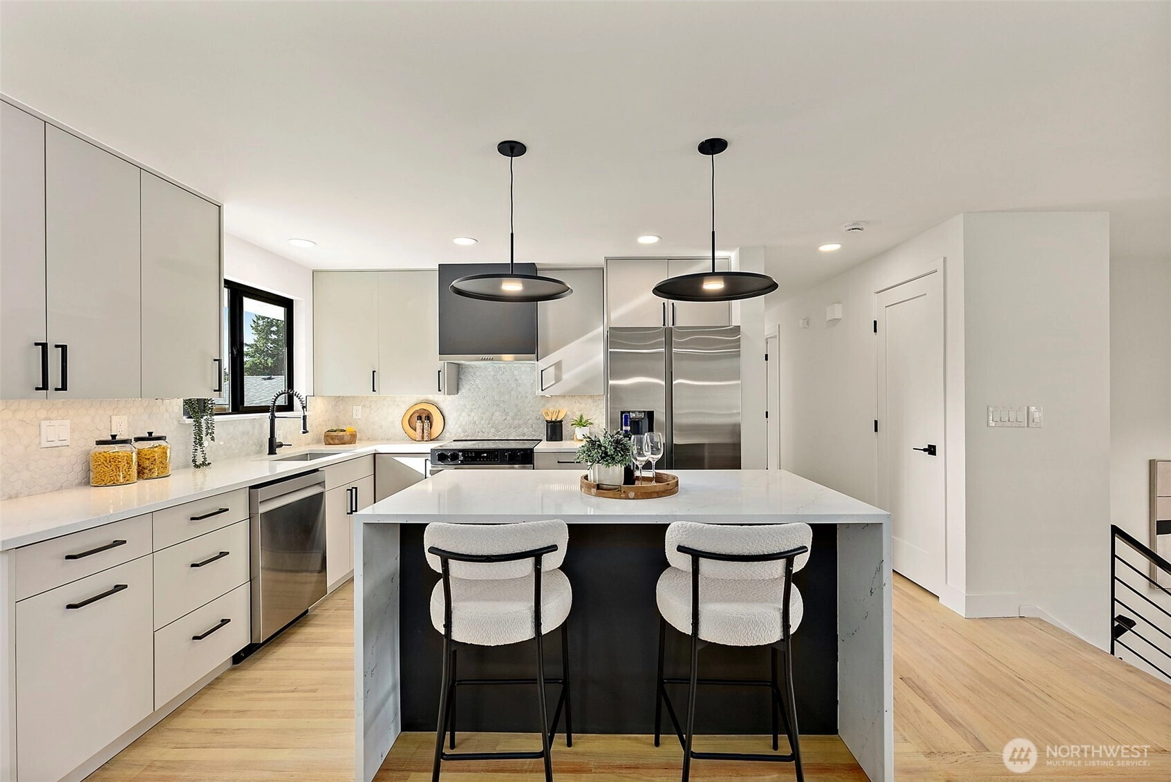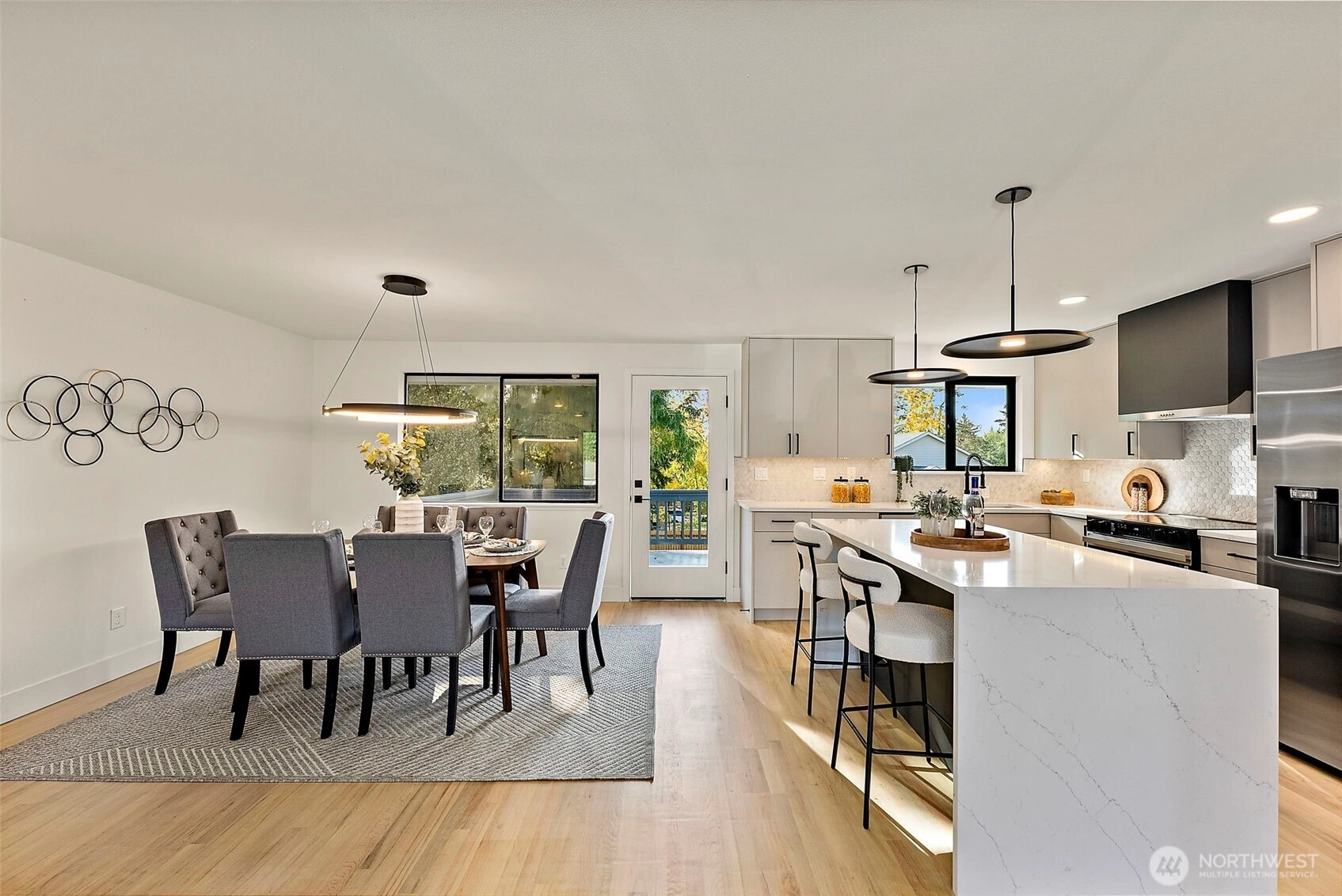 This ultra-modern 4-bedroom, 2.5-bath home has been fully remodeled with chic design elements and clean, sophisticated finishes throughout. The gorgeous kitchen features sleek cabinetry, quartz countertops, and stainless steel appliances, complemented by stunning updated bathrooms and rich hardwood floors. The generous bonus room downstairs provides flexible space for media, work, or play. Enjoy the spacious lot with a deck overlooking the yard below with brand new fence—ideal for entertaining or relaxing outdoors. Ample parking with a long driveway for up to four cars plus street parking. Located near Burien’s boutique shopping, wonderful restaurants, and quick freeway access, this home blends modern luxury with everyday ease.