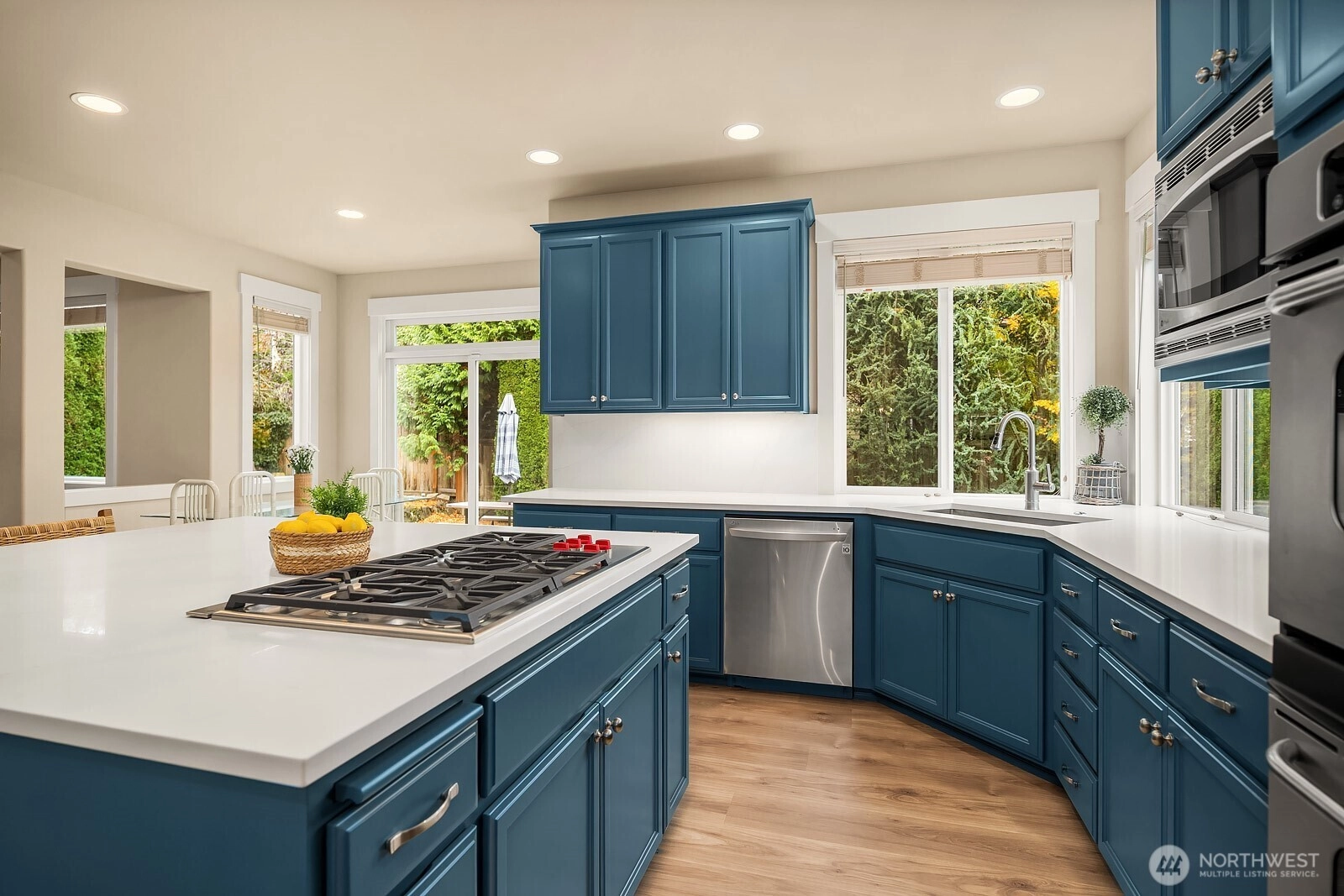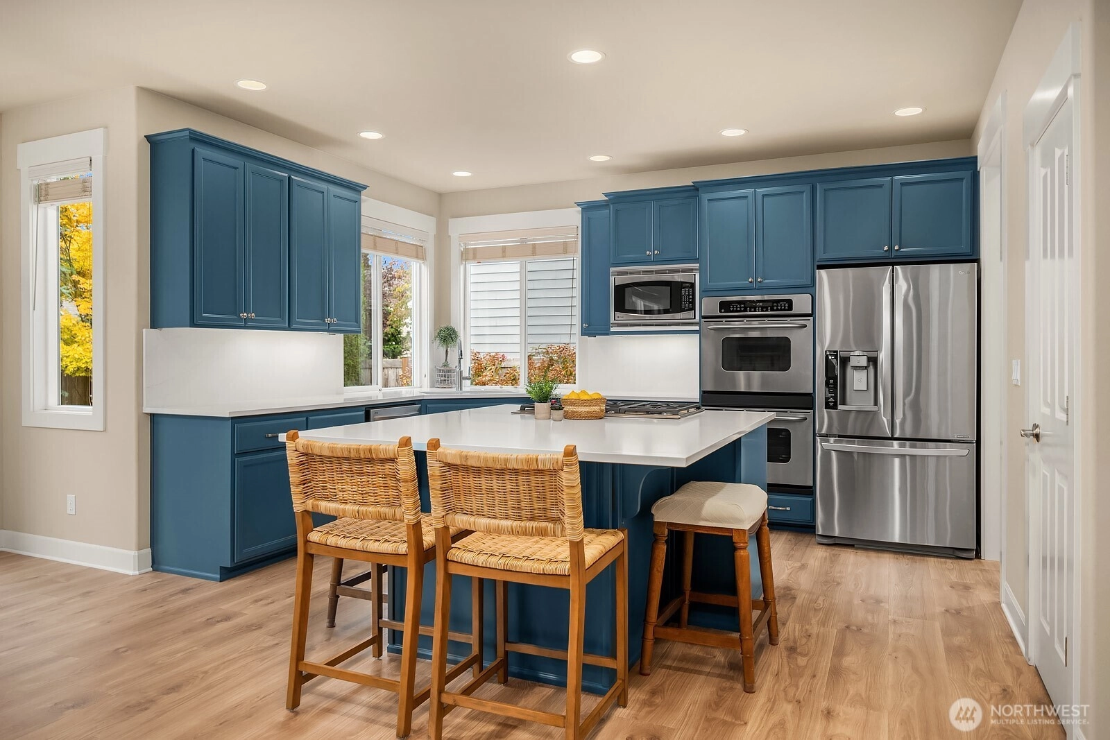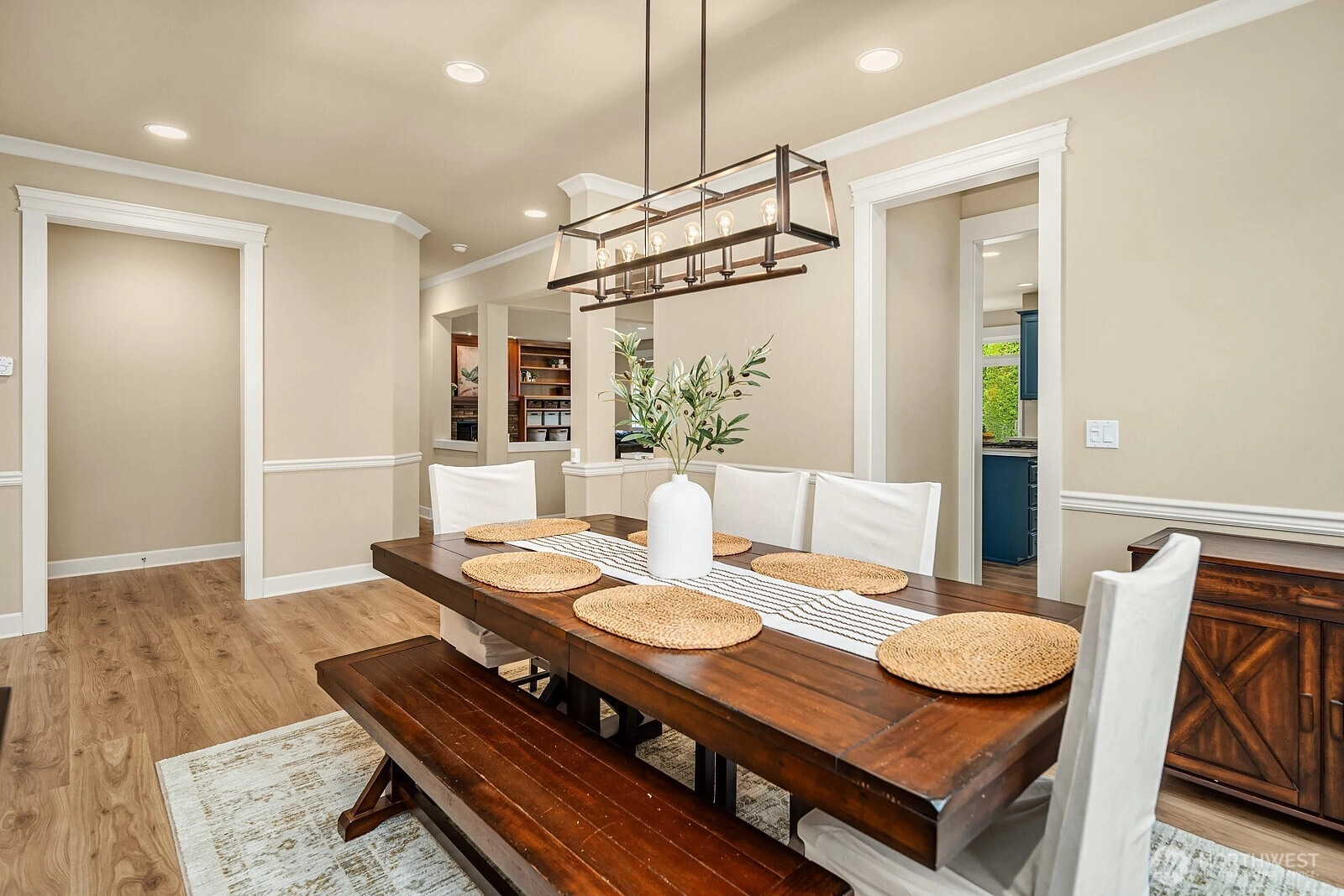 Turn-key Burnstead resale in Montaine at Aldarra! Nestled on a quiet cul-de-sac, this 3,601 sq ft home offers 4 bedrooms plus a main floor den (optional 5th) and 3.25 baths. A vaulted entry opens to a bright great room with stone-surround fireplace and custom built-ins. The chef’s kitchen boasts a large island, new quartz countertops, walk-in pantry, and under-cabinet lighting. Enjoy new flooring on the main level and a newer roof. Upstairs features a spacious primary suite with 5-piece bath and WIC, three additional bedrooms including one ensuite, full hall bath, utility room, and over-sized bonus room. Fully fenced backyard, patio for entertaining, 3-car garage, and top-rated Snoqualmie Valley Schools with easy access to I-90 and 520.
