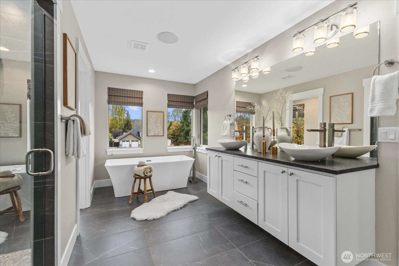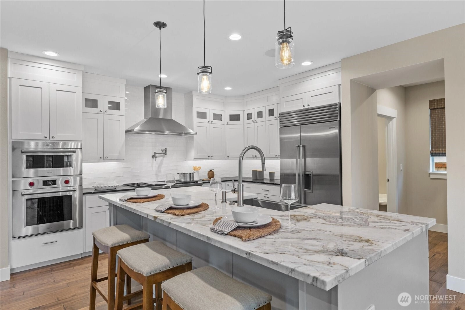 THIS ONE is dressed to impress! Presenting CHIC CONTEMPORARY LIVING in 425 Magazine's 2025 best rated PNW City! Dwell within the beauty of the Cascade foothills (just 20 minutes from the Eastside Tech Corridor) in this custom-built residence, showcasing WIDE-PLANK WOOD flooring + a genuinely Chef's appointed kitchen - outfitted with WOLF GAS RANGE + DOUBLE OVENS and SUB-ZERO KITCHEN & WINE FRIDGES. Relax to DEFINITIVE AUDIO vibes, dine & unwind under COVERED OUTDOOR LIVING - soaking in your luxurious SALTWATER HOT TUB within the privacy of your large yard. Zen-inspired Primary Suite, Den/Office, Bonus/Media Room + new designer paint & carpet elevate your lifestyle! Book a tour of this stunning home soon!