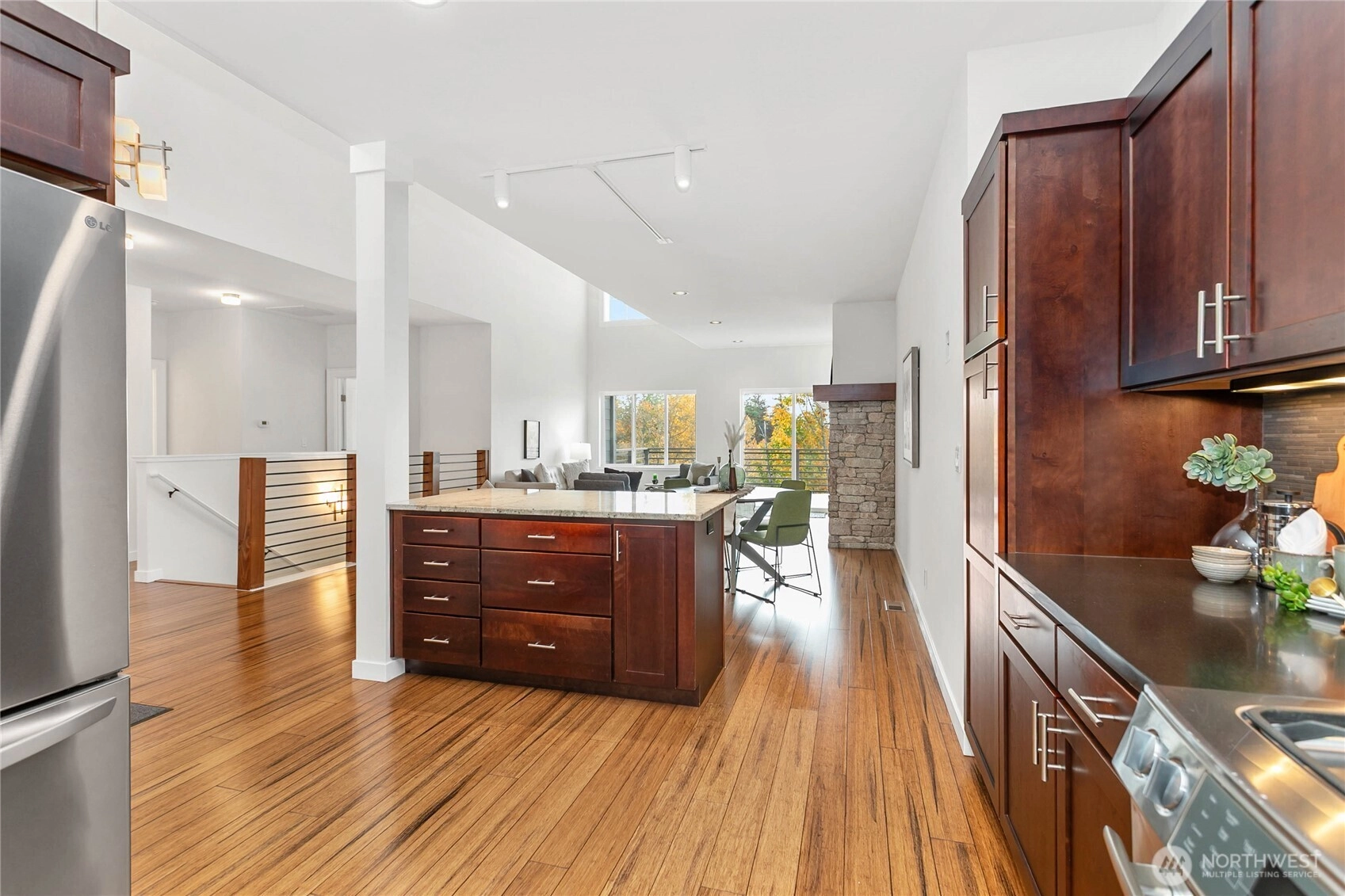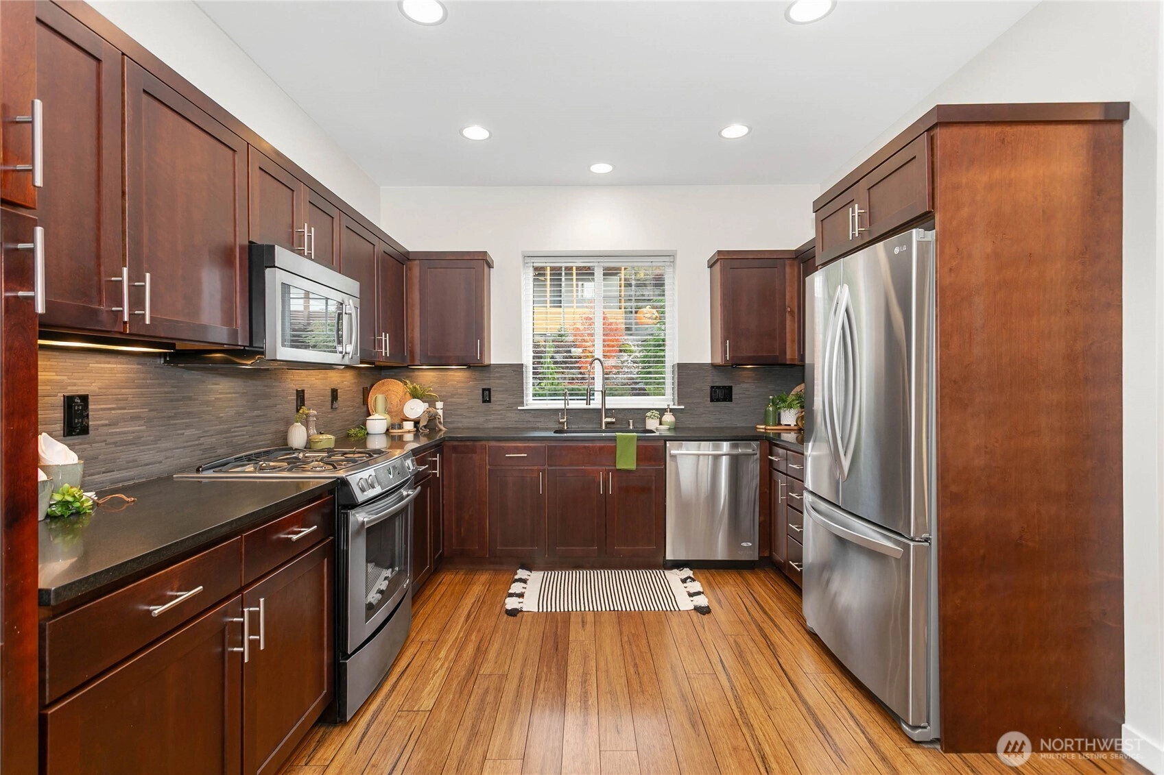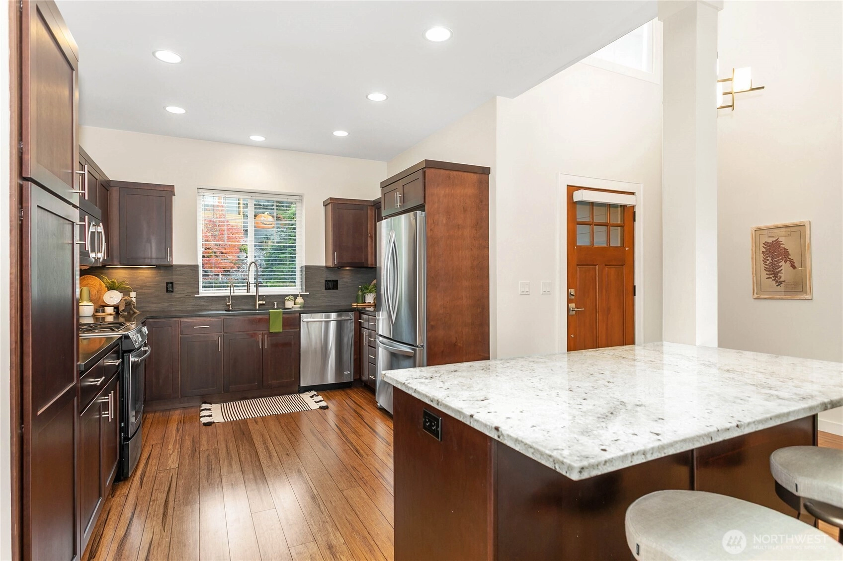 Beautifully maintained 3-BD, 2.25-BA Craftsman in Barkley Crossing. Thoughtfully designed w/ all the essential living spaces on one level, this home offers both comfort & convenience. Inside, you’ll find fresh paint, bamboo floors, & timeless details in wood, tile, & stone. The open layout connects the living area—centered around a real rock fireplace—to a well-appointed kitchen w/ soft-close cabinetry & quality finishes throughout. The primary suite & main-floor laundry make daily living easy. Step outside to enjoy the well kept landscaping & a private backyard that borders a peaceful greenbelt. Minutes from Barkley Village shops, trails, & parks. Craftsmanship coupled w/ modern living in one of Bellingham’s most desirable communities.