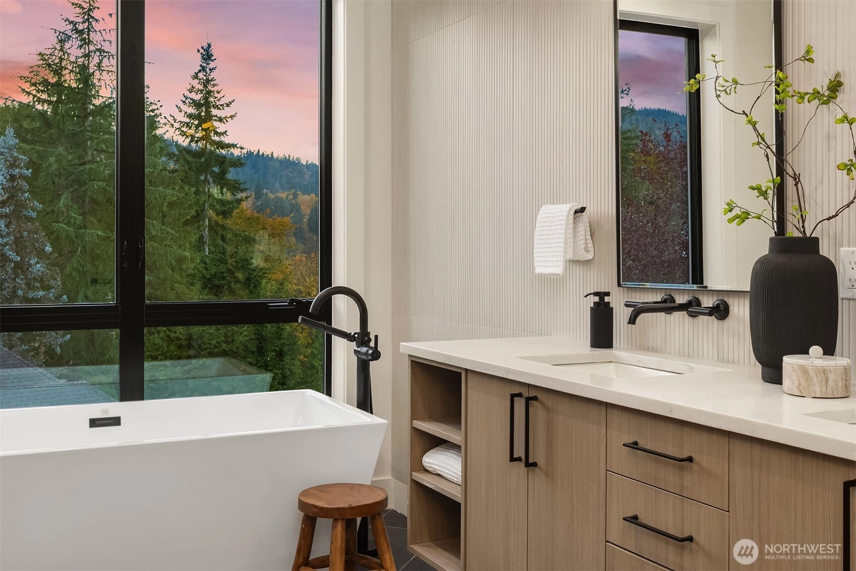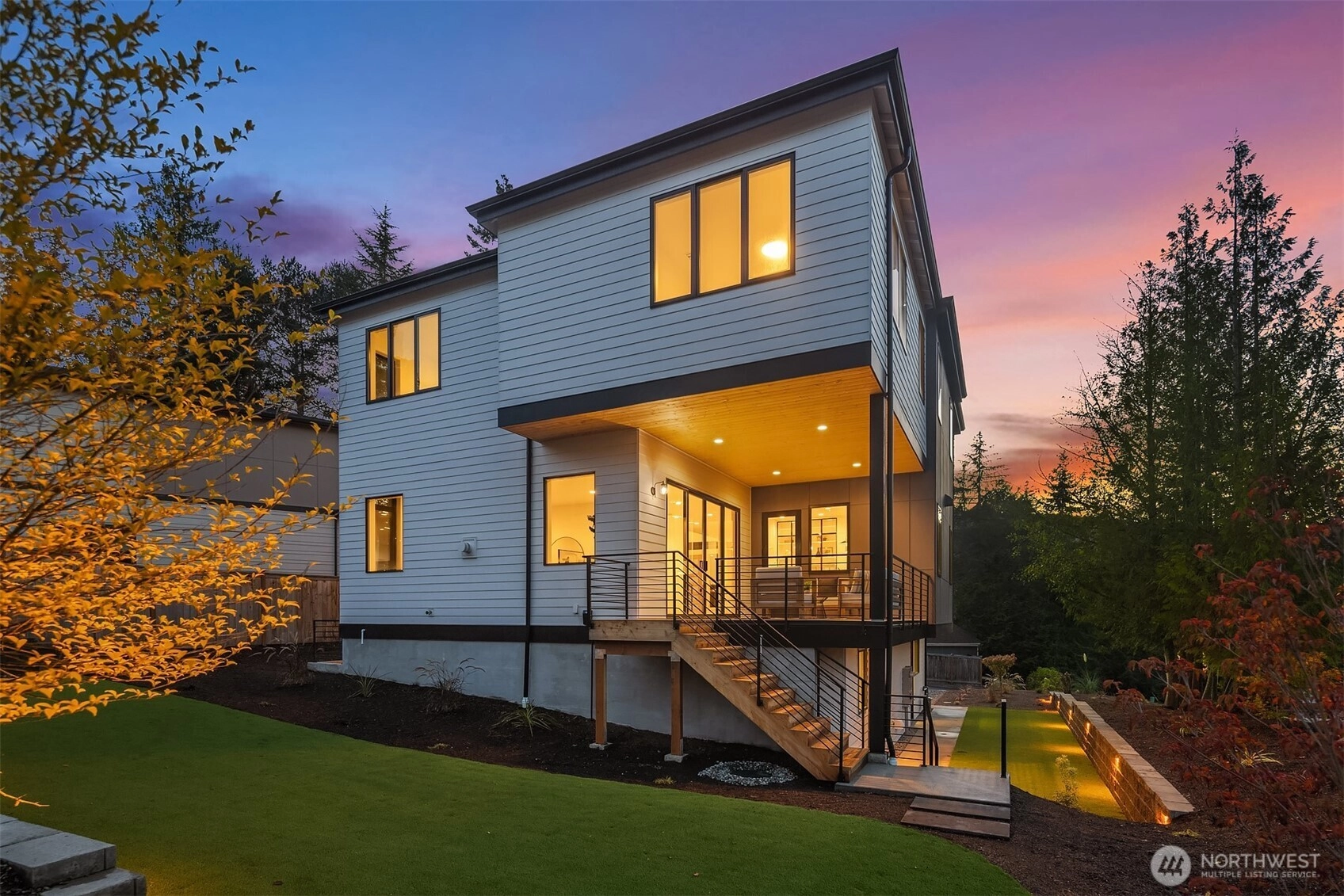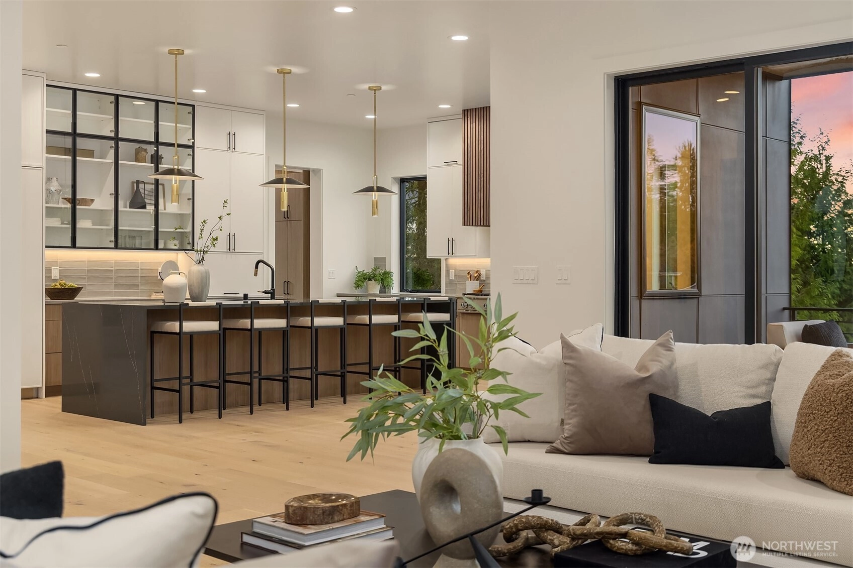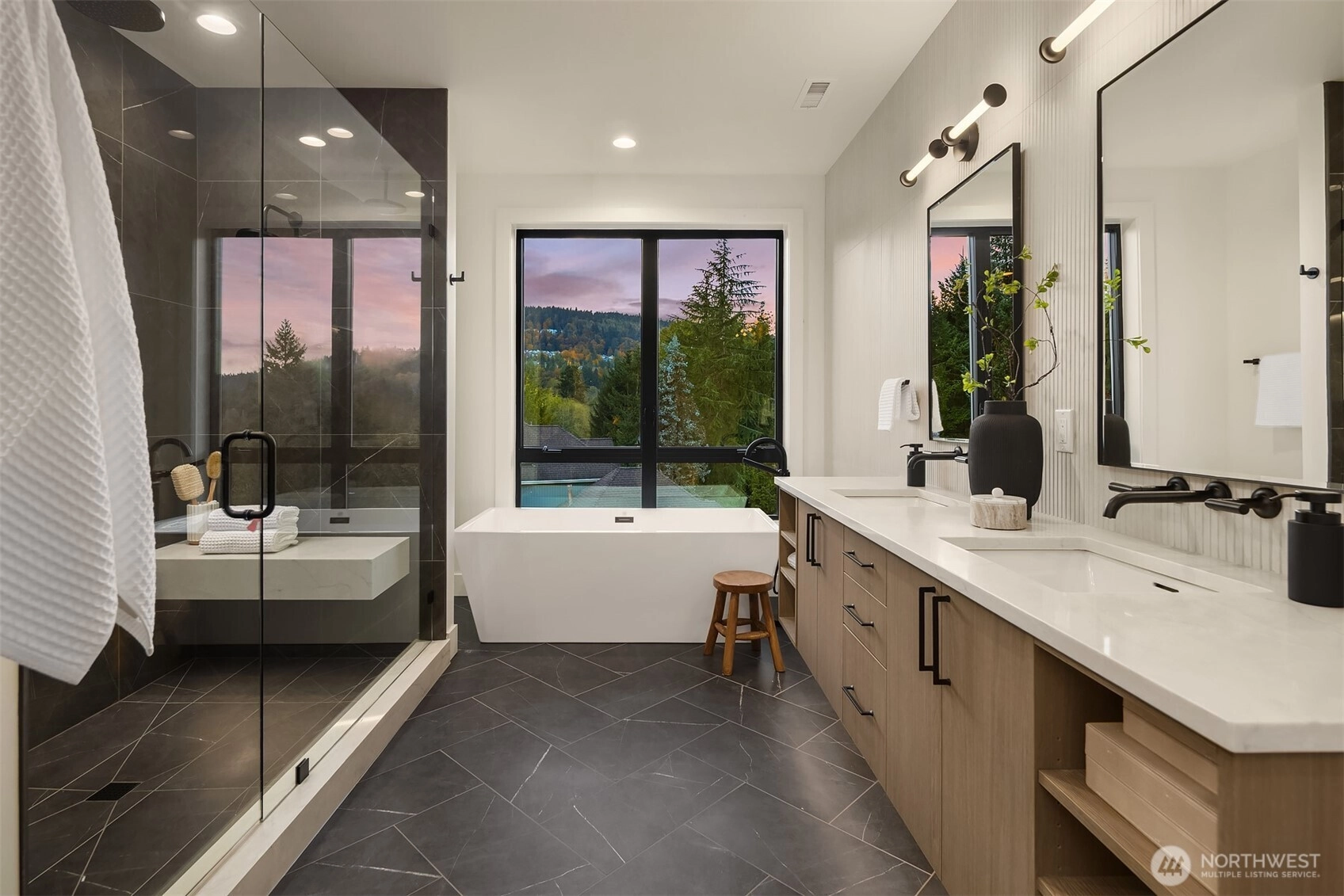 Perched above Issaquah’s lush tree line w westerly views, this newly built Veristone Homes balances modern elegance w natural tranquility. A grand entry opens to sunlit interiors illuminating wide-plank oak floors. The chefs kitchen impresses w an 11ft double waterfall island, Hestan range w pot filler, Monogram appliances, & full scullery, inviting gatherings & quiet moments alike. Downstairs, herringbone floors flow through the spacious lower level featuring media room & studio w 2nd kitchen & private, no-stairs entry—ideal for guests or extended living. Upstairs, 4 ensuites include a serene primary suite w heated floors, soaking tub, & windows framing peaceful green vistas. Turf yard, covered patio, & refined finishes complete this home.