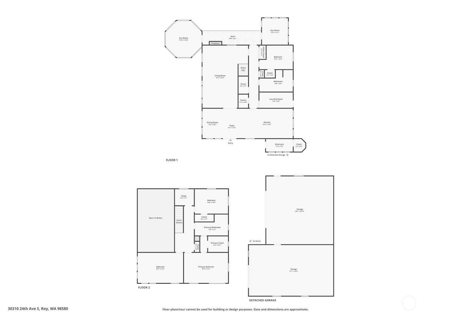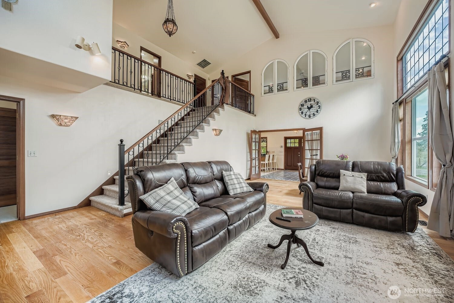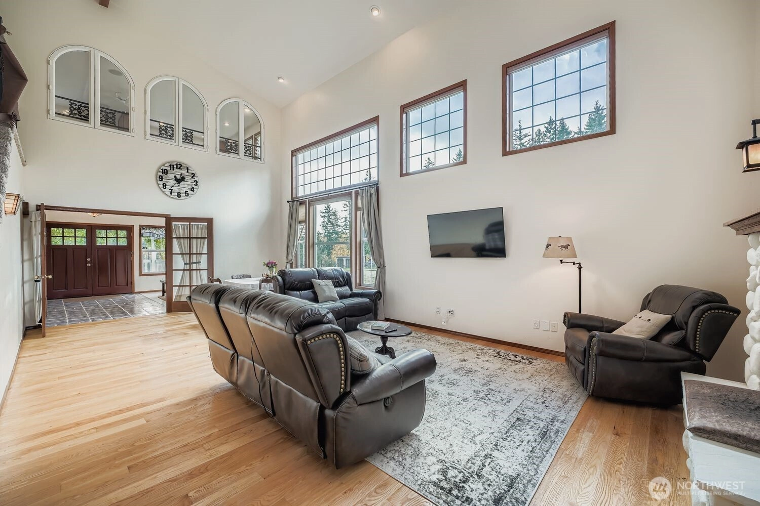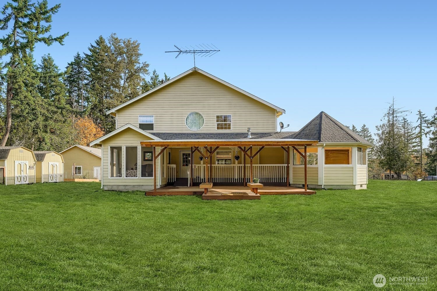 Modern farmhouse on 4.4 serene, usable acres, w/sweeping pastoral views. Nearly 3,000 sqft custom home w/handsome craftsmanship: solid oak doors, rich hardwoods, vaulted ceilings & abundant natural light framed by wrought-iron accents. Designed for entertaining, the open layout features a gourmet kitchen w/hickory cabinetry, generous dining area & seamless indoor-outdoor living w/covered front & back porches. True equestrian setup, 6 fenced pastures, horse shelters, 2 sheds, gardens, large shop built for a car lift & covered RV parking. Unique octagon music room w/private sauna. Smart ranch layout w/main-level mud/tack rooms & laundry. Upper-level office overlooks acreage & livestock w/partial Mount Rainier view. Assumable VA 3.5%!
