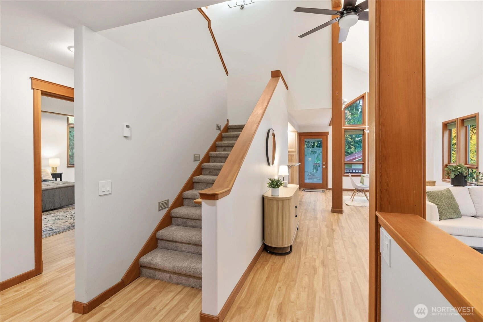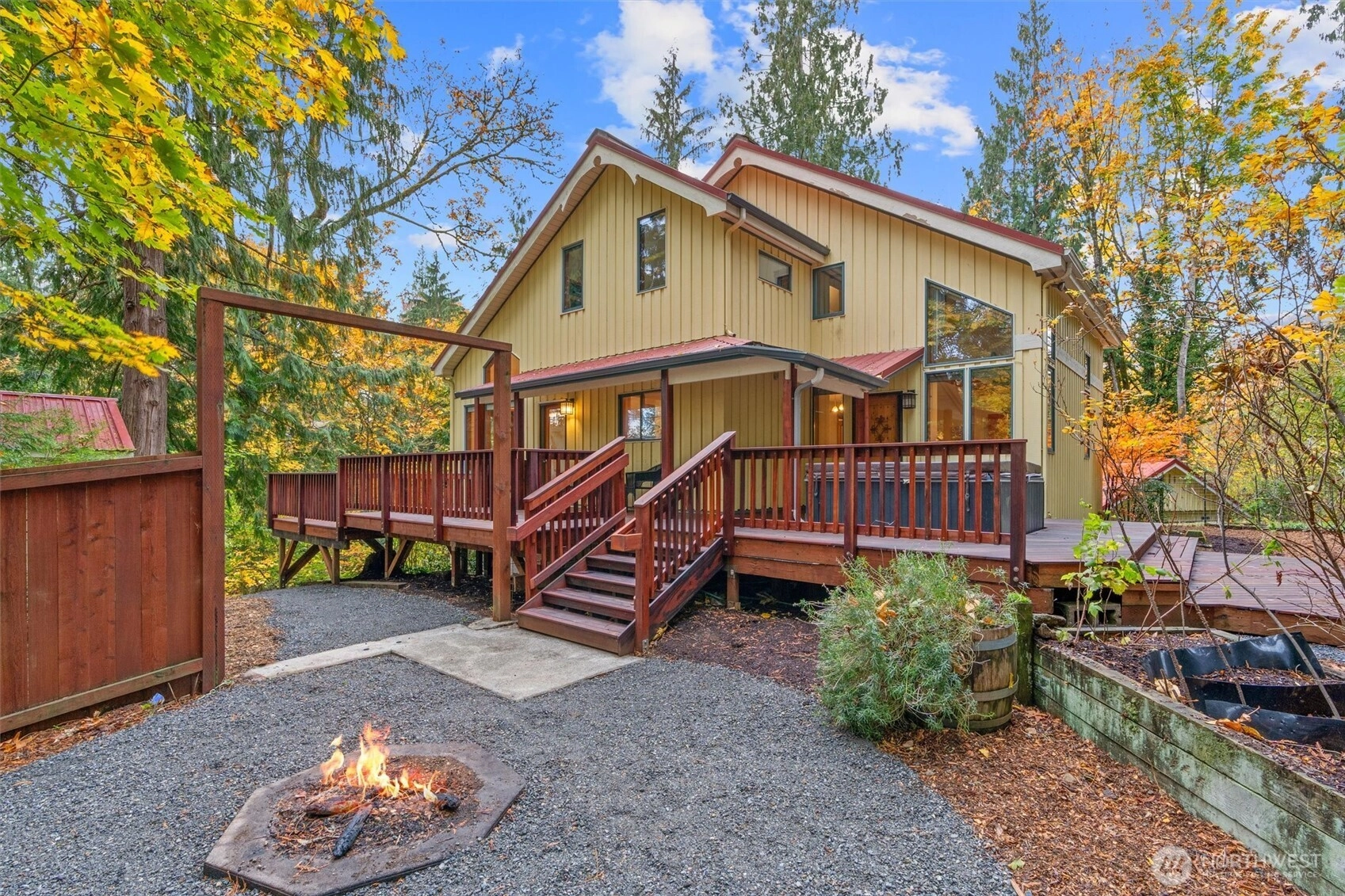 Stunning NW contemporary, secluded 1.3-acre setting, just 4 minutes to downtown Monroe. Vaulted ceilings & floor-to-ceiling windows flood the home w/ year-round natural light. Granite/stainless kitchen boasts 5-burner range & breakfast bar. Desirable main-level owner’s suite has access to the back deck & private hot tub. Fresh interior paint & new flooring. Efficient & quiet in-floor radiant heat & durable metal roof. Expansive tropical hardwood deck —ideal for entertaining. Lower level features a family room & spaces for office or gym. Oversized insulated 2-bay garage with 10 ft doors & 110-amp service, storage loft, plus outbuilding, fenced yard, raised garden beds & chicken coop. Peaceful rural vibe, quick access to schools, shops, SR-2