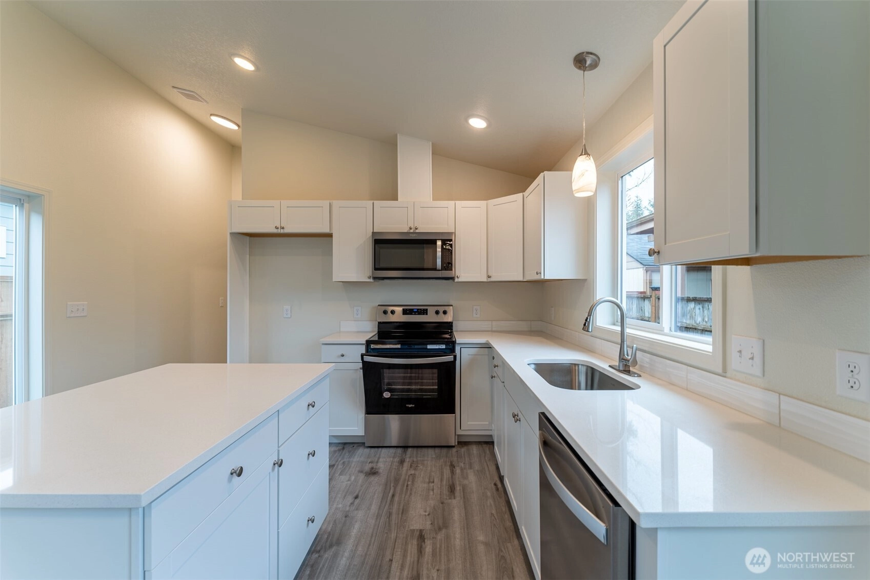 Tucked away with a modern yet cozy feel, this thoughtfully designed home is the perfect mix of comfort and style. The open layout features vaulted ceilings and large windows that fill the space with light, while the sleek vinyl flooring and clean finishes tie it all together. The kitchen shines with white shaker cabinets, quartz countertops, and stainless steel appliances, ideal for everything from a quiet morning coffee to weekend entertaining. Step outside to enjoy evening BBQs or unwind on the patio. Complete with a mini-split system for heating and cooling and a full four-season insulation package, this petite modern haven is ready for easy living all year long.