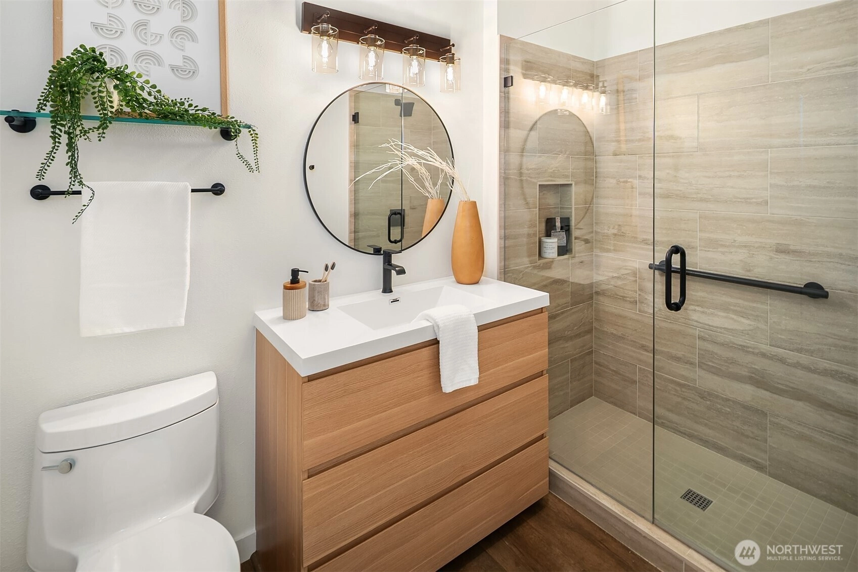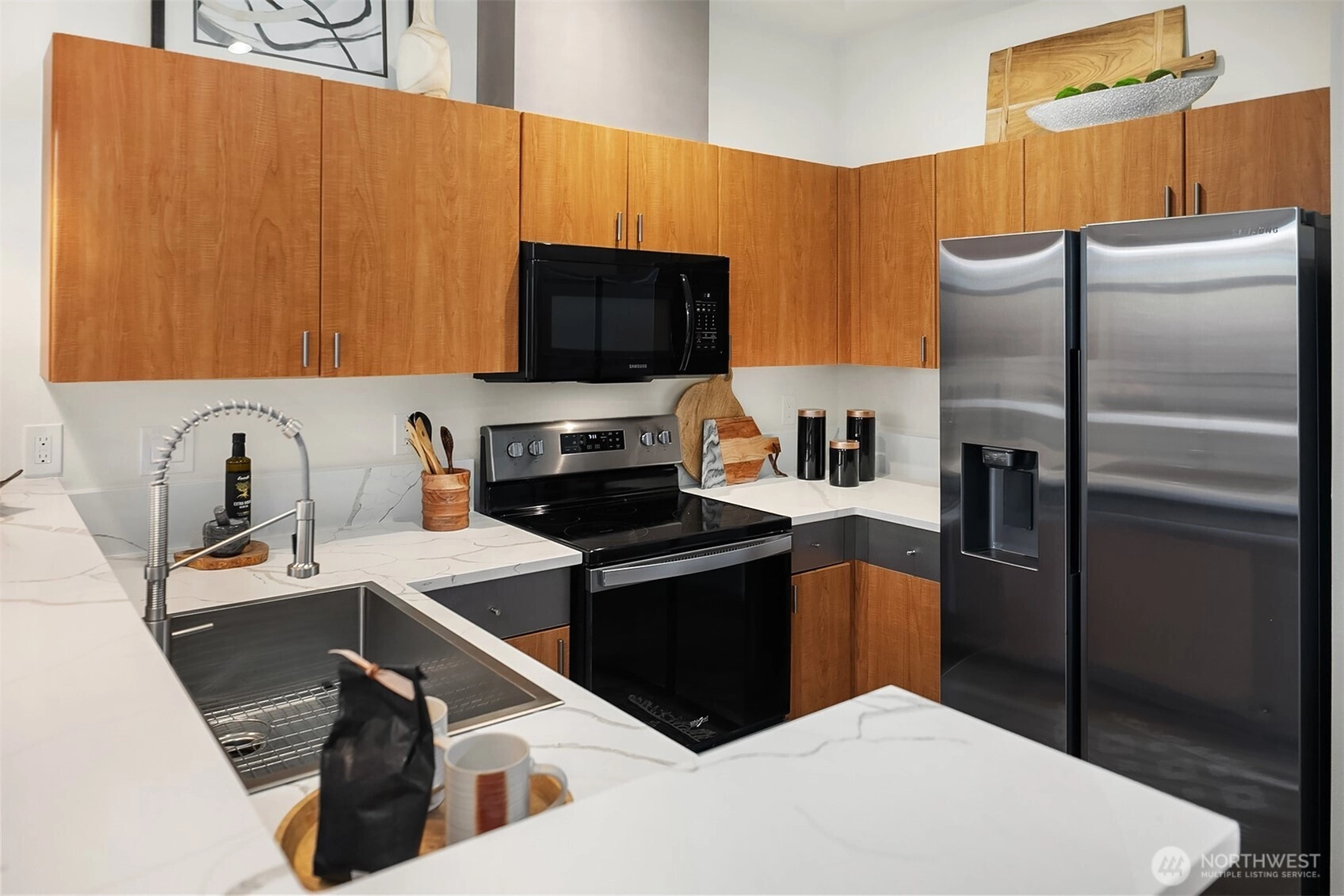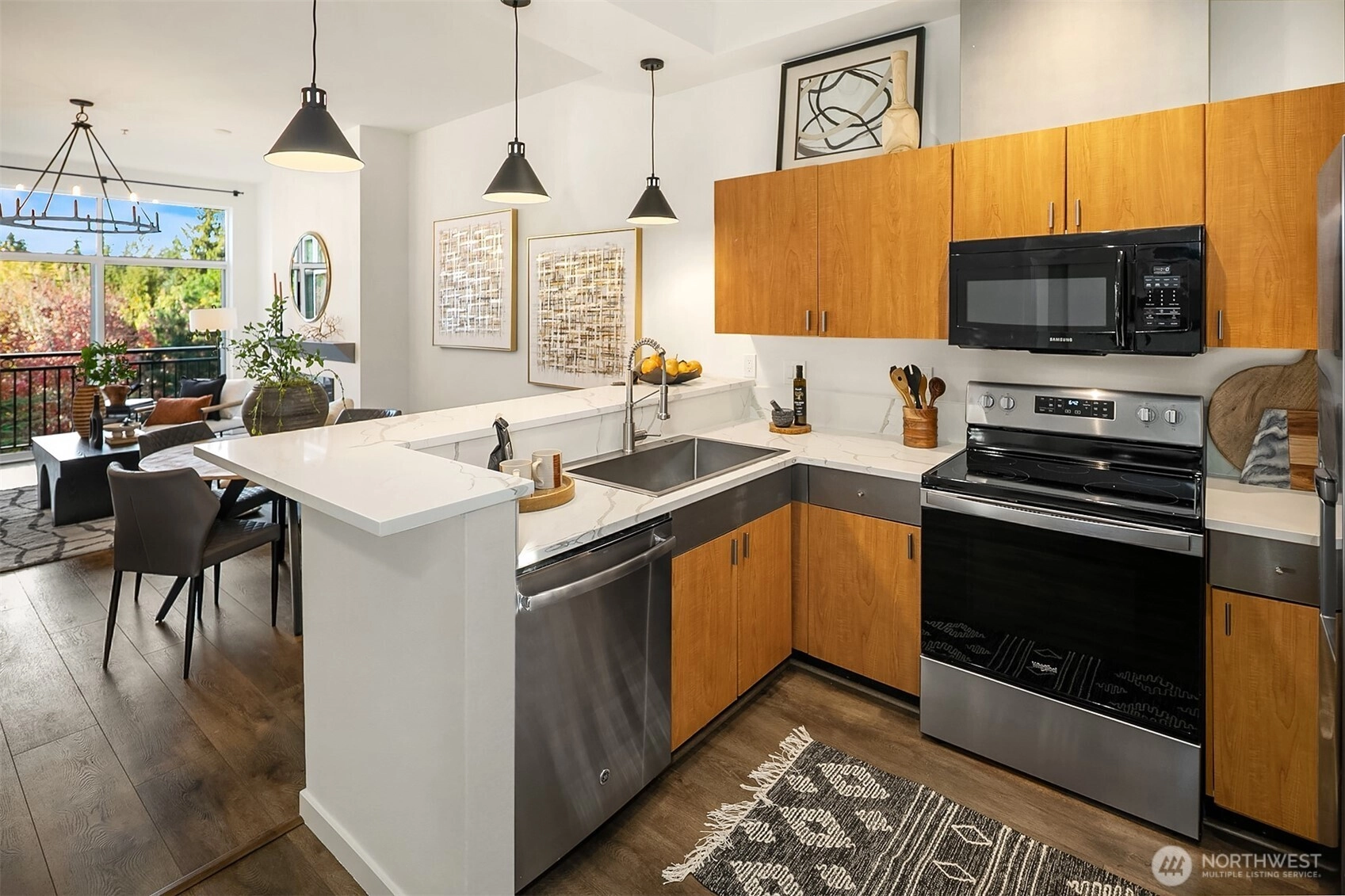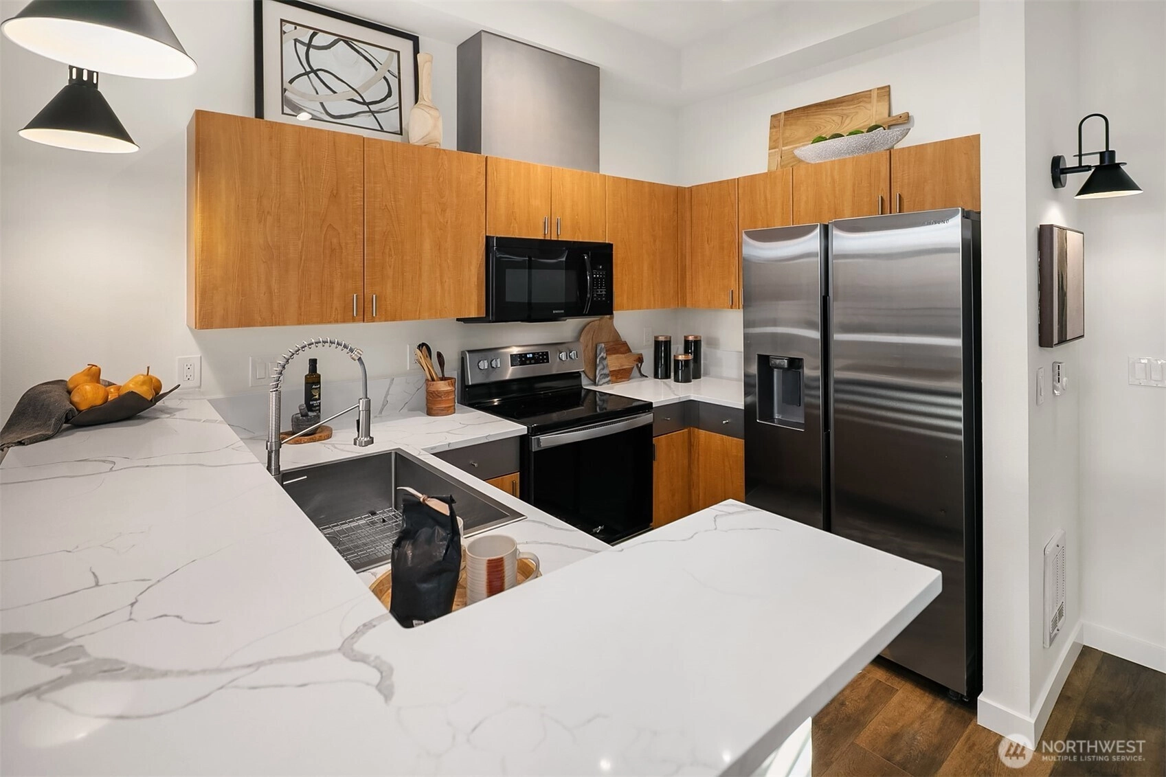 Stunning Penthouse Living in Downtown Kirkland. Experience modern elegance in this penthouse condo in the vibrant heart of Kirkland. Enjoy clean lines and contemporary design with a spacious open floor plan, featuring a cozy fireplace and dedicated space for a desk or den. The chef's kitchen boasts new quartz countertops and appliances. With fresh flooring and custom lighting throughout, this unit is truly inviting. Bonus amenities include secured parking, a pet-friendly HOA with no rental cap, and the option for short-term rentals. Take advantage of easy access to the waterfront, dining, shopping, and trails. Nestled just blocks from the Google campus, enjoy convenient access to 405 and Eastside tech hubs. Affordable luxury awaits!