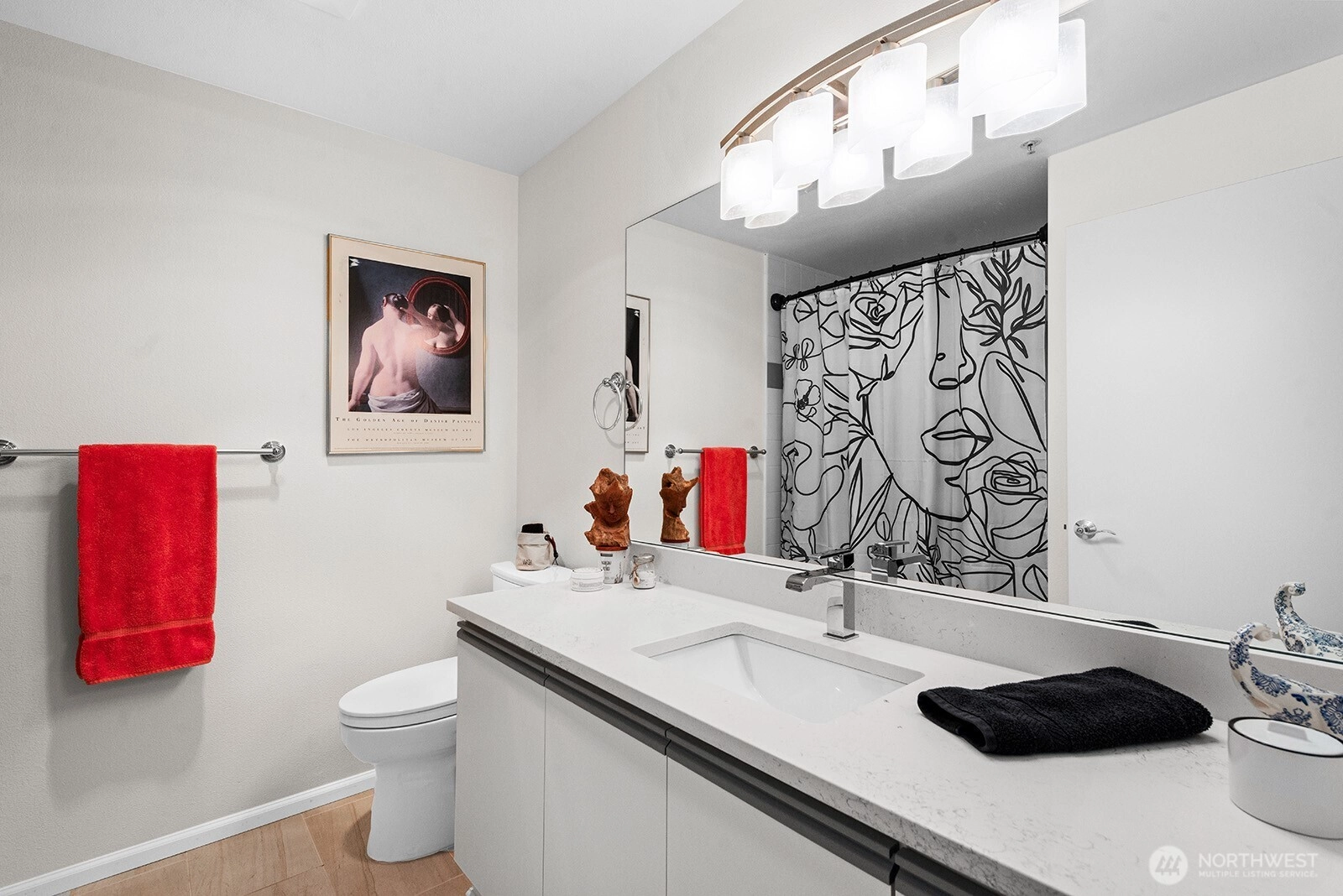 Stunning garden level end unit with covered patio, high ceilings, hardwoods, open dining & living room with wood burning fireplace. Professional remodel in 2024 includes kitchen and baths with quartz counters, ceramic tile floors, all new appliances including full size washer & dryer, carpet in both bedrooms. Spacious primary with walk-in closet, new tiled walk-in shower, floors. New wood slat blinds, new heaters, freshly painted throughout Garage parking plus extra parking in driveway. Guest parking, clubhouse w/gym, sauna & party room, walking & biking trails, beautiful water features & wildlife viewing. Wonderful community & location. Easy access to I5 N. & S. VETERANS can assume 5.75% 30 yr. fixed VA mortgage easily! A rare opportunity!