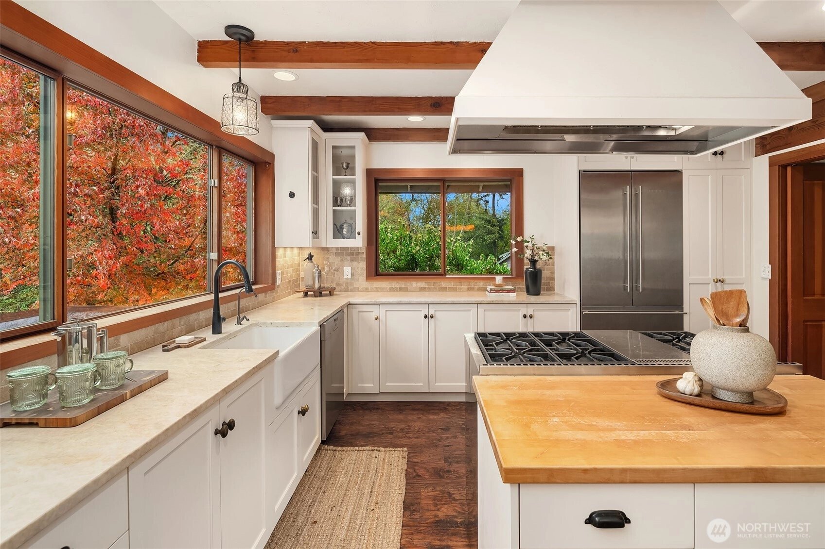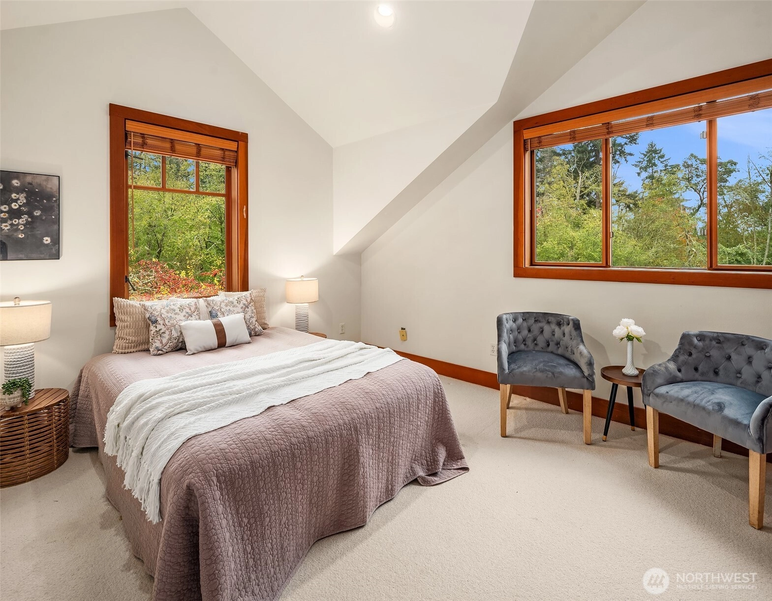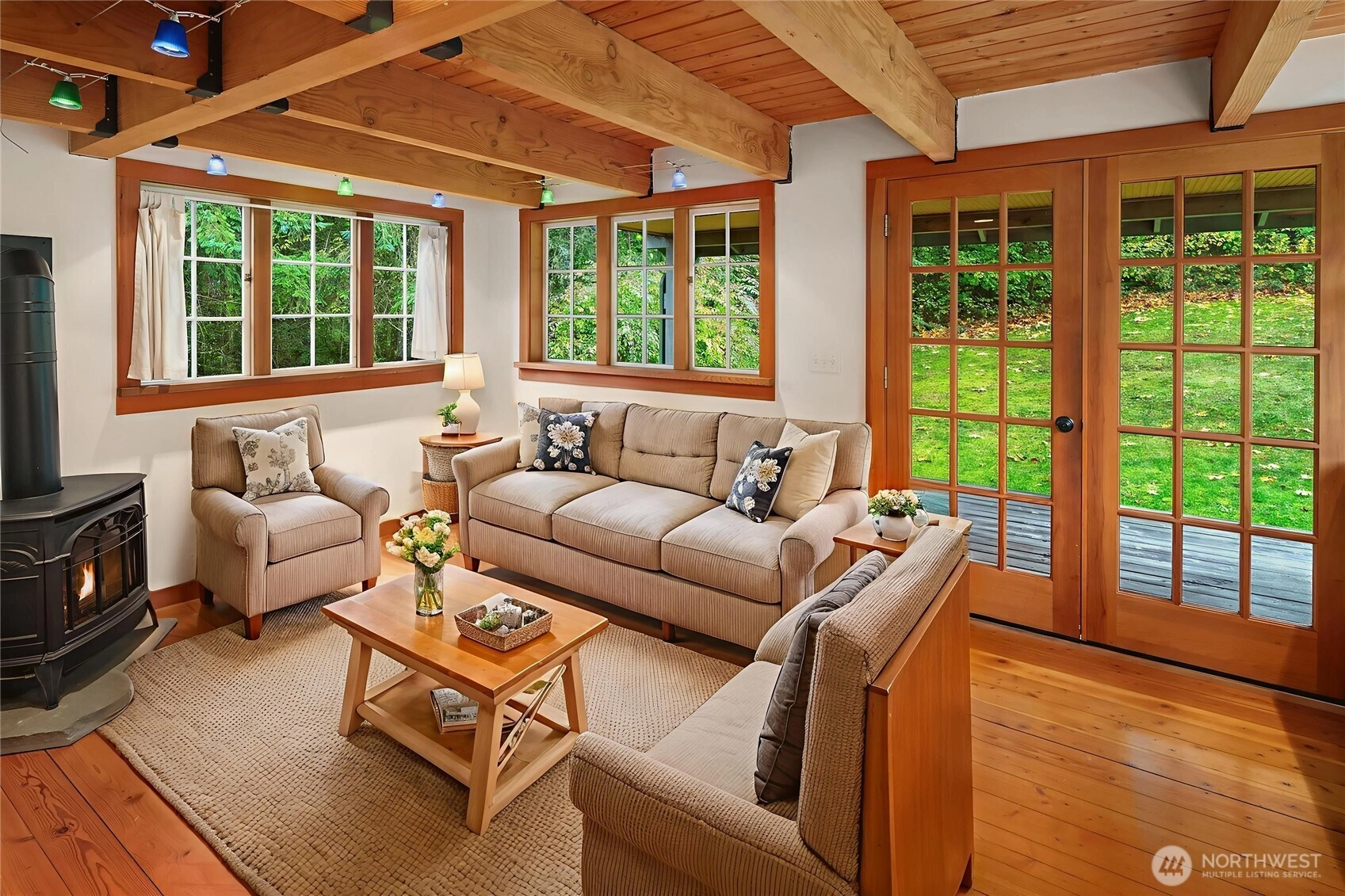 Set amid 14+ acres of pristine Northwest forest, this private enclave offers a rare blend of natural beauty and contemporary design. The gracious covered entry invites you into light-filled interiors where elegance meets modern comfort. French doors open to an expansive ironwood deck overlooking a private paradise framed by fruit trees & mature landscaping. The main-level primary extends outdoors to a private patio, hot tub & shower. High-end finishes ensure ease and sophistication, while modern amenities promise efficiency & comfort. The precious woodland cottage & 3 car garage + studio complete this extraordinary offering. Centrally located between downtown, schools, and the beach, delight in quiet abundance and comfort on Vashon Island!