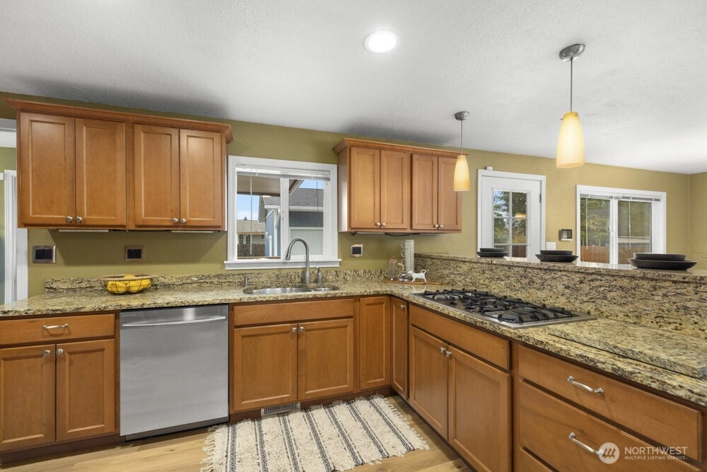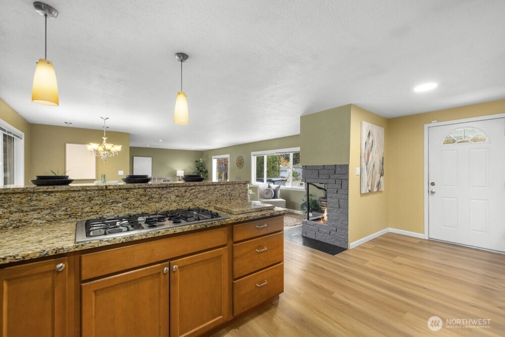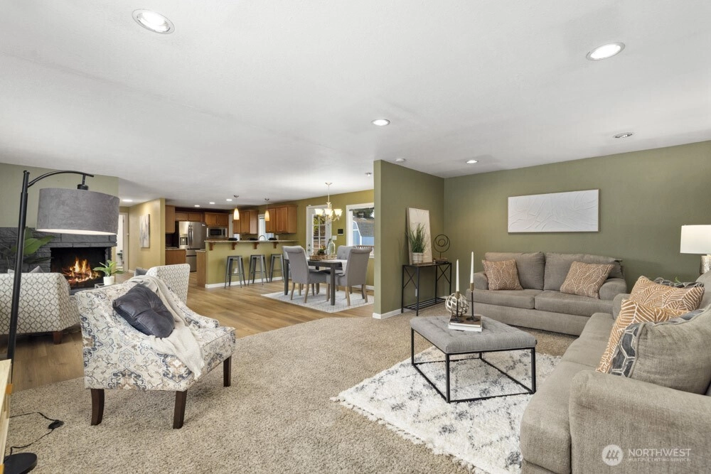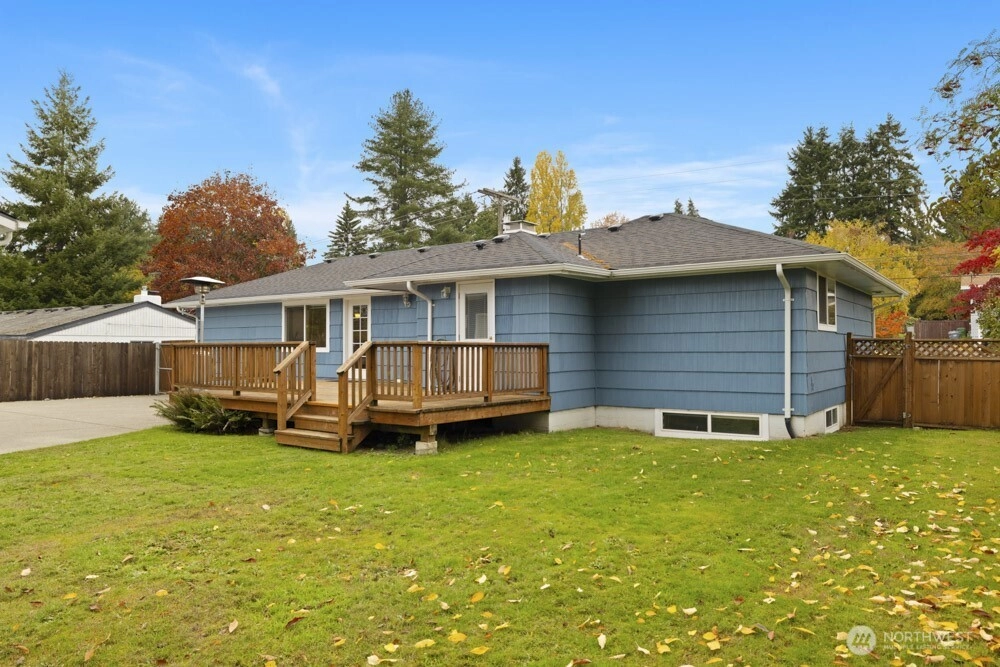 Beautifully maintained one-story home in University Place, with a fully finished basement and a bright, open layout. The main level features a light-filled living room with a unique corner fireplace, dining area, and kitchen, as well as the primary bedroom with an updated full ensuite bath, functional access to laundry and half bathroom for guests. The lower level includes a large additional living room with a second corner fireplace, two bedrooms, and a full bathroom—ideal for guests, office space, or flexible use. The detached three-car garage provides excellent parking and storage, plus an additional storage shed. Enjoy deck access off the dining room for easy indoor-outdoor flow. Close to parks, shopping, and restaurants.