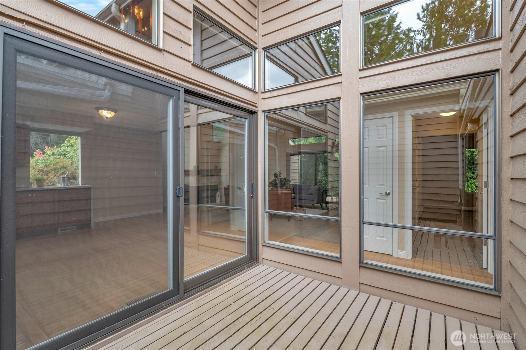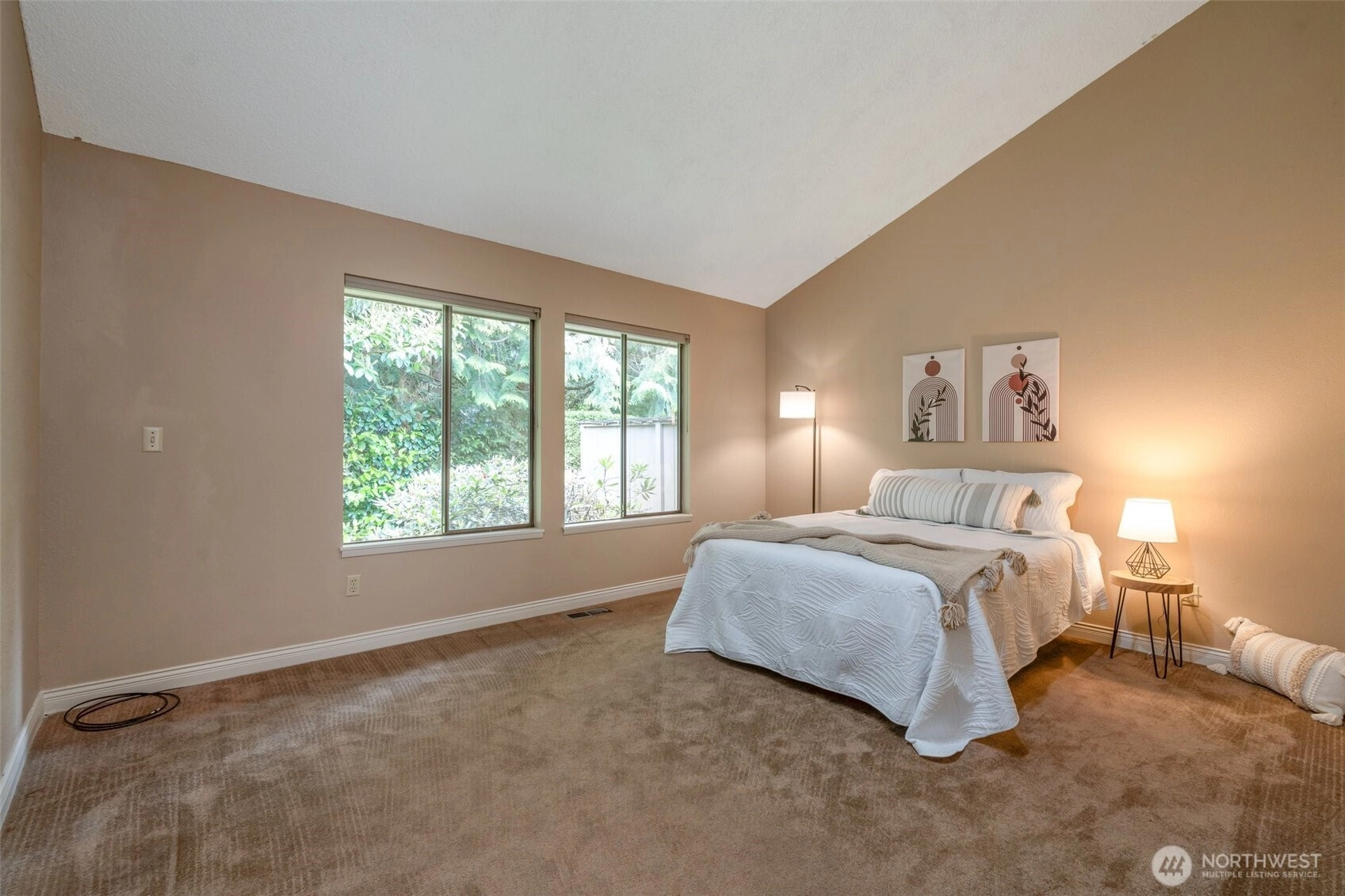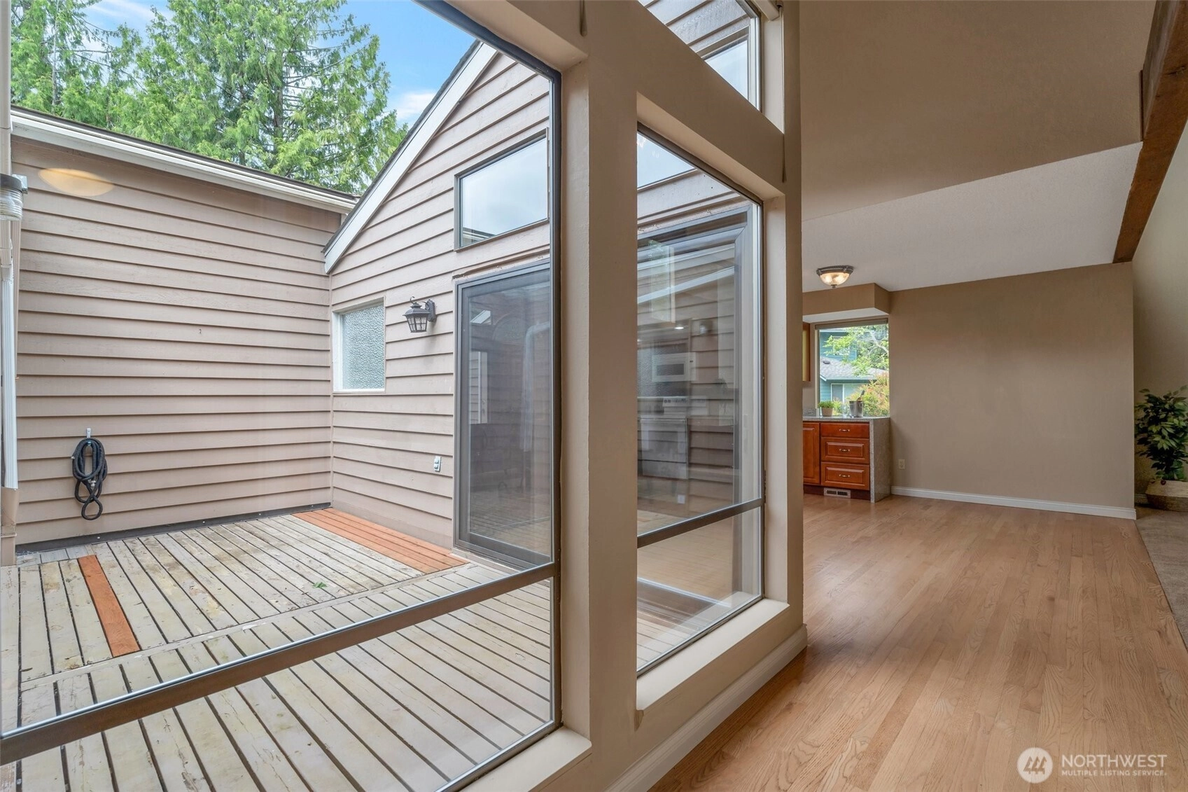 Welcome to Cedar Downs Village, a community of beautifully crafted townhomes. This one-level home features a bright living room with vaulted ceilings, a cozy fireplace, and a slider to a private deck overlooking natural landscape. The updated kitchen offers hardwood floors, new cabinets, granite countertops, and new appliances. The primary bedroom has dual closets and an ensuite bath. Remodeled bathrooms include quality fixtures and cabinetry. A second bedroom opens to a peaceful courtyard deck. Enjoy the convenience of an attached garage, new doors, millwork, blinds, and a walkable neighborhood.