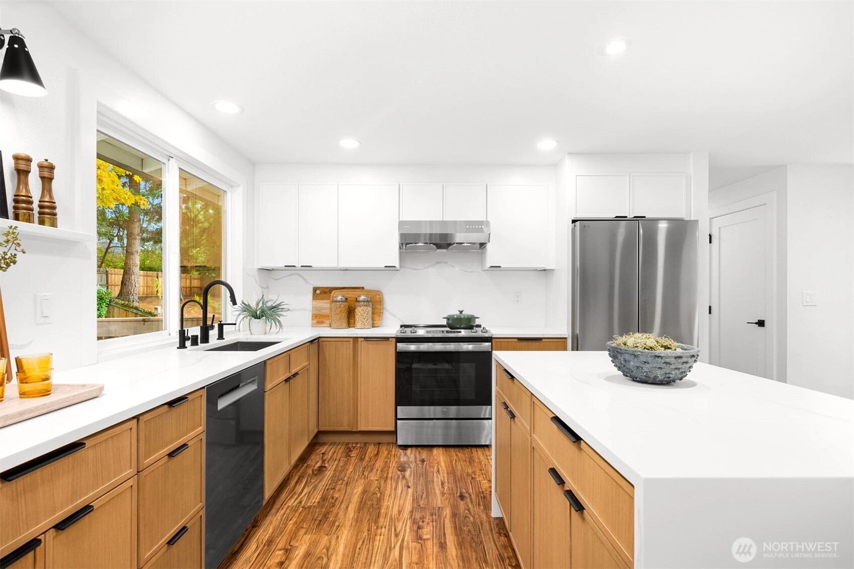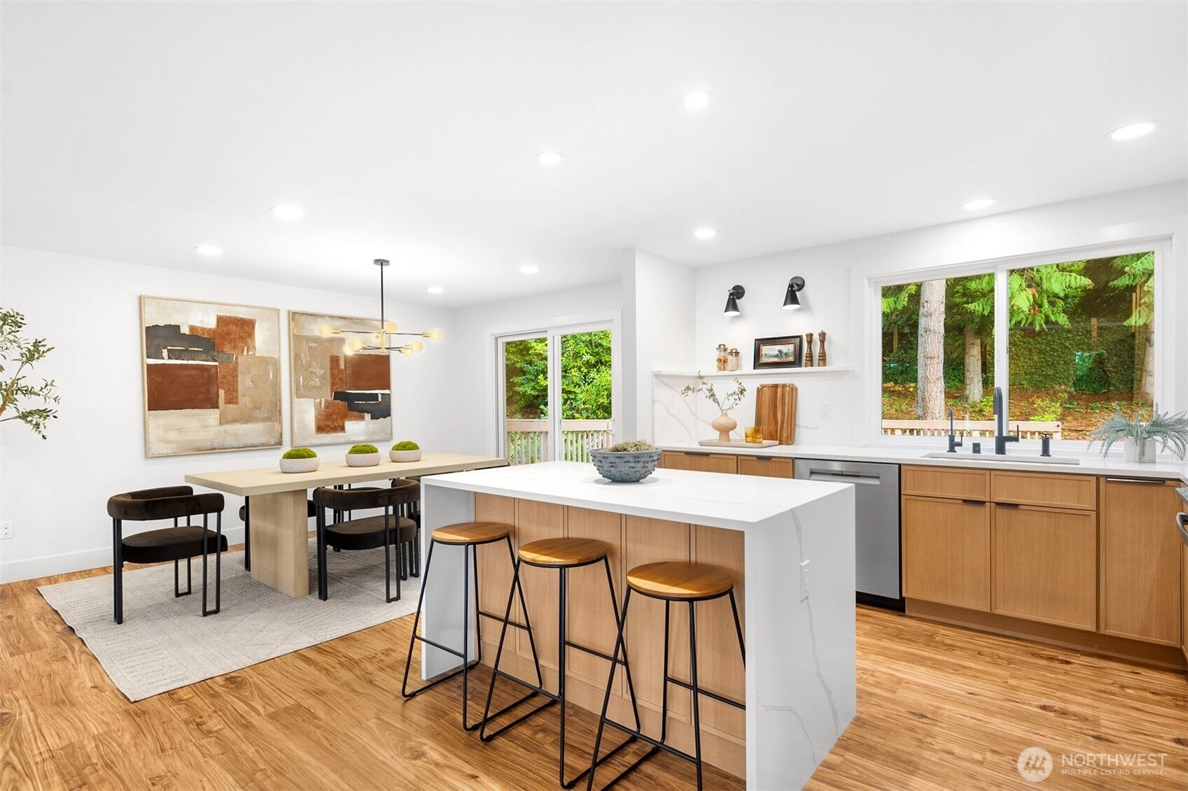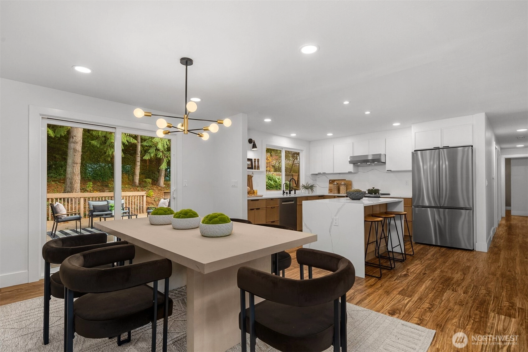 Beautifully renovated home on a quiet Education Hill cul-de-sac blending style, comfort, and functionality. 5 bedrooms in total 4 up, 1 down. The open upper level features a gas fireplace, dining area, and a stunning modern kitchen with sleek finishes and great natural light. Upstairs offers four bedrooms; the lower level adds a spacious family room with wood fireplace and a versatile 5th bedroom or bonus room. Updates include Milgard windows, fresh paint, A/C, EV outlet (30A), new driveway with RV parking, and a 600+ sq. ft. deck plumbed for gas BBQ. Fully fenced yard & w/ a generator hookup. Minutes to downtown Redmond, parks, light rail, and HWY 520 in top-rated Lake Washington schools.