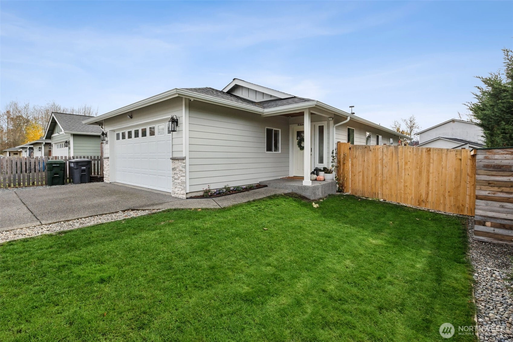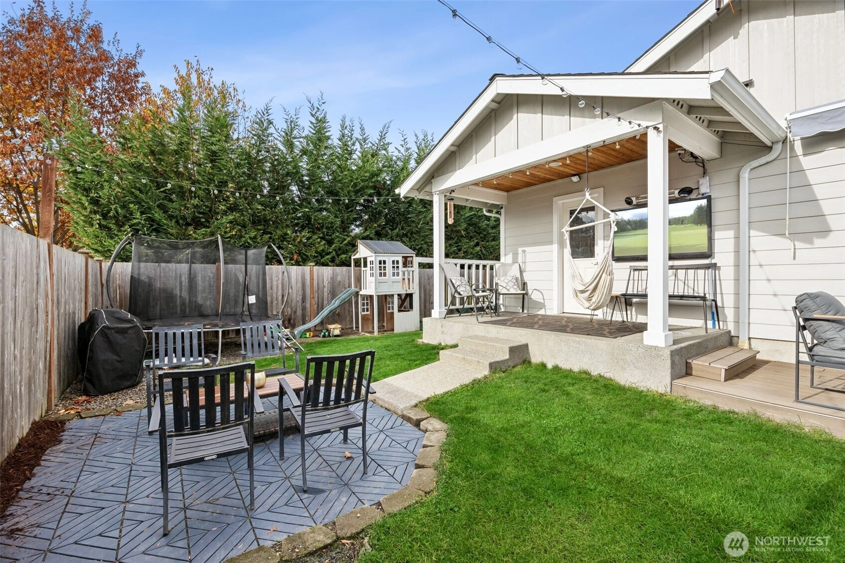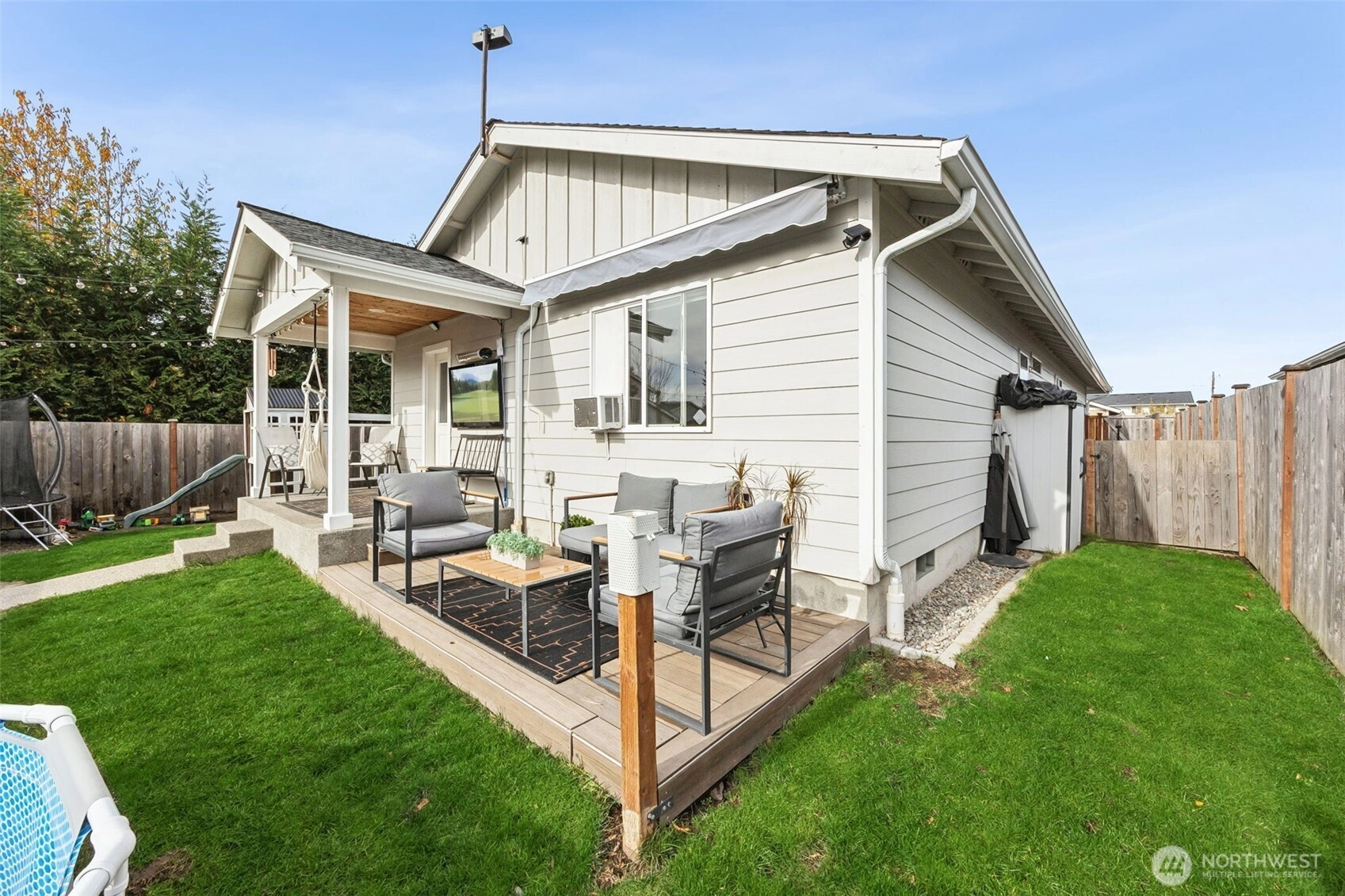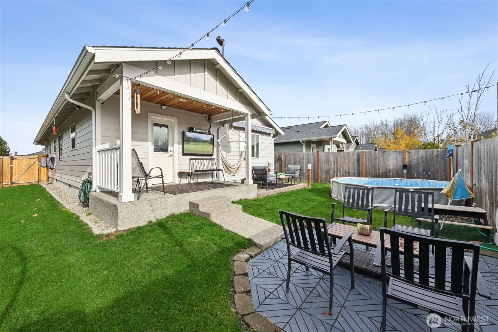 Welcome to this beautifully maintained 3 bedroom, 2 bathroom rambler, located within walking distance of downtown Buckley. This home blends cozy cottage charm with modern finishes. Enjoy an open-concept living space with vaulted ceilings, fresh paint, and updated fixtures and lighting throughout. A stone-detailed fireplace adds warmth and character for the colder months. Outside, the fully fenced backyard offers space for a garden, trampoline, or pool play area. Relax on the covered patio and extended deck adorned with twinkle lights. This inviting home offers small-town charm, modern style, and easy access to everything you need.