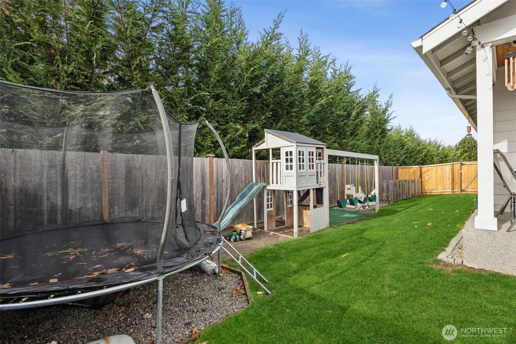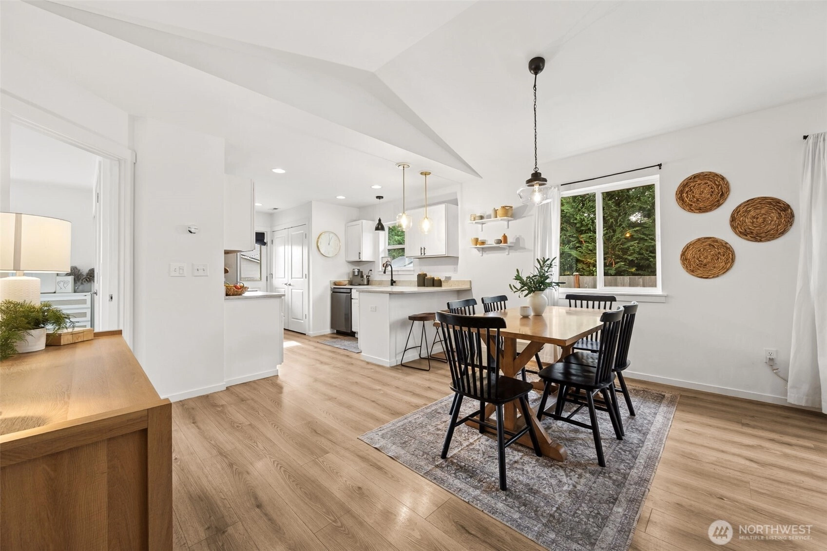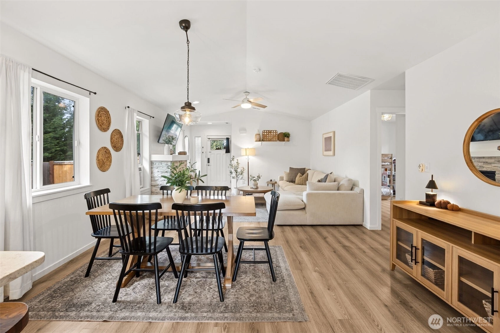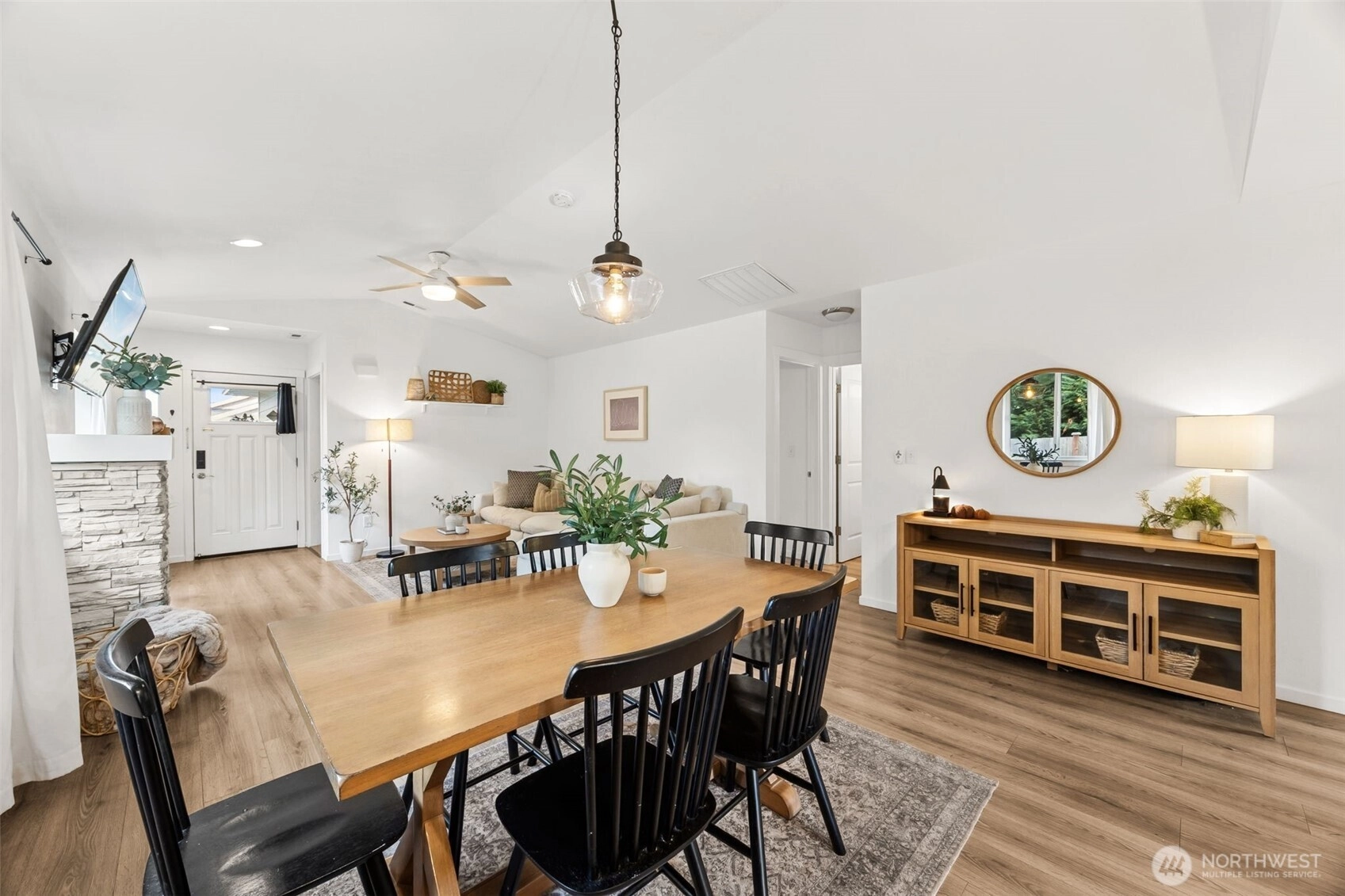 Welcome to this beautifully maintained 3 bedroom, 2 bathroom rambler, located within walking distance of downtown Buckley. This home blends cozy cottage charm with modern finishes. Enjoy an open-concept living space with vaulted ceilings, fresh paint, and updated fixtures and lighting throughout. A stone-detailed fireplace adds warmth and character for the colder months. Outside, the fully fenced backyard offers space for a garden, trampoline, or pool play area. Relax on the covered patio and extended deck adorned with twinkle lights. This inviting home offers small-town charm, modern style, and easy access to everything you need.