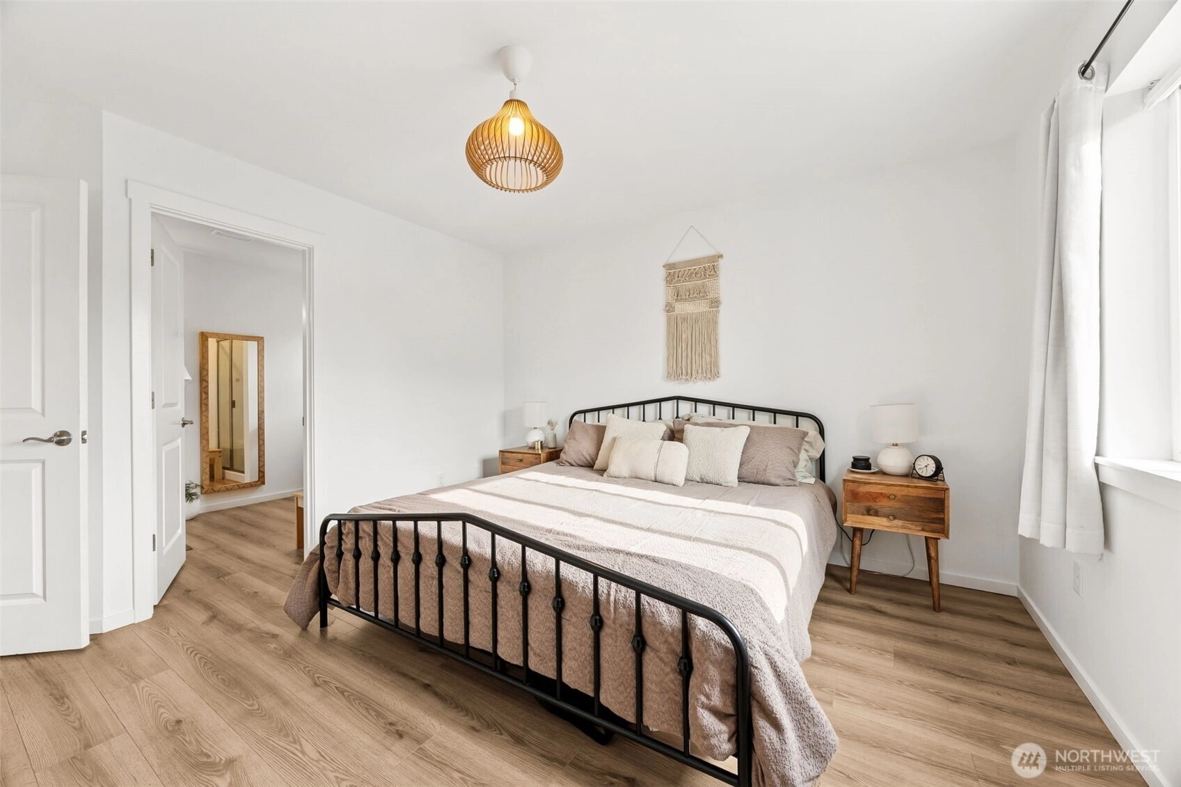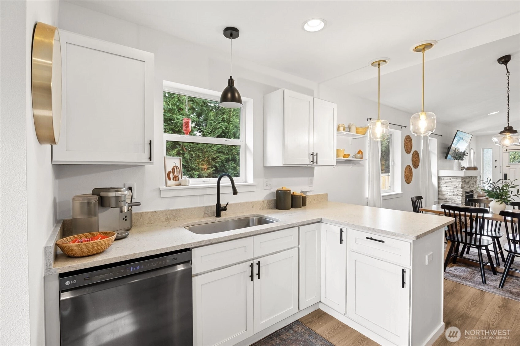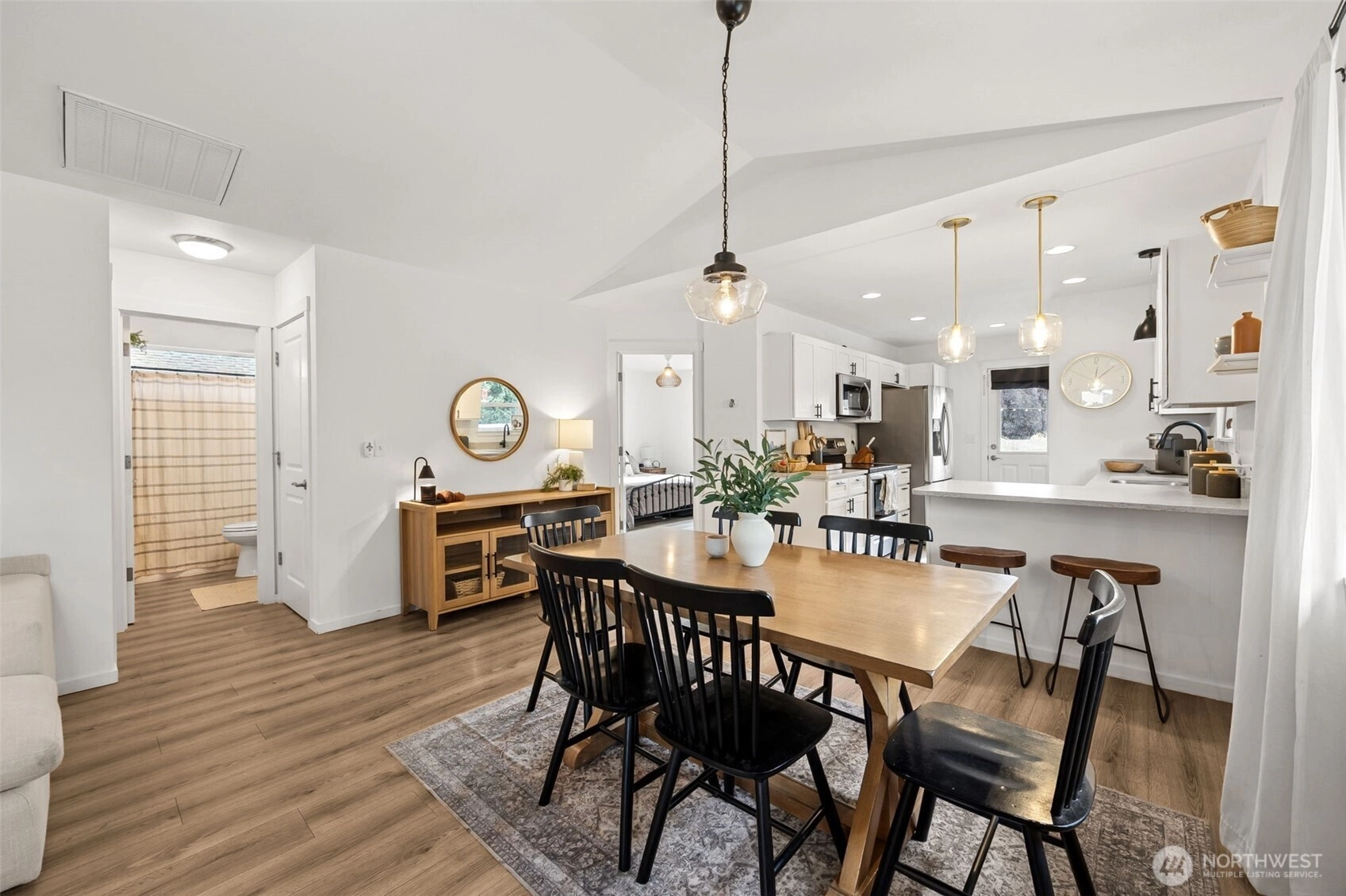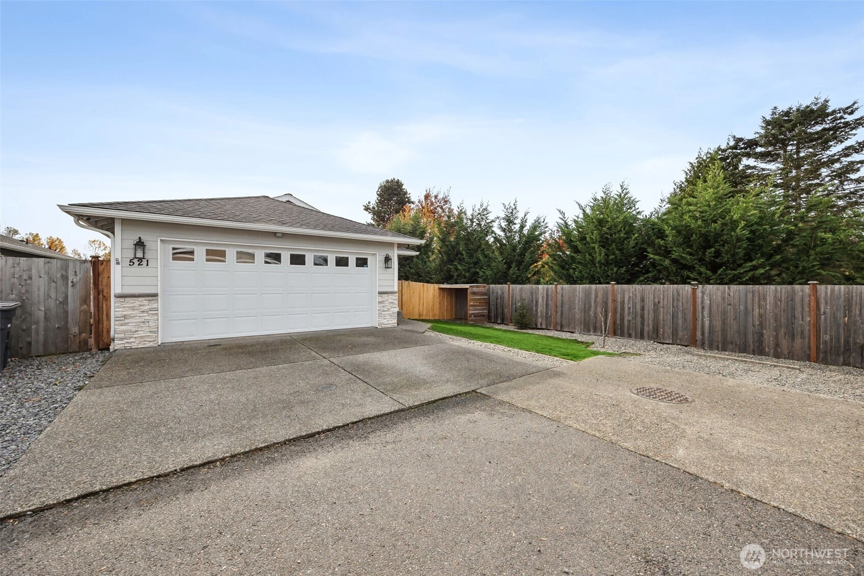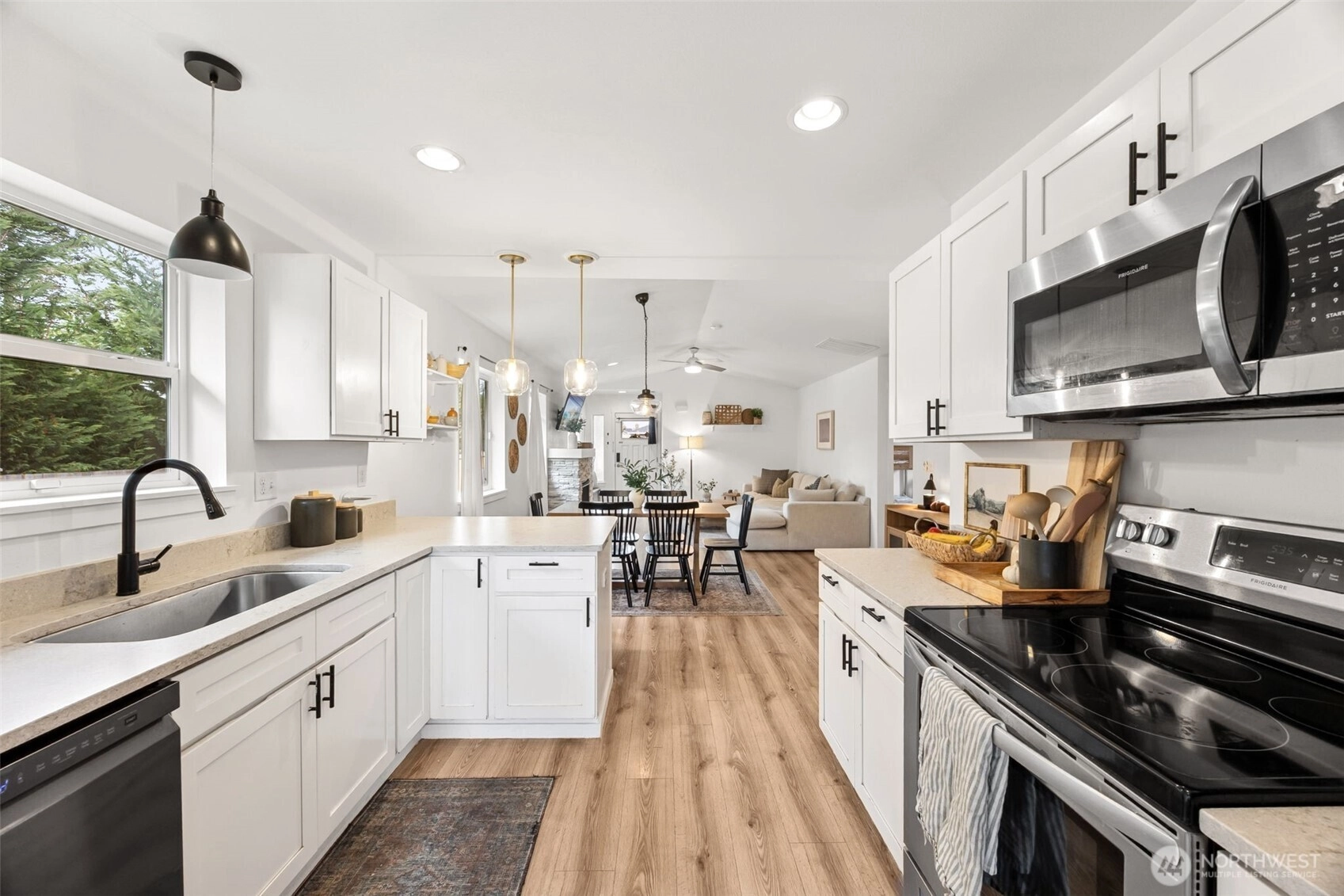Welcome to this beautifully maintained 3 bedroom, 2 bathroom rambler, located within walking distance of downtown Buckley. This home blends cozy cottage charm with modern finishes. Enjoy an open-concept living space with vaulted ceilings, fresh paint, and updated fixtures and lighting throughout. A stone-detailed fireplace adds warmth and character for the colder months. Outside, the fully fenced backyard offers space for a garden, trampoline, or pool play area. Relax on the covered patio and extended deck adorned with twinkle lights. This inviting home offers small-town charm, modern style, and easy access to everything you need.