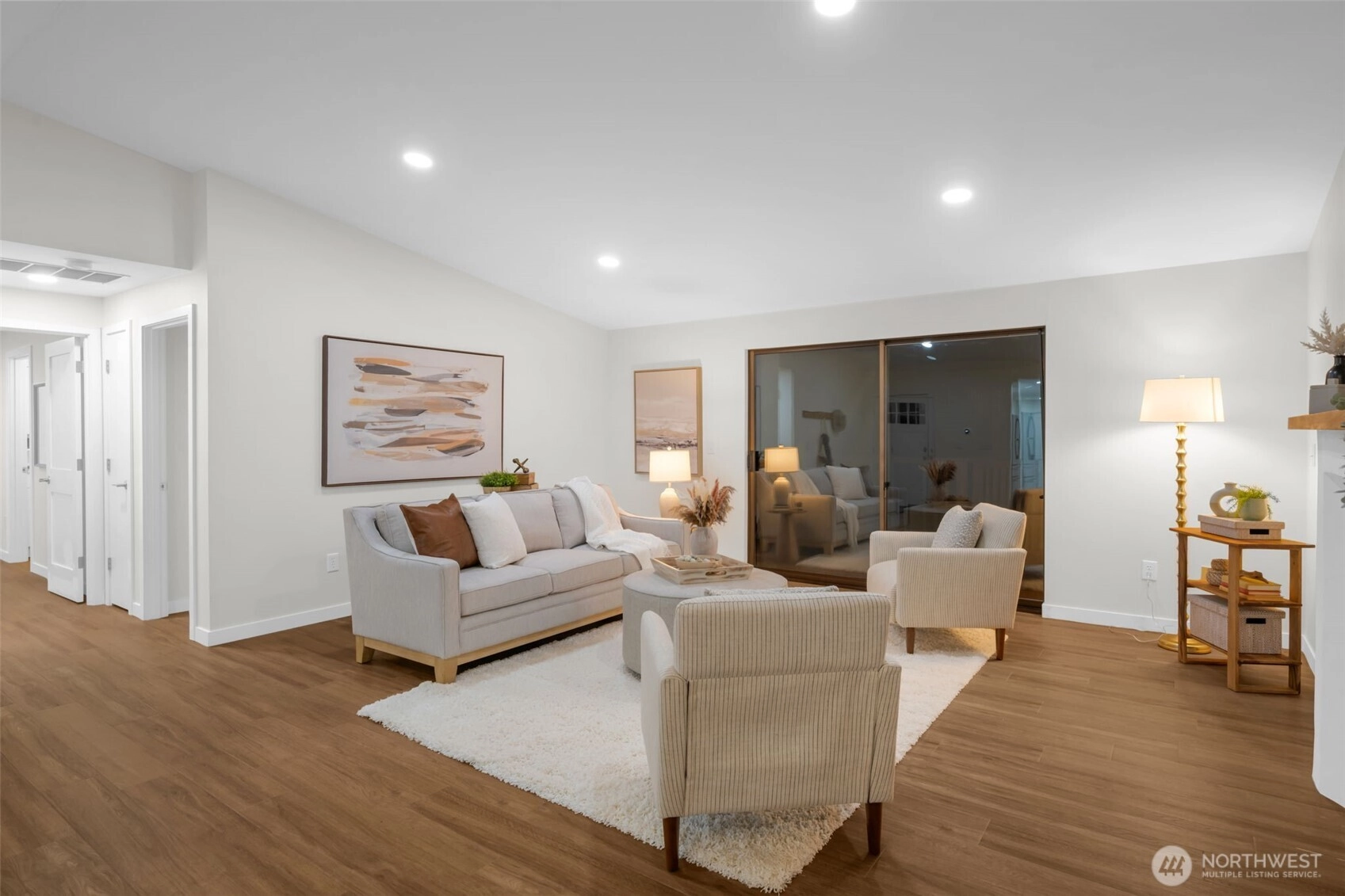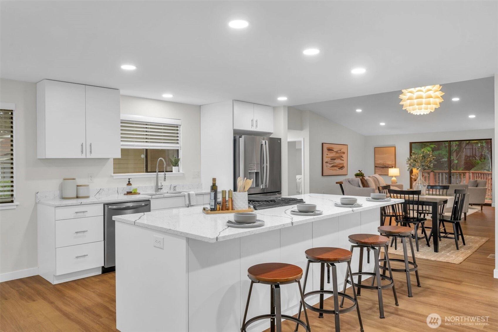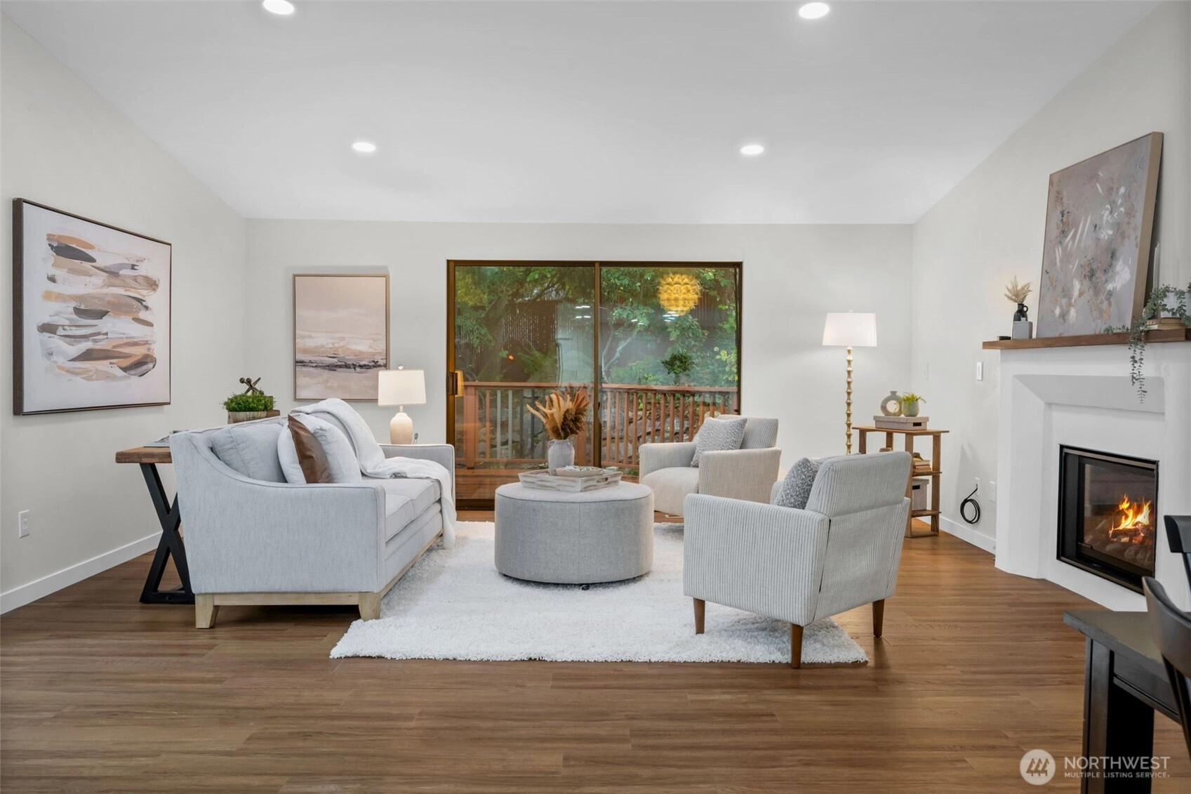 Fully remodeled Huntington Park Rambler! Great room style floor plan flowing over beautiful waterproof luxury vinyl flooring. The living area is fashioned around a beautiful gas fireplace. A large sliding glass door lets in tons of natural light and leads to a deck and back yard surrounded by trees. The brand-new kitchen has white cabinets, quartz countertops and a huge island with seating, plus a walk-in panty with tons of storage. There is room for a kitchen table next to a second sliding glass door that leads to a patio w/ dedicated gas line for a BBQ. The primary suite is large with a full wall of closet space. The primary bathroom has a large walk-in shower & double sinks. Second bedroom and full bath. 2 car garage with sink