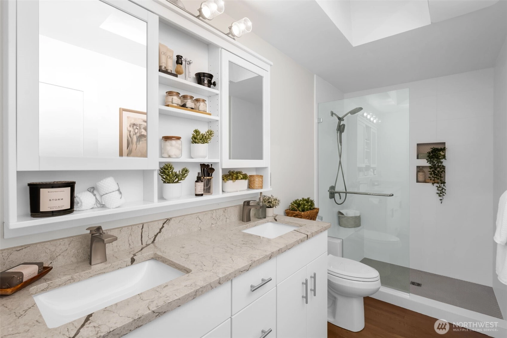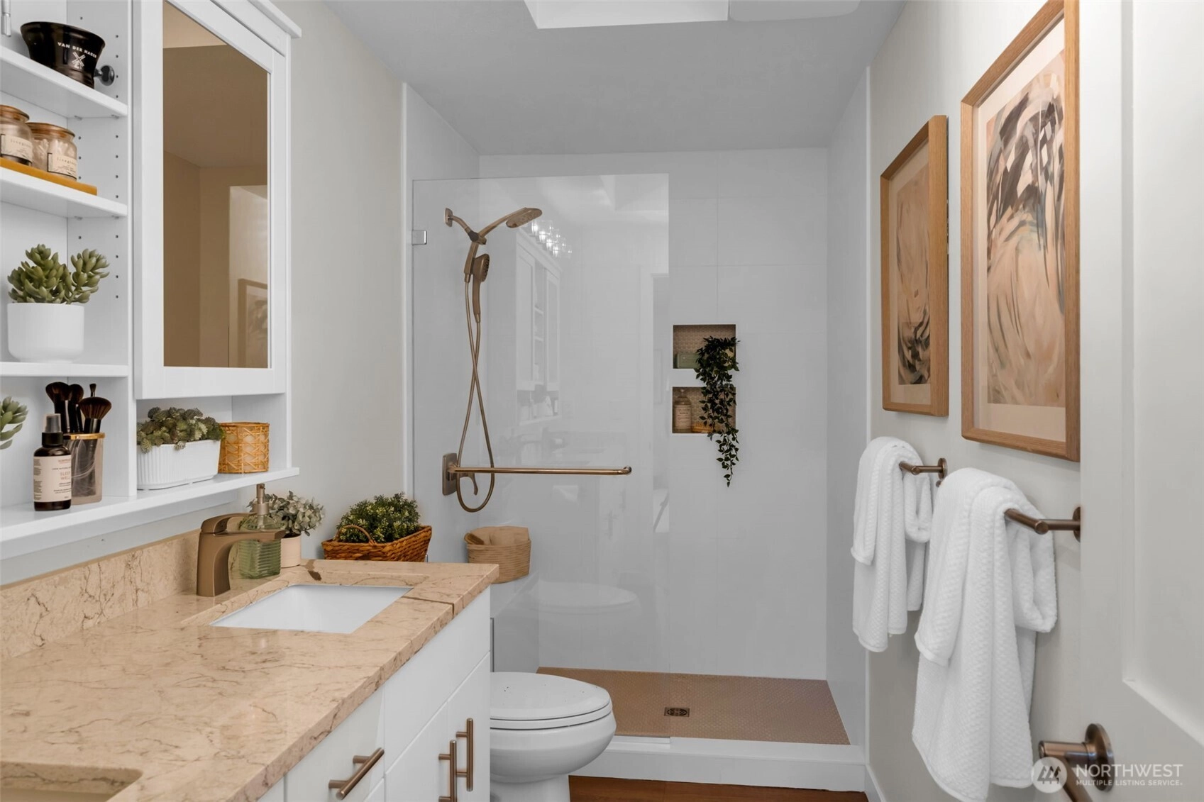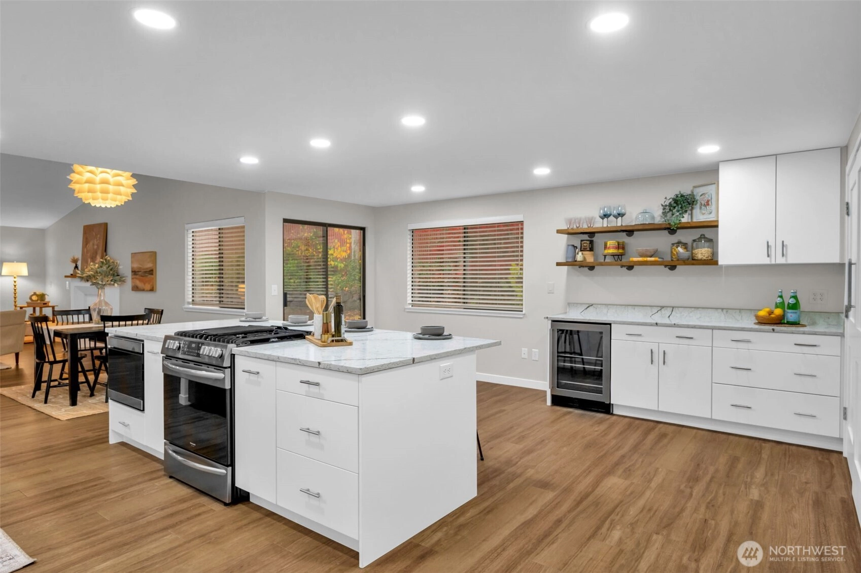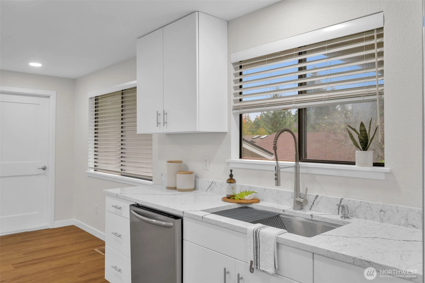 Fully remodeled Huntington Park Rambler! Great room style floor plan flowing over beautiful waterproof luxury vinyl flooring. The living area is fashioned around a beautiful gas fireplace. A large sliding glass door lets in tons of natural light and leads to a deck and back yard surrounded by trees. The brand-new kitchen has white cabinets, quartz countertops and a huge island with seating, plus a walk-in panty with tons of storage. There is room for a kitchen table next to a second sliding glass door that leads to a patio w/ dedicated gas line for a BBQ. The primary suite is large with a full wall of closet space. The primary bathroom has a large walk-in shower & double sinks. Second bedroom and full bath. 2 car garage with sink