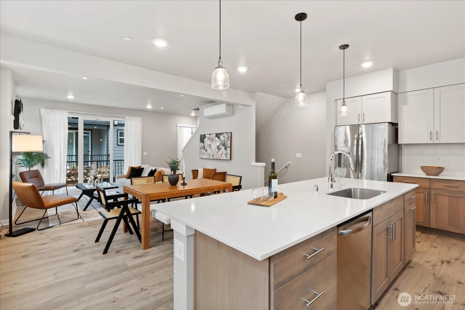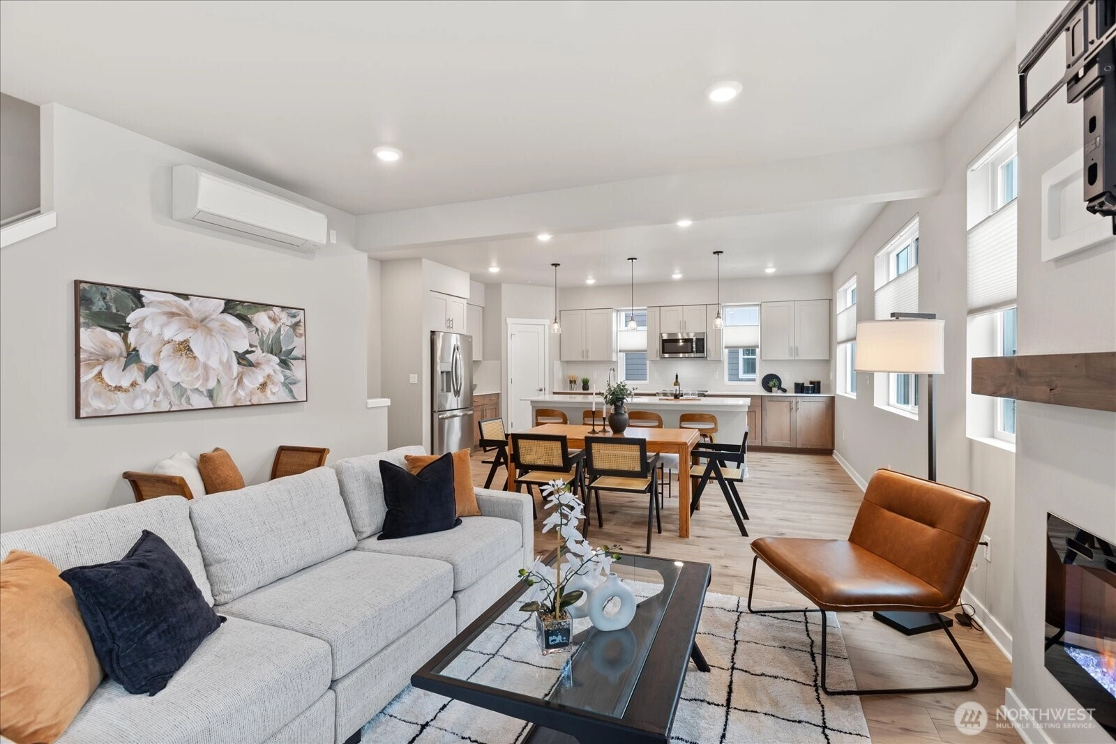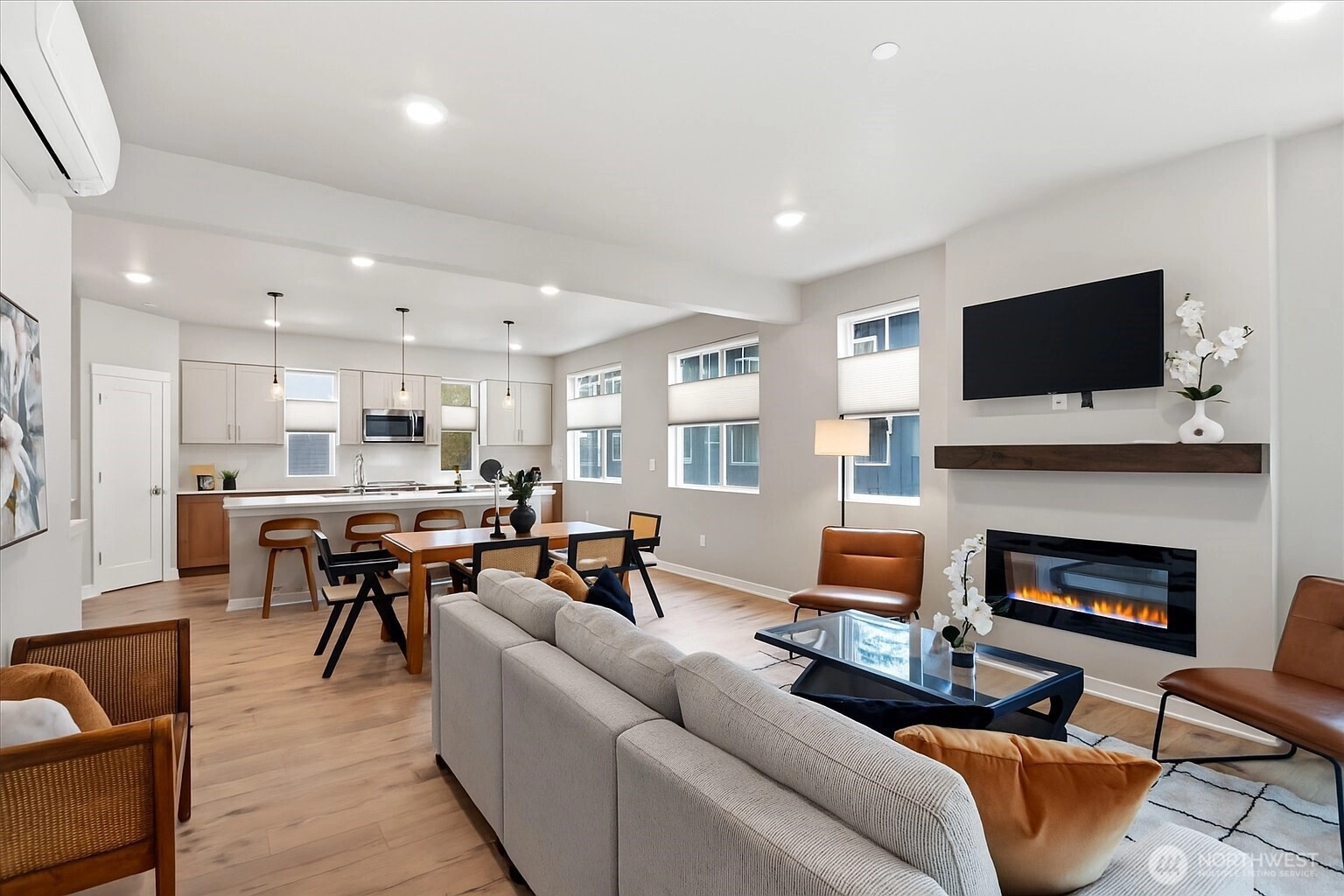 Step into this spacious, light-filled home where modern style meets everyday functionality. The entertainer’s kitchen features a large island perfect for gatherings, shaker-style soft-close cabinetry, quartz counters, a full-height backsplash, and ample storage. Relax by the electric fireplace with a custom mantel or retreat to the stunning primary suite with a spa-inspired bath and walk-in closet. Enjoy quartz surfaces and LVP flooring throughout, upgraded up/down cellular shades, and mini-splits for efficient comfort. Outdoor living shines with a deck and built-in heater, plus EV charger, garage shelving, and upgraded appliances. Easy commuter access, close to shopping, dining, and trails, refined, contemporary living at its best.