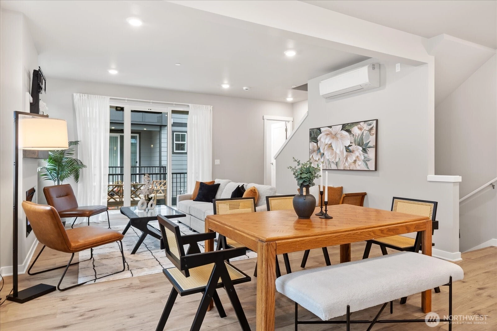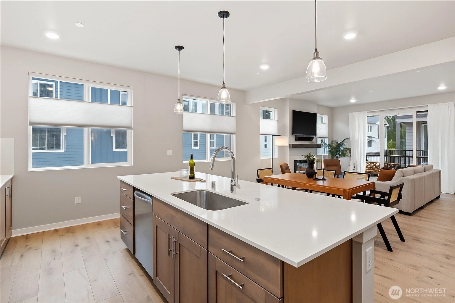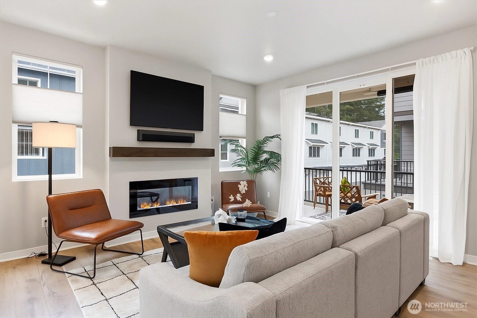 Step into this spacious, light-filled home where modern style meets everyday functionality. The entertainer’s kitchen features a large island perfect for gatherings, shaker-style soft-close cabinetry, quartz counters, a full-height backsplash, and ample storage. Relax by the electric fireplace with a custom mantel or retreat to the stunning primary suite with a spa-inspired bath and walk-in closet. Enjoy quartz surfaces and LVP flooring throughout, upgraded up/down cellular shades, and mini-splits for efficient comfort. Outdoor living shines with a deck and built-in heater, plus EV charger, garage shelving, and upgraded appliances. Easy commuter access, close to shopping, dining, and trails, refined, contemporary living at its best.