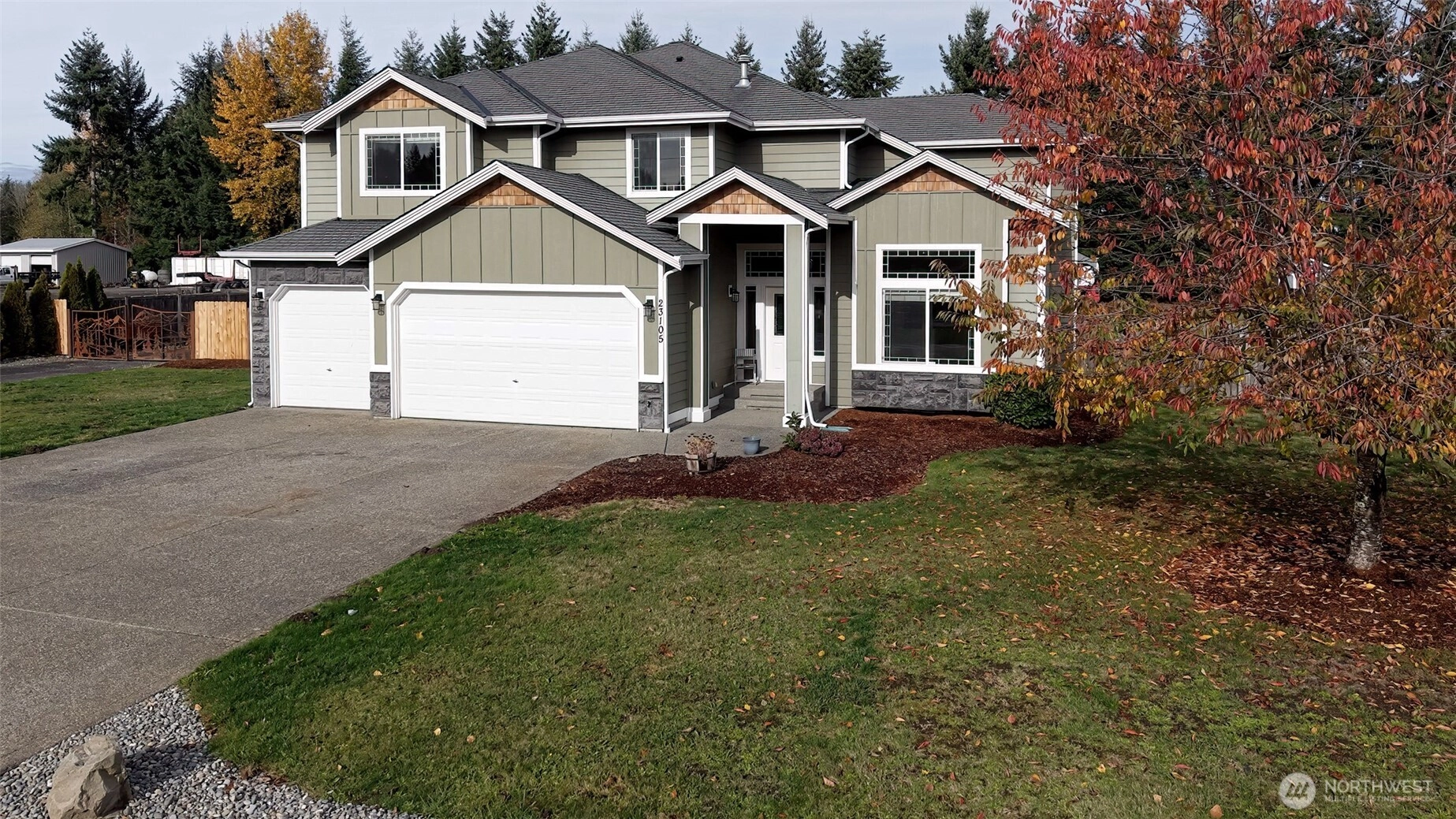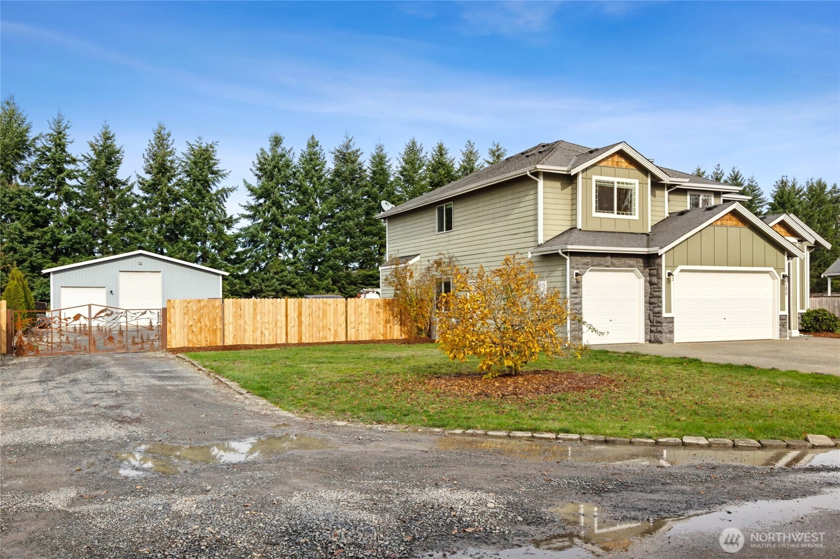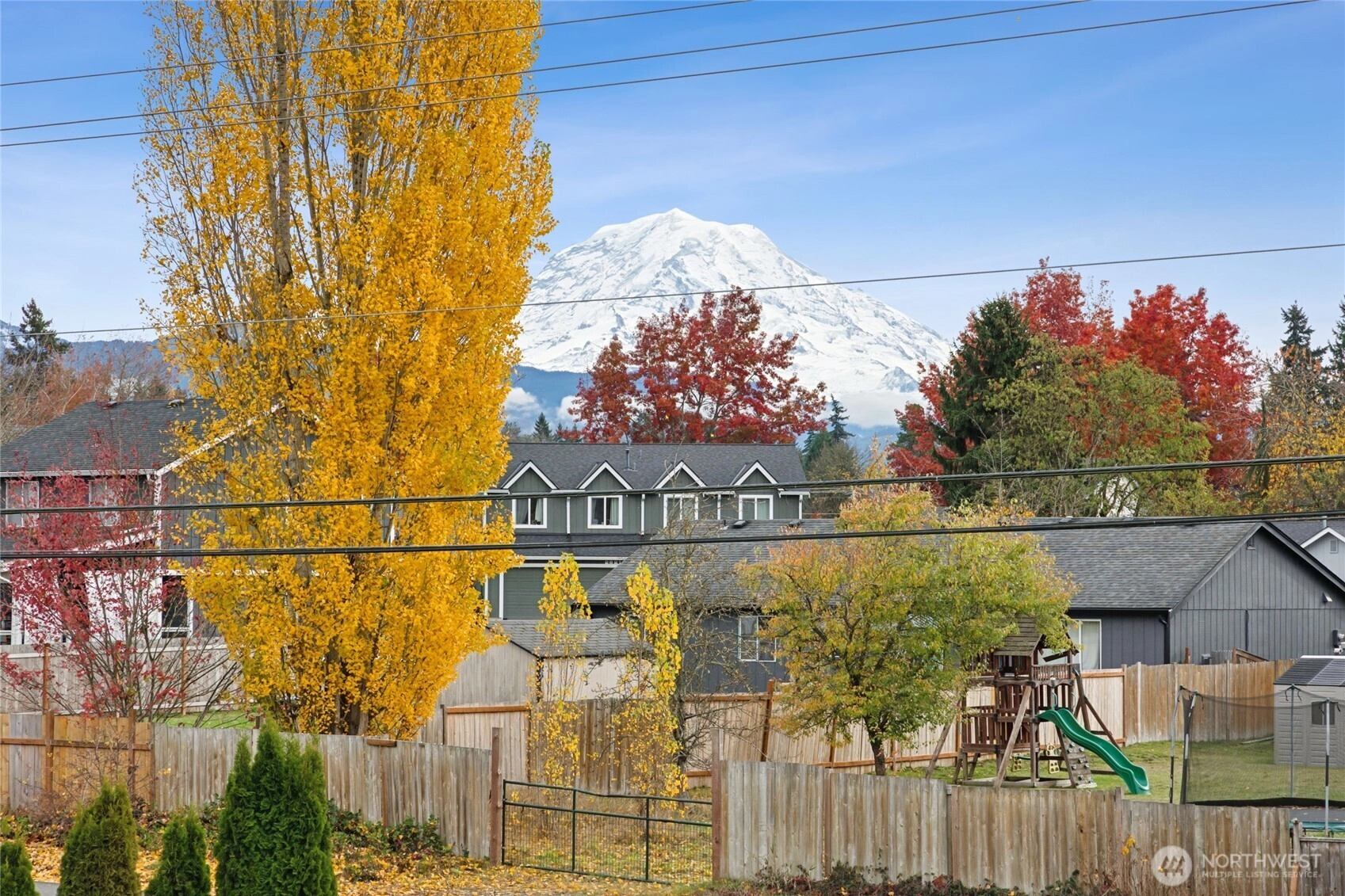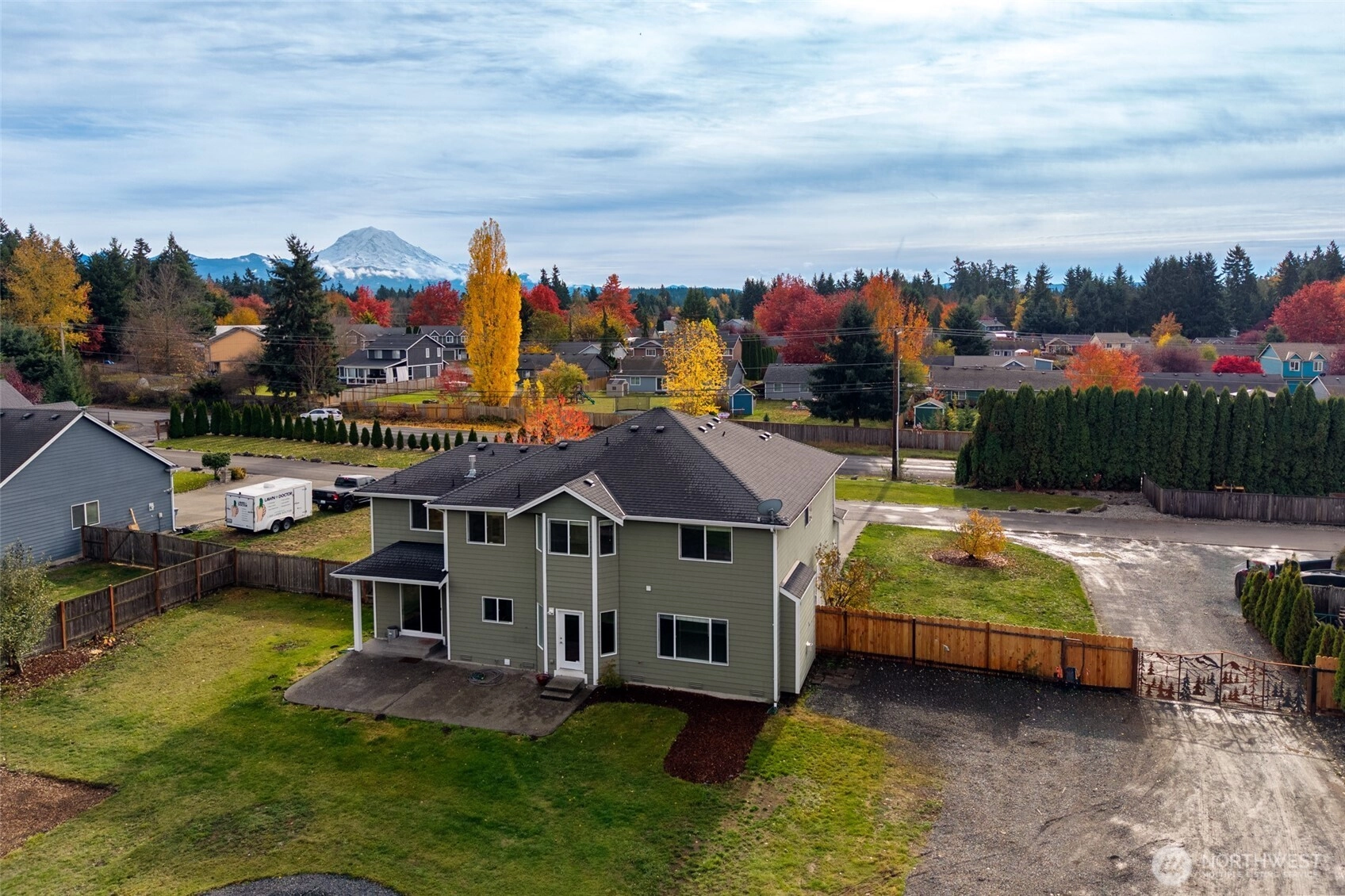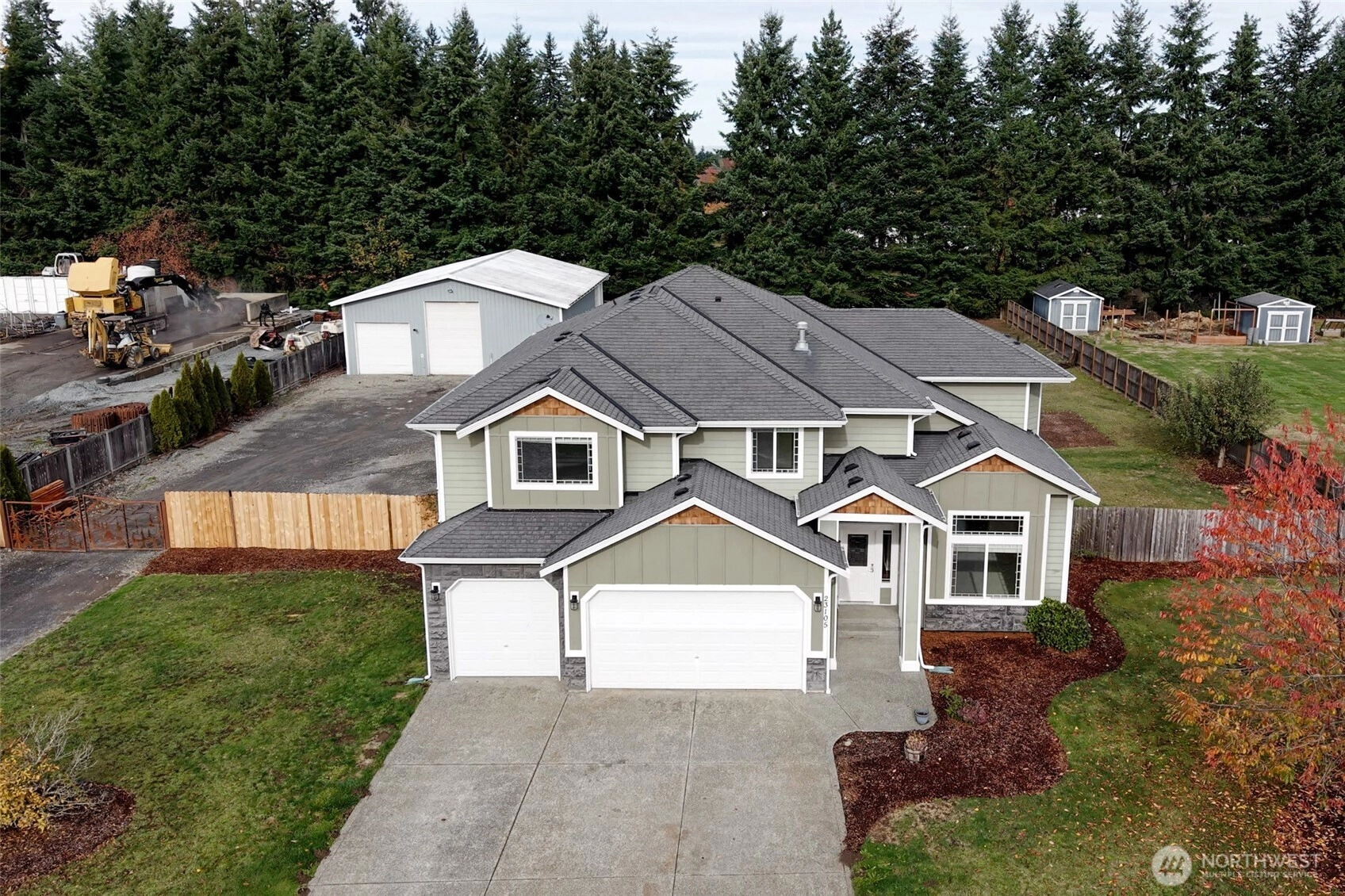 No HOA! Beautifully maintained home on a full, level acre. Fresh updates: new countertops, interior paint, new carpet, fixtures/lighting, & new stove! Spacious 4 bed+den+bonus rm w/ formal living/dining & open gourmet kitchen. Feat. hardwoods, 2 FPs & A/C. Deluxe primary suite has a see-through gas FP to the 5-pc bath w/ large walk-in tile shower. Fenced acre w/ stunning Mt. Rainier view. Massive 40x56 (2,240sf) clear-span steel shop—ideal for hobbies, storage, or business possibilities. Feat: concrete floor, 220 pwr, 3 large doors (14', 12'6", 10'H). Also: 3-car garage, RV parking, RV pwr & dump. End of private paved st, near Hwy 410.