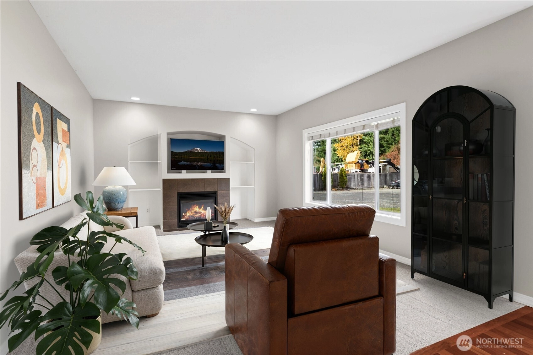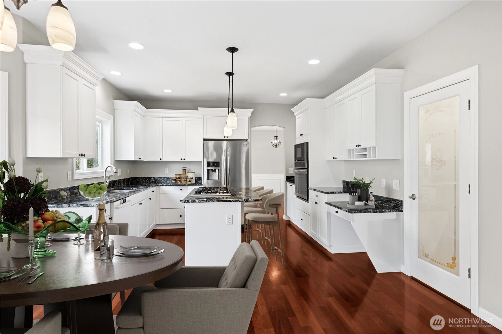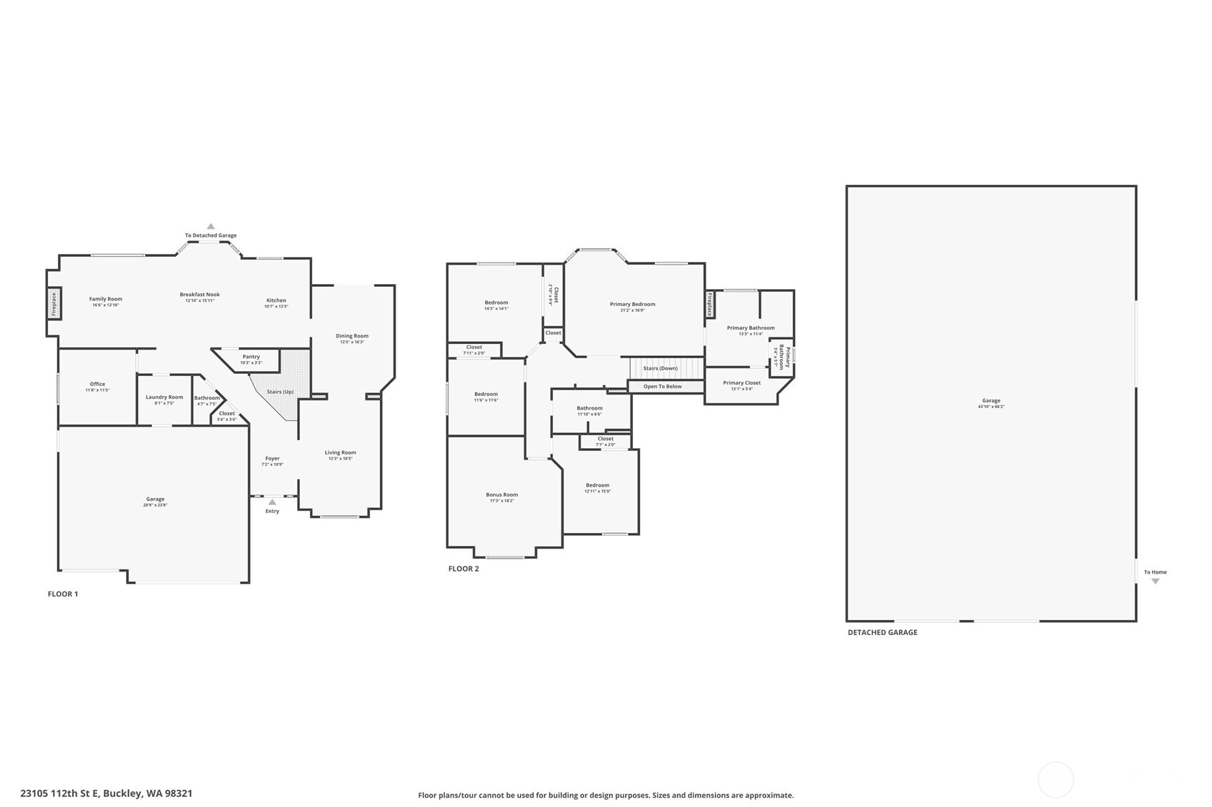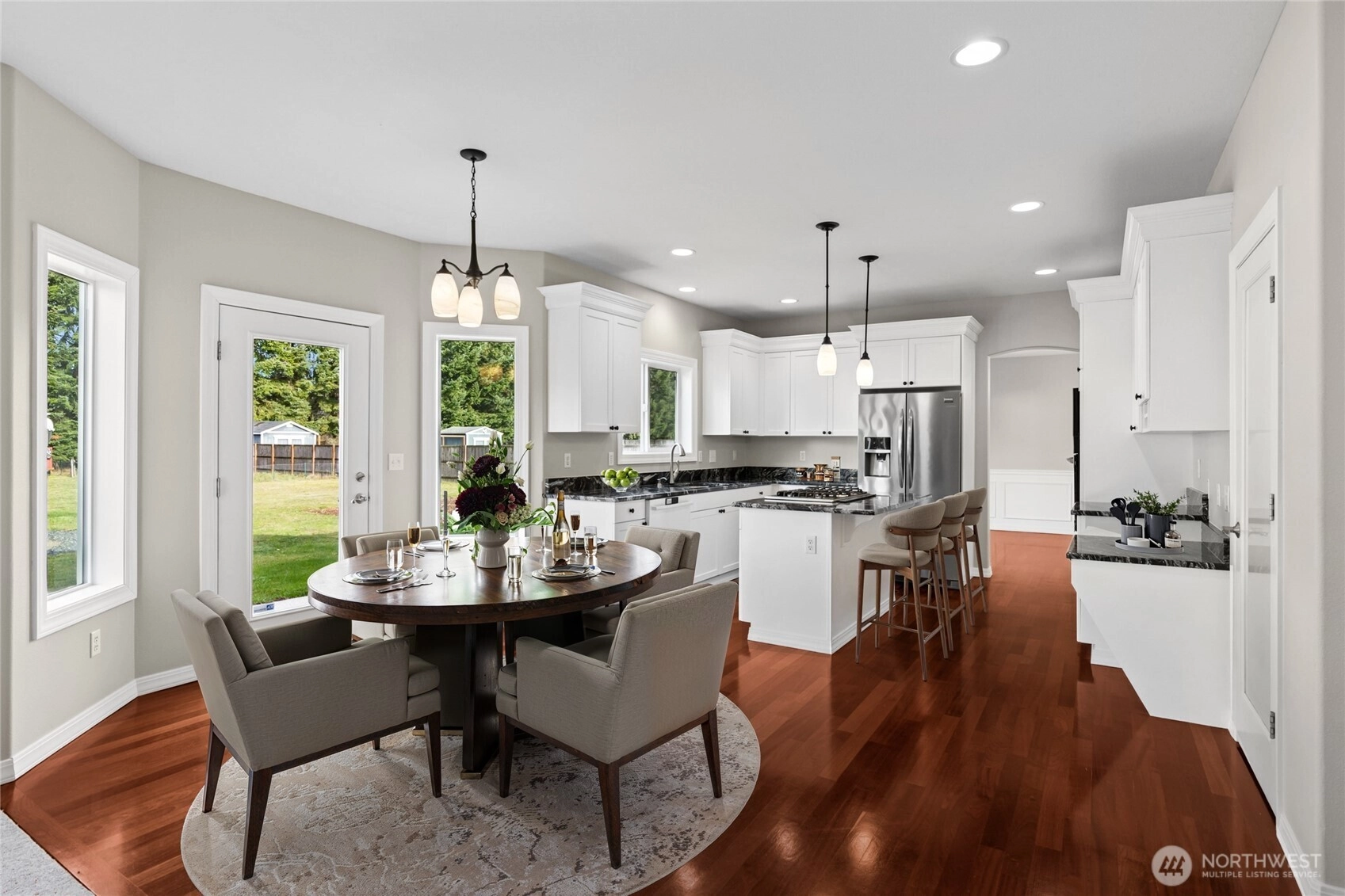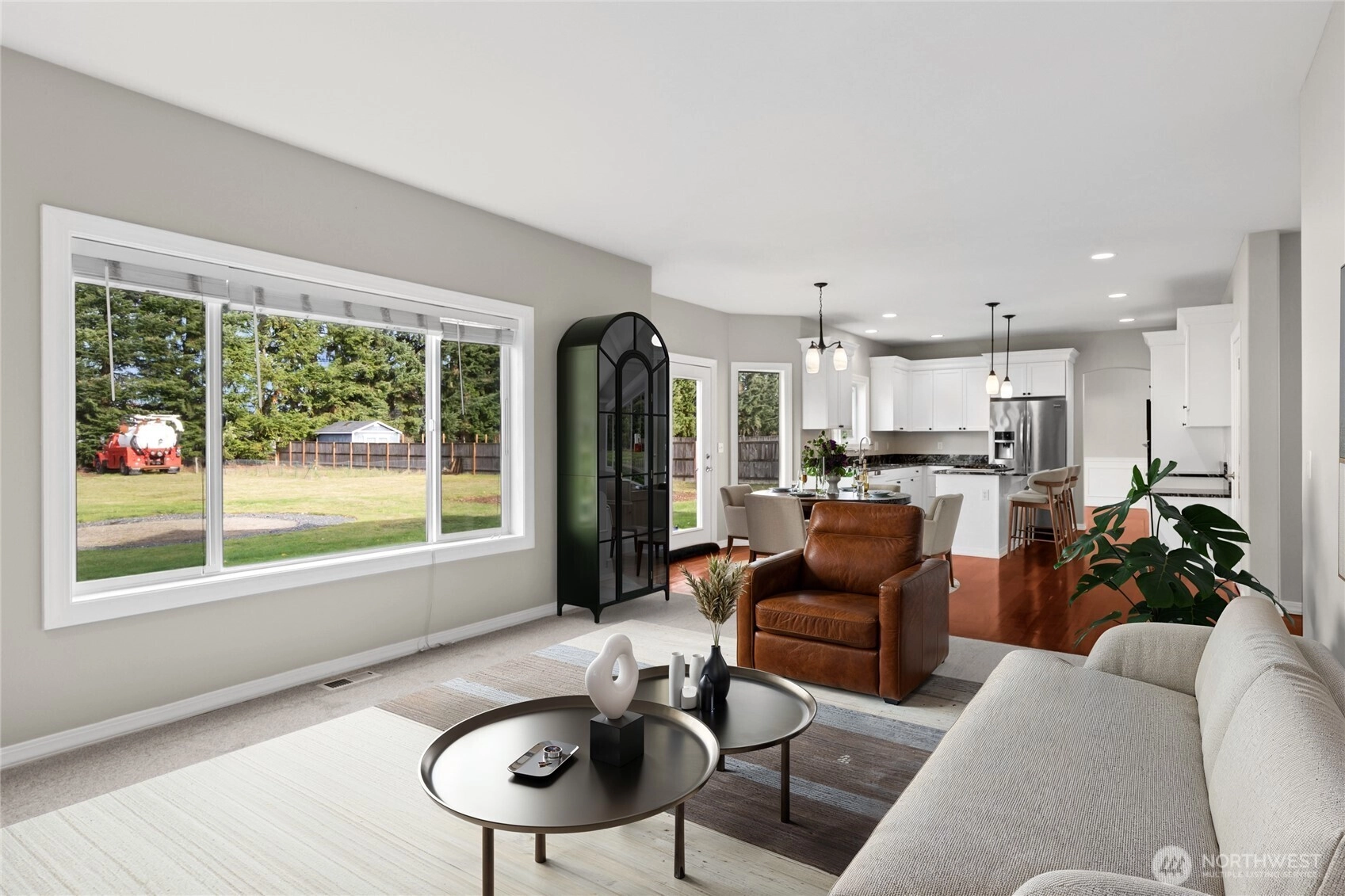 No HOA! Beautifully maintained home on a full, level acre. Fresh updates: new countertops, interior paint, new carpet, fixtures/lighting, & new stove! Spacious 4 bed+den+bonus rm w/ formal living/dining & open gourmet kitchen. Feat. hardwoods, 2 FPs & A/C. Deluxe primary suite has a see-through gas FP to the 5-pc bath w/ large walk-in tile shower. Fenced acre w/ stunning Mt. Rainier view. Massive 40x56 (2,240sf) clear-span steel shop—ideal for hobbies, storage, or business possibilities. Feat: concrete floor, 220 pwr, 3 large doors (14', 12'6", 10'H). Also: 3-car garage, RV parking, RV pwr & dump. End of private paved st, near Hwy 410.