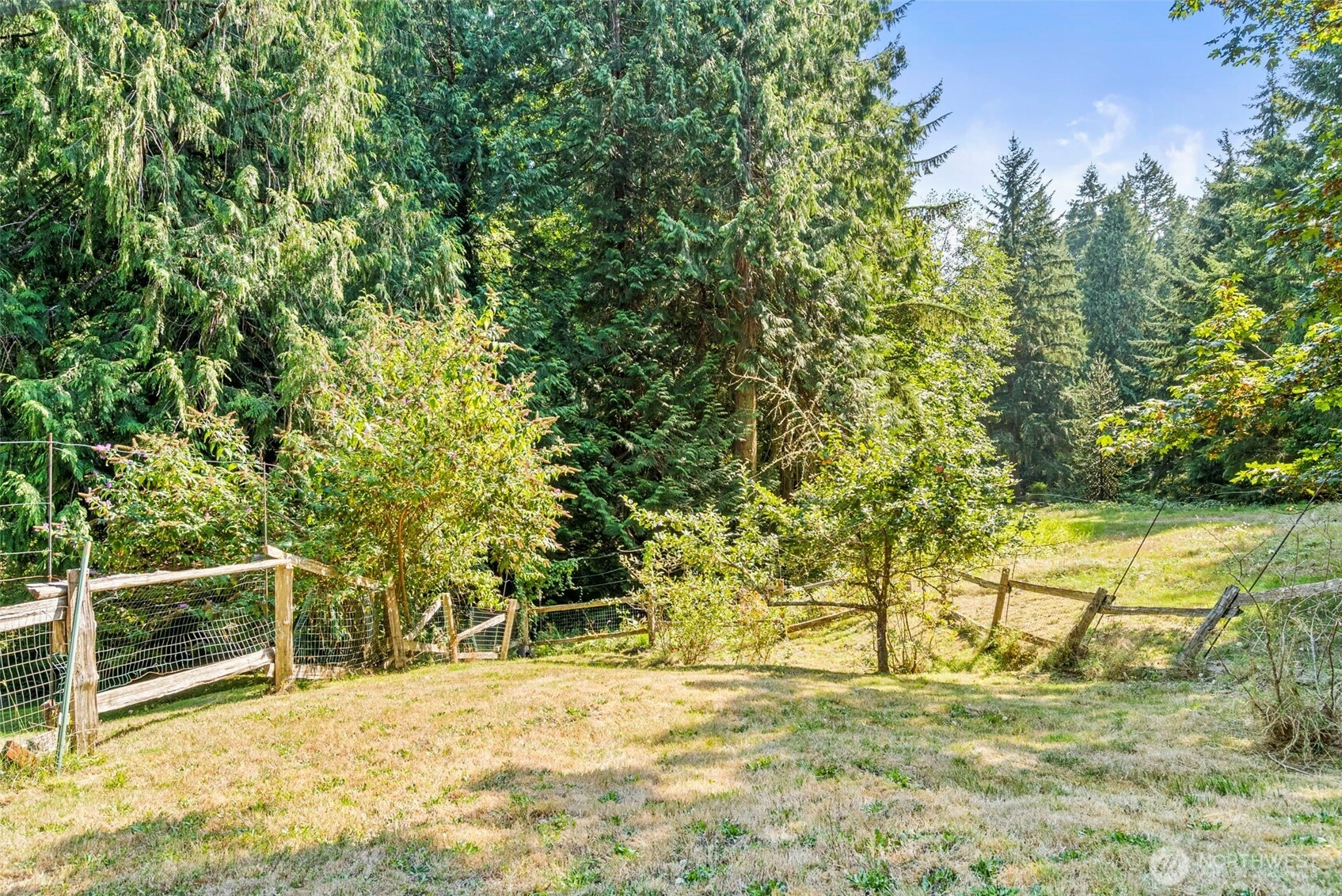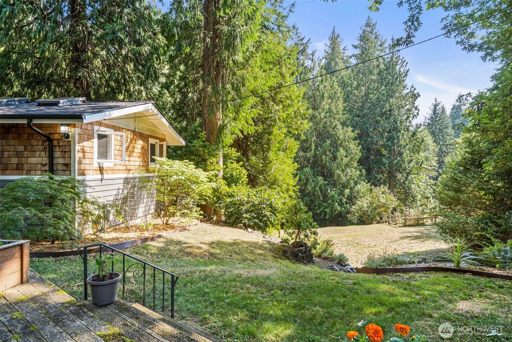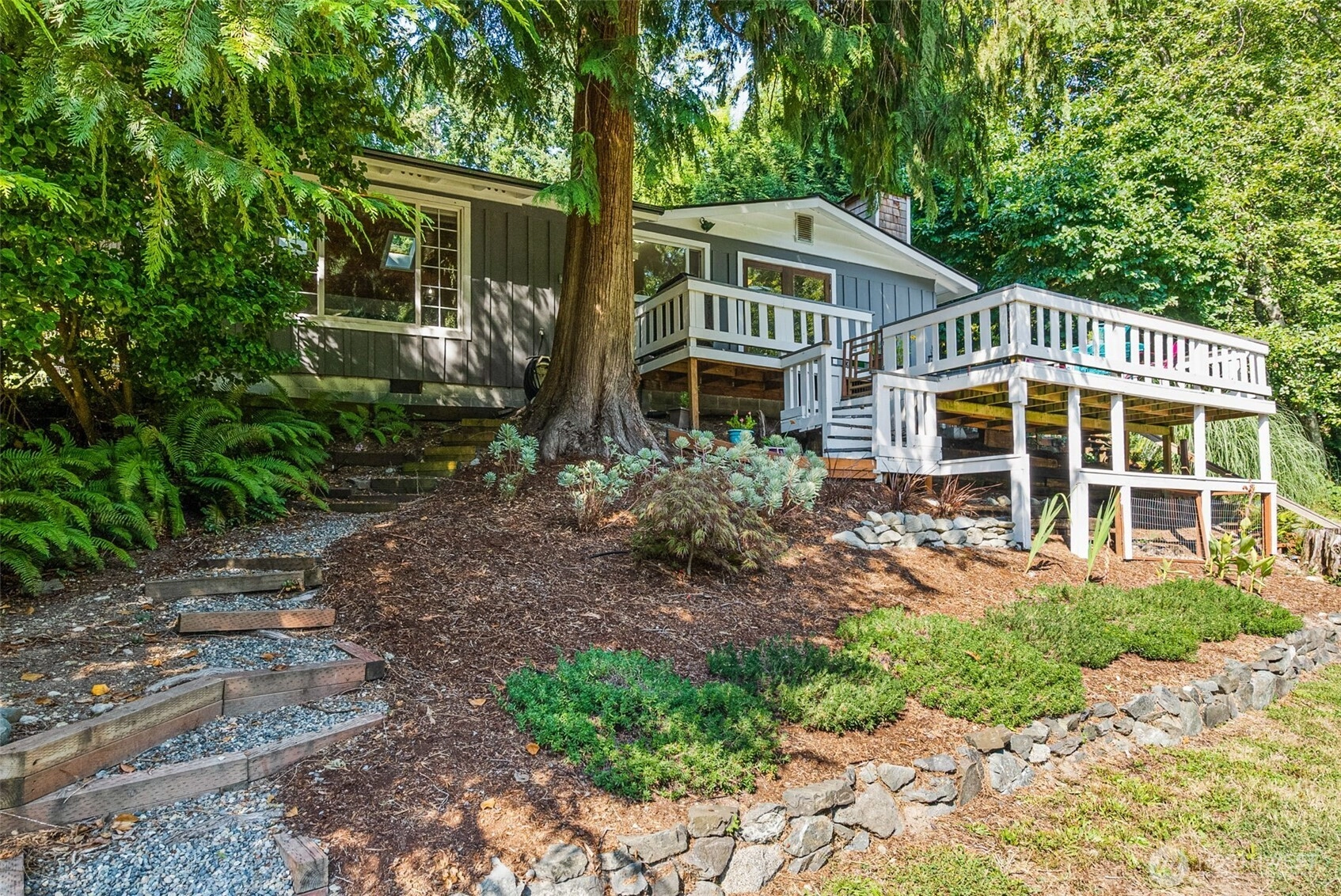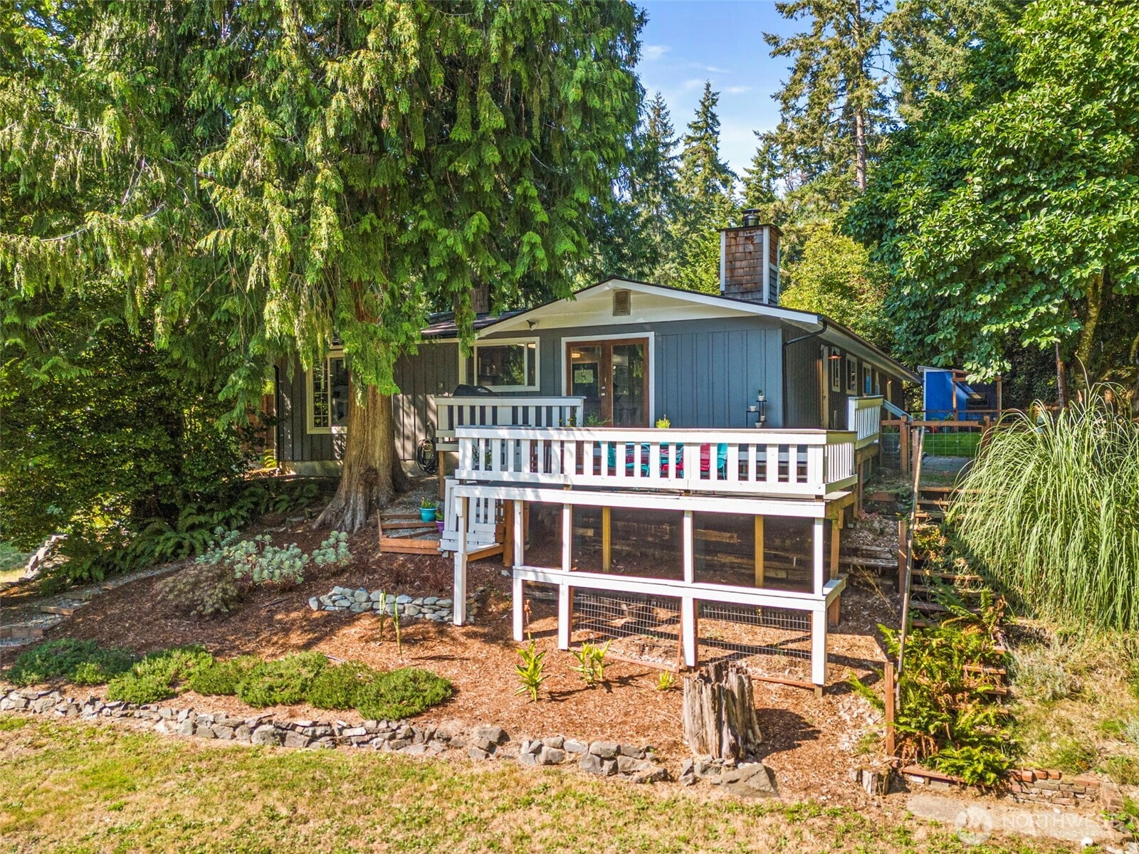 Don't miss this secluded, wooded, and serene private home on +/- .84 acre. This 3-bed, 2 three-quarter bath home blends natural beauty with thoughtful updates. Enjoy Brazilian blonde cherry hardwoods, mahogany flooring in the huge family room, plus laminate and tile throughout. New roof and remediated crawl space offer peace of mind. Kitchen with granite countertops and SS appliances opens to and expansive deck overlooking a rolling hill, garden space, cabana with grapes, fire pit, and multiple fruit trees and berry bushes. Home also offers RV parking, dog run, and large detached 2-car garage.