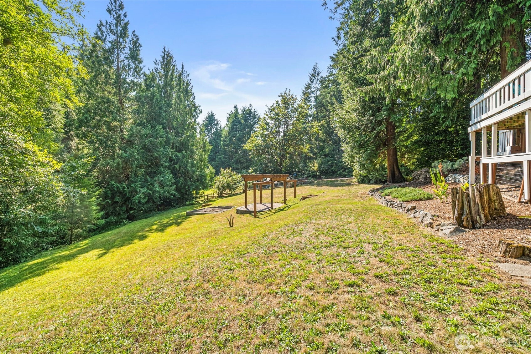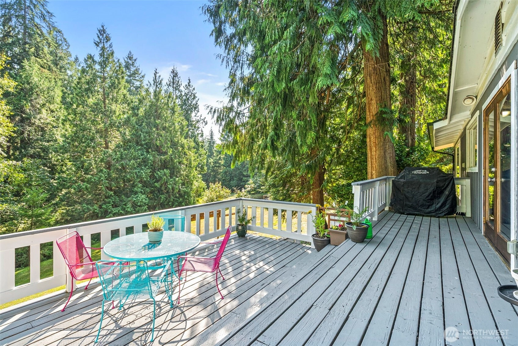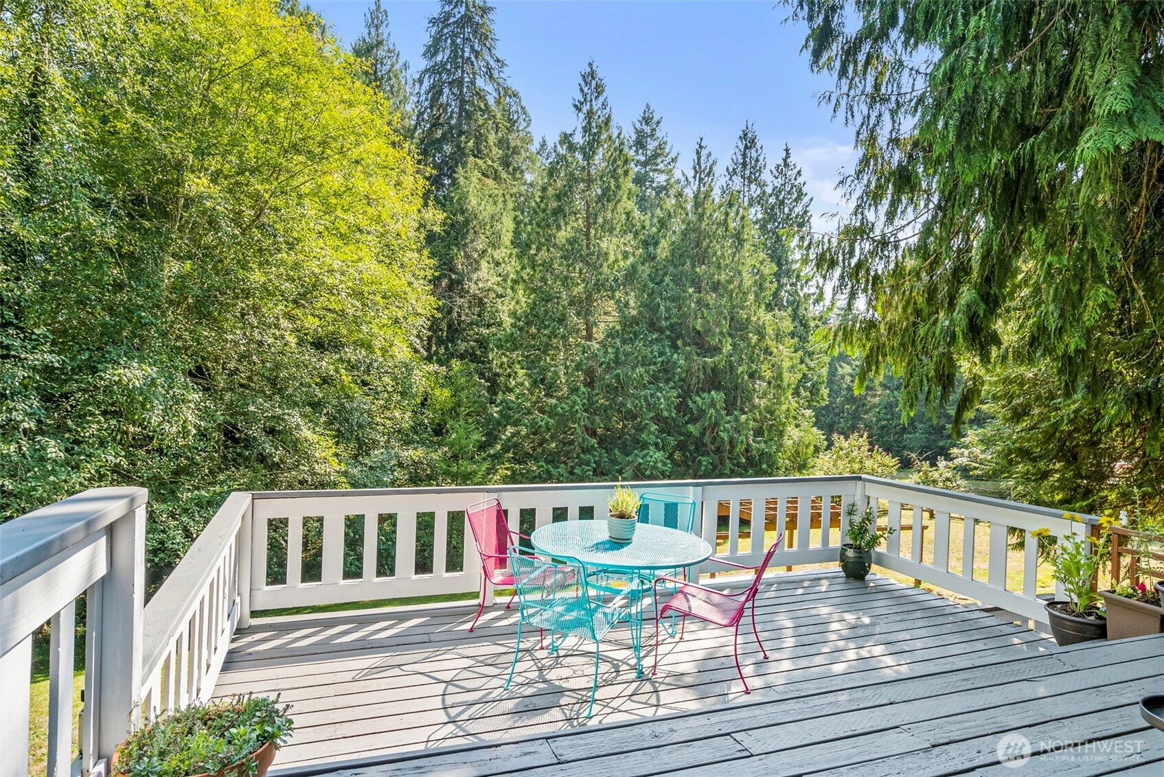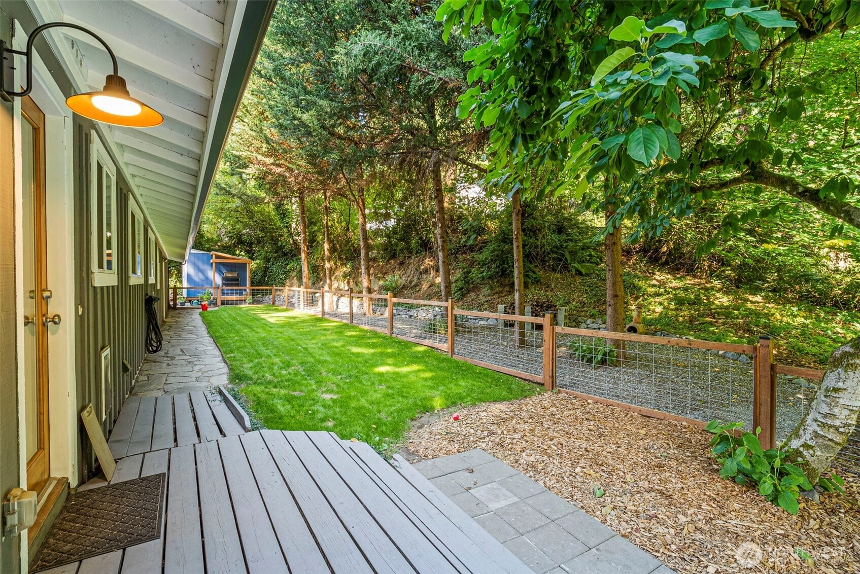 Don't miss this secluded, wooded, and serene private home on +/- .84 acre. This 3-bed, 2 three-quarter bath home blends natural beauty with thoughtful updates. Enjoy Brazilian blonde cherry hardwoods, mahogany flooring in the huge family room, plus laminate and tile throughout. New roof and remediated crawl space offer peace of mind. Kitchen with granite countertops and SS appliances opens to and expansive deck overlooking a rolling hill, garden space, cabana with grapes, fire pit, and multiple fruit trees and berry bushes. Home also offers RV parking, dog run, and large detached 2-car garage.