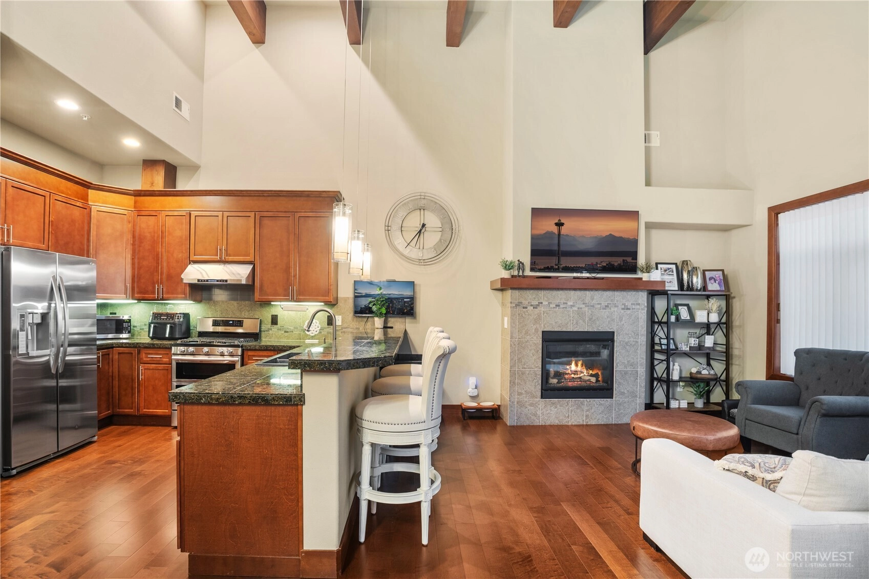 Top-floor corner penthouse unit boasting 17-foot high ceilings with exposed beams and abundant natural light! This stunning 2-bed, 2-bath condo features a chef’s kitchen with stainless steel appliances, granite countertops, plus pantry. Enjoy the warmth of the gas fireplace, beautiful cherry hardwood floors, and air conditioning for year-round comfort. The expansive primary suite offers a luxurious en-suite 5-piece bath and walk-in closet. The versatile office/flex space offers a quiet and comfortable area to work from home. Relax on your private balcony and take advantage of 2 covered parking spaces in this secure, elevator-accessible building. All this plus the convenience of an in-unit washer and dryer. This one is a must see!