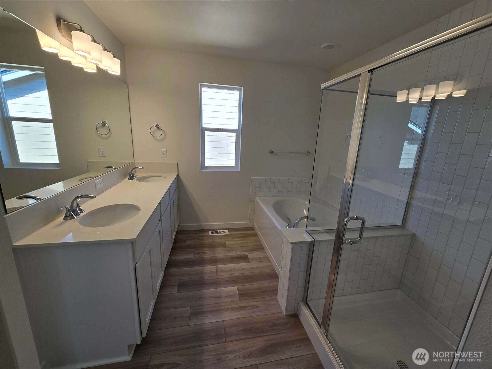 Welcome to the Master Planned Community of McCormick! This home 2,457 sq. ft. is completed and move-in-ready. Home blends style, function, and comfort. The open-concept main floor features 9' ceilings, a linear electric fireplace, and first-floor den/office. The island kitchen boasts white cabinets, quartz countertops, and a tile backsplash. Enjoy a fully fenced backyard with covered patio. Upstairs includes a loft, five-piece primary ensuite, and convenient laundry. ENERGY STAR® certified for lower bills and enhanced comfort. Conveniently located with easy access to the freeway for commuting, shopping, and exploring the Puget Sound region.