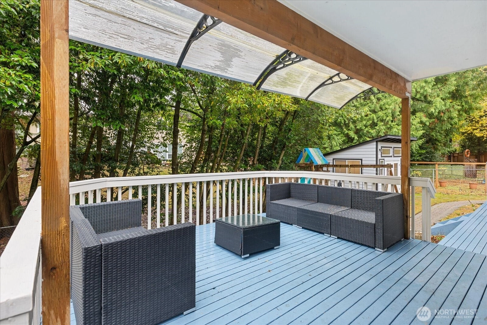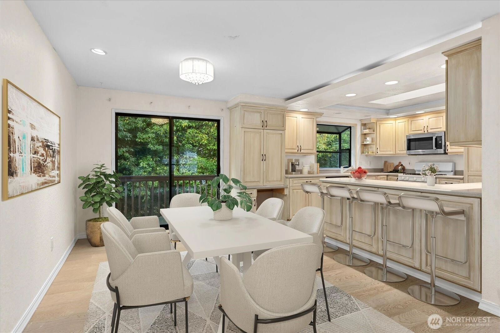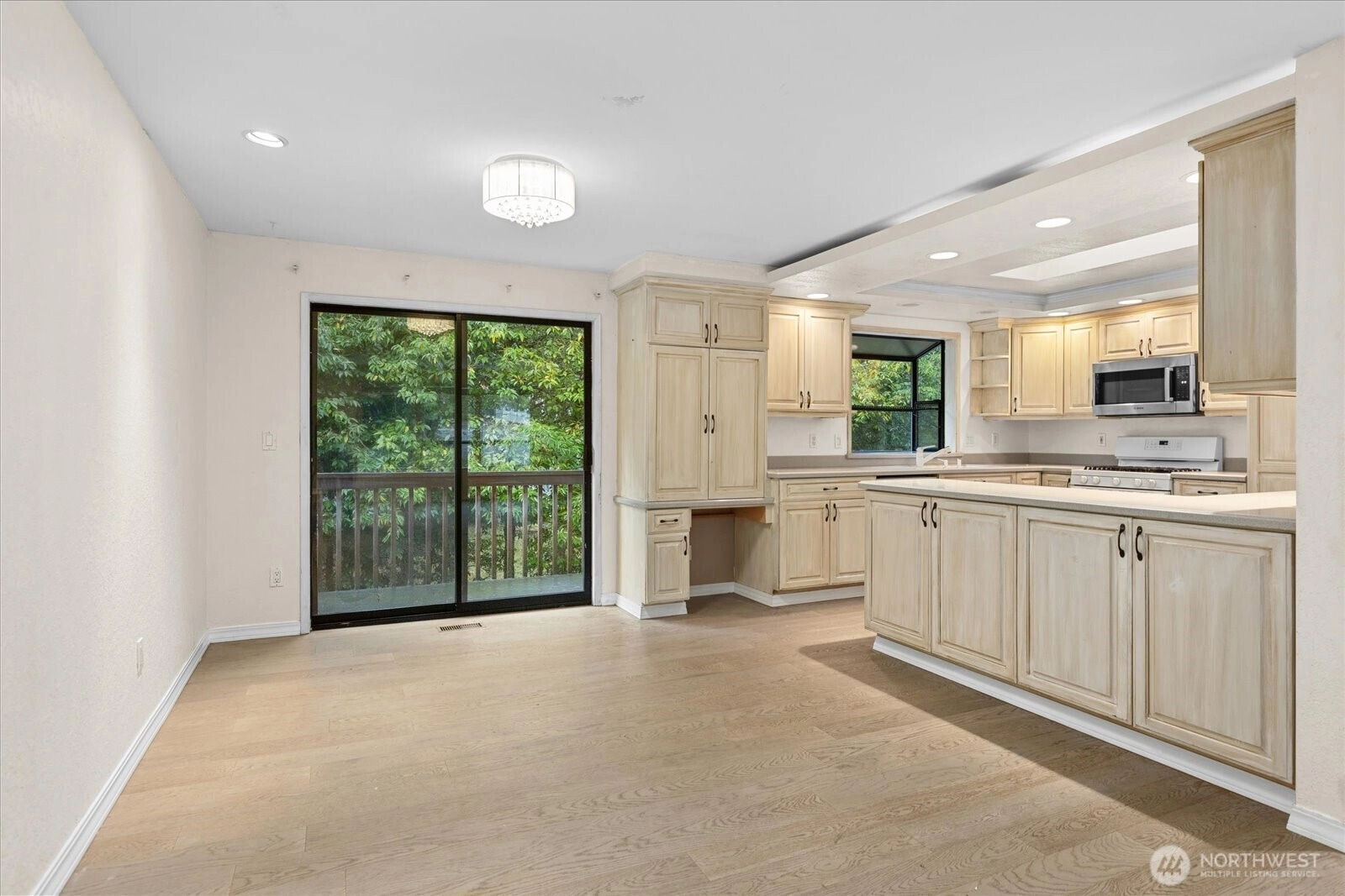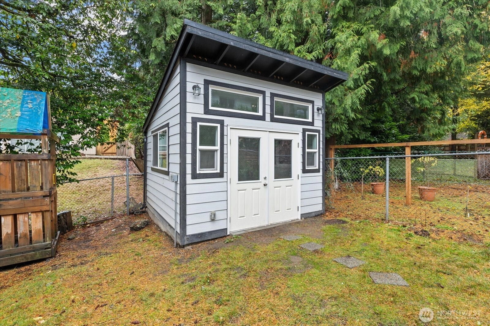 Rare opportunity in the sought-after Bridle Trails community! Bright, open great room with abundant natural light & spacious kitchen featuring gas range, sub-zero fridge, and eating bar. Lower level offers a separate entry, large family room, full bath, and second kitchen with slider to an entertainment-sized deck, ideal as an ADU for multi-generational living or rental income. Attached two-car garage with ample storage. Fully fenced backyard with storage shed and 12x12 insulated, heated office - perfect for WFH. Prime location on a quiet dead-end street, just steps to Taylor Fields Park and Bridle Trails State Park, and minutes to vibrant downtown Kirkland, Bellevue, and top-rated LWSD schools! One of the best neighborhoods in Kirkland!