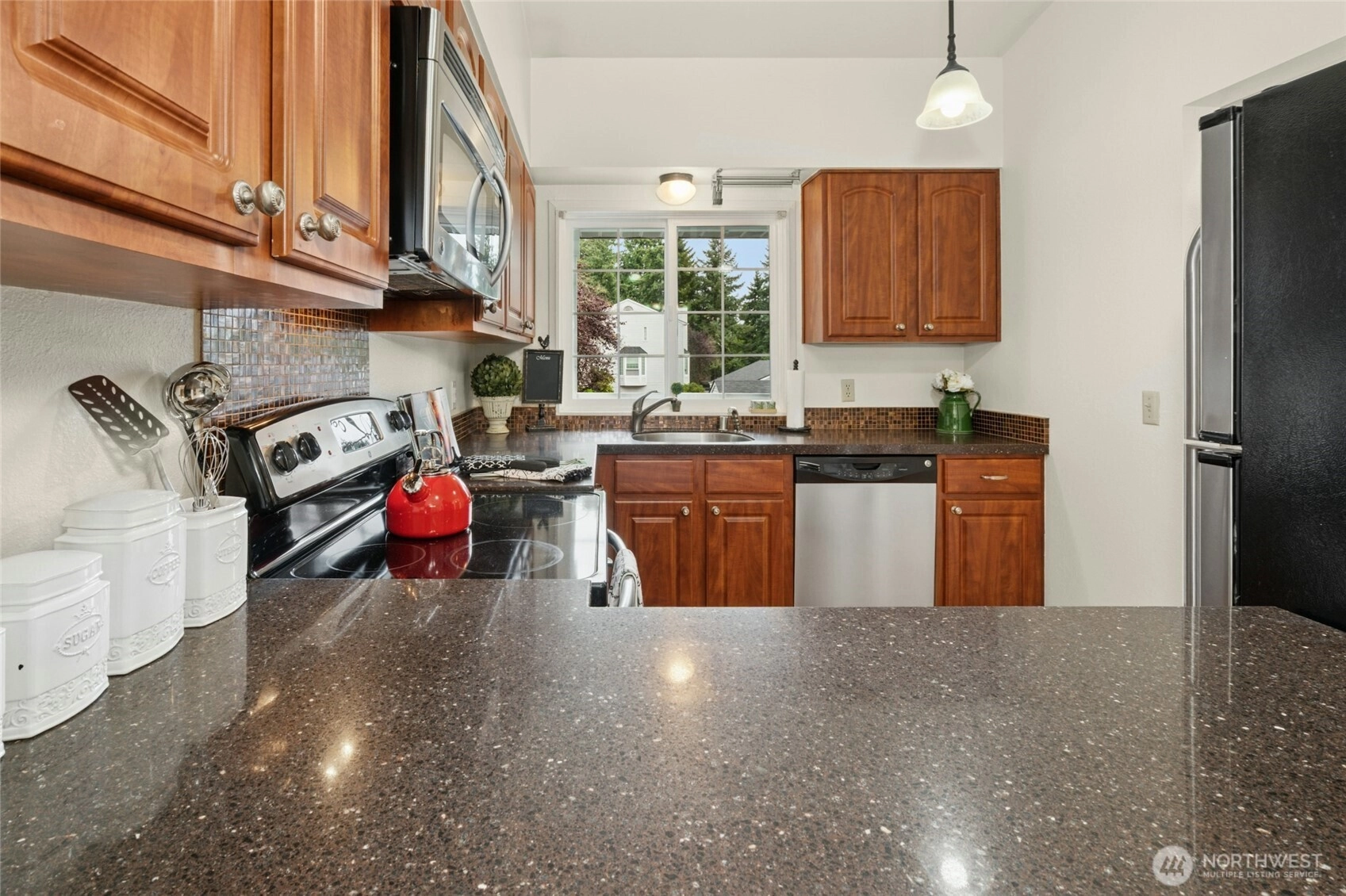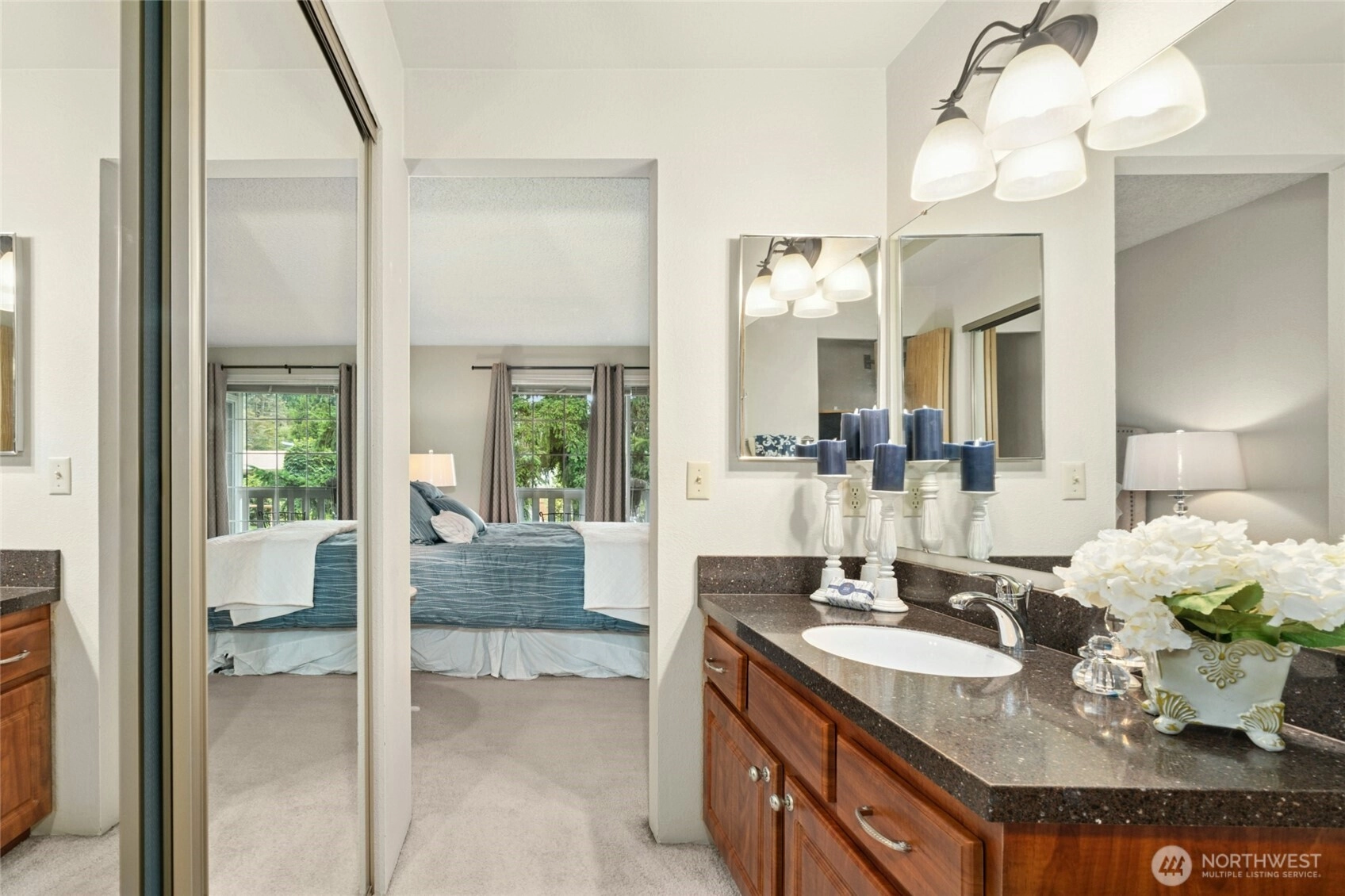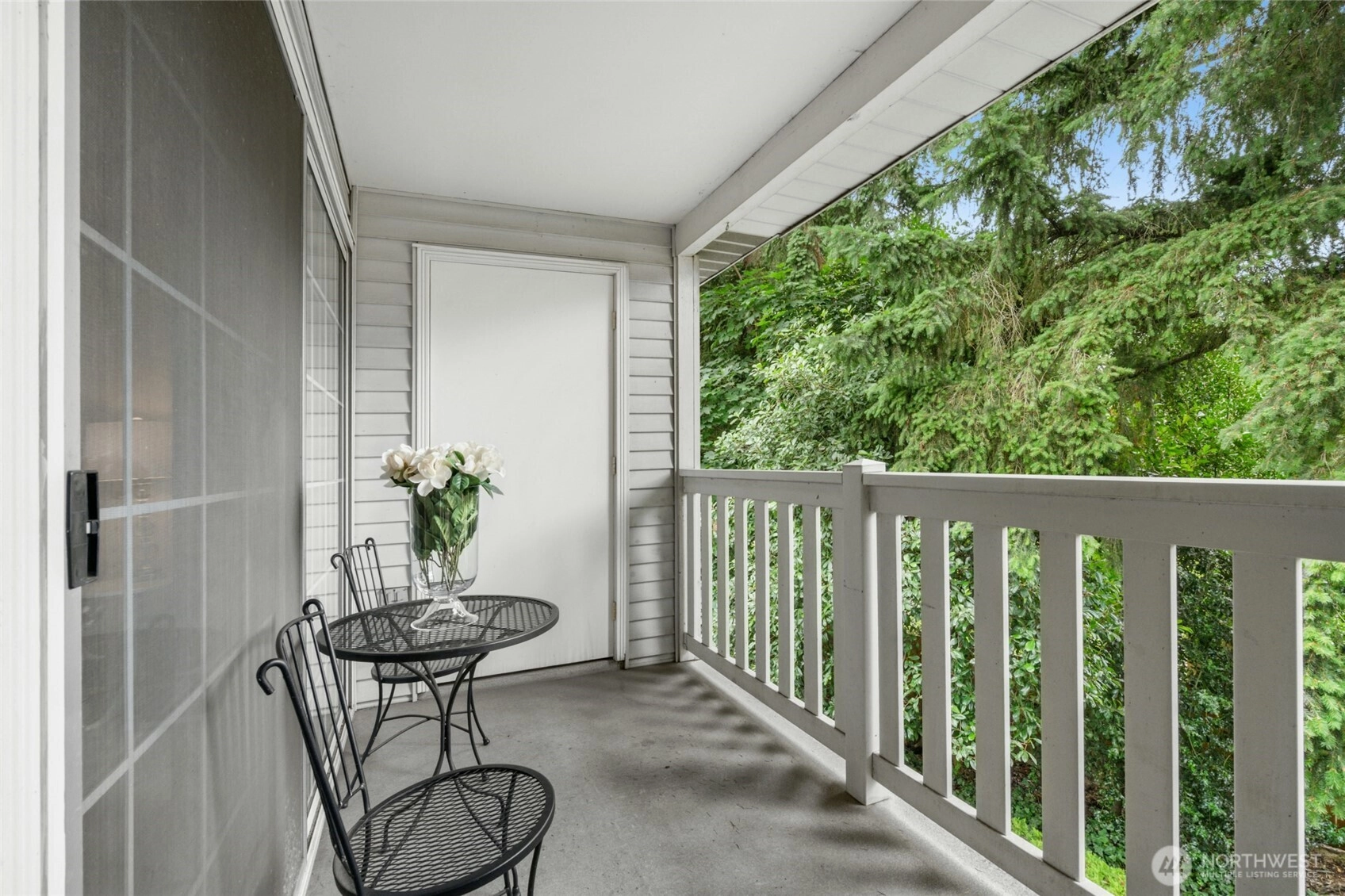 Welcome home to your top floor beautifully remodeled condo at Concord Hill featuring 2 bedrooms, 1.25 bathrooms and 897 SF. Bright, open and spacious floorplan with south-facing views. Chef's kitchen features SS appliances, cherry cabinets, black granite countertops & laminate floors. Entry skylight and impressive vaulted ceilings in the dining and living room with wood burning fireplace. Oversized Master Bedroom includes access to the private balcony and boasts multiple large closets. Fantastic conveniences include an in-unit Maytag Washer/Dryer and individual garage. Within walking distance to Factoria Mall, restaurants & Newport High School. Centrally located just minutes to I-405 and I-90. Award winning Bellevue Schools!