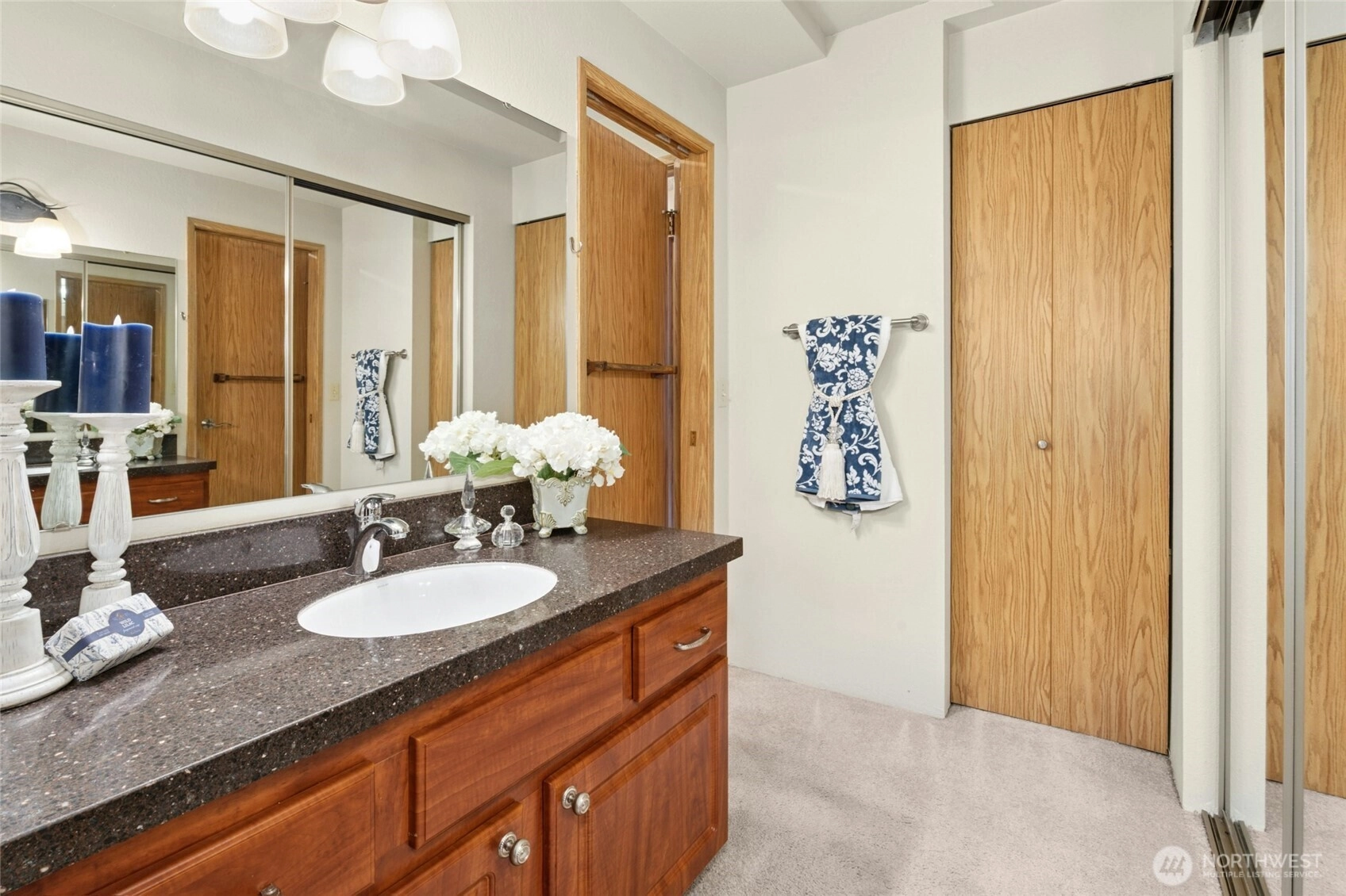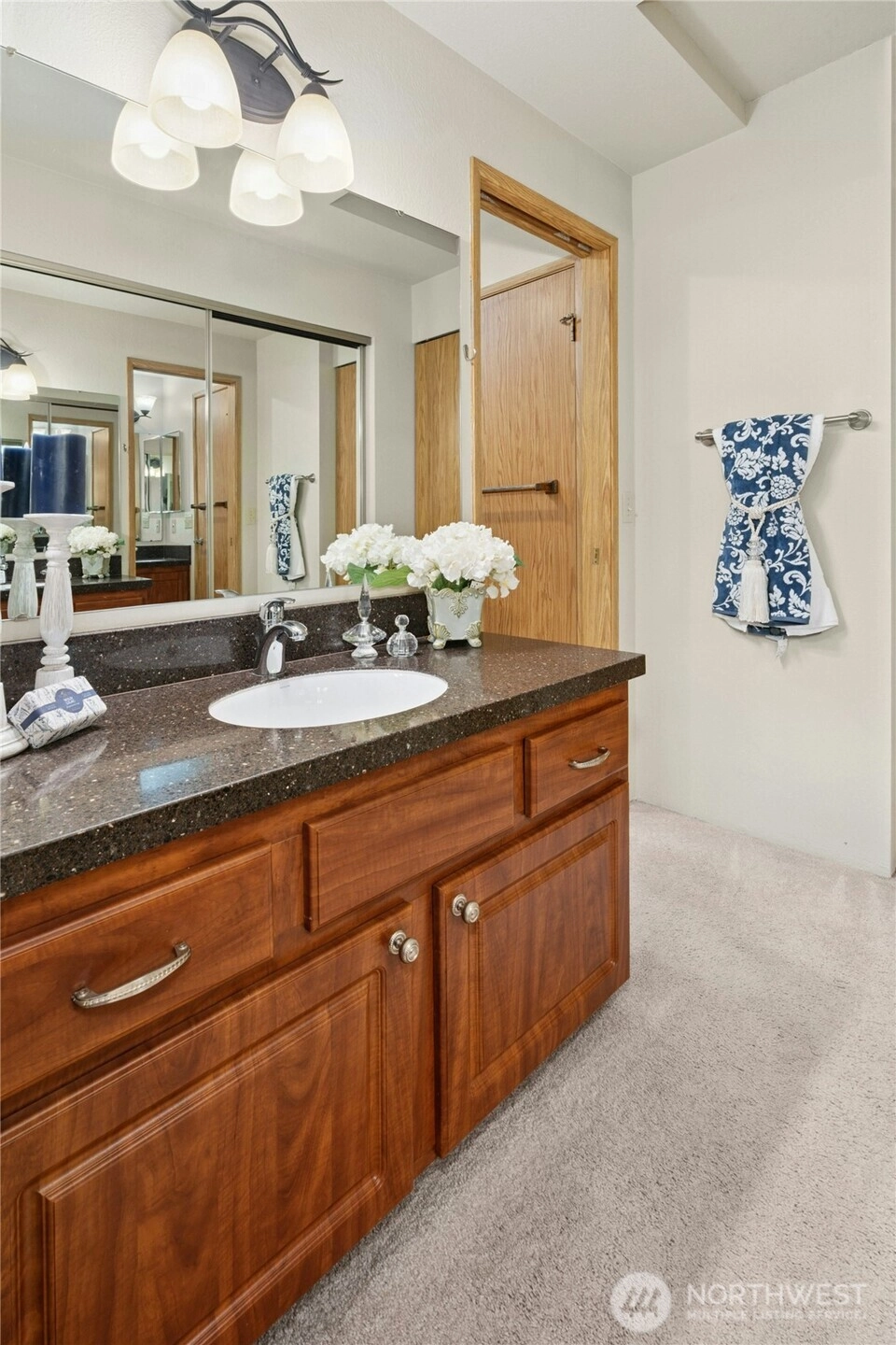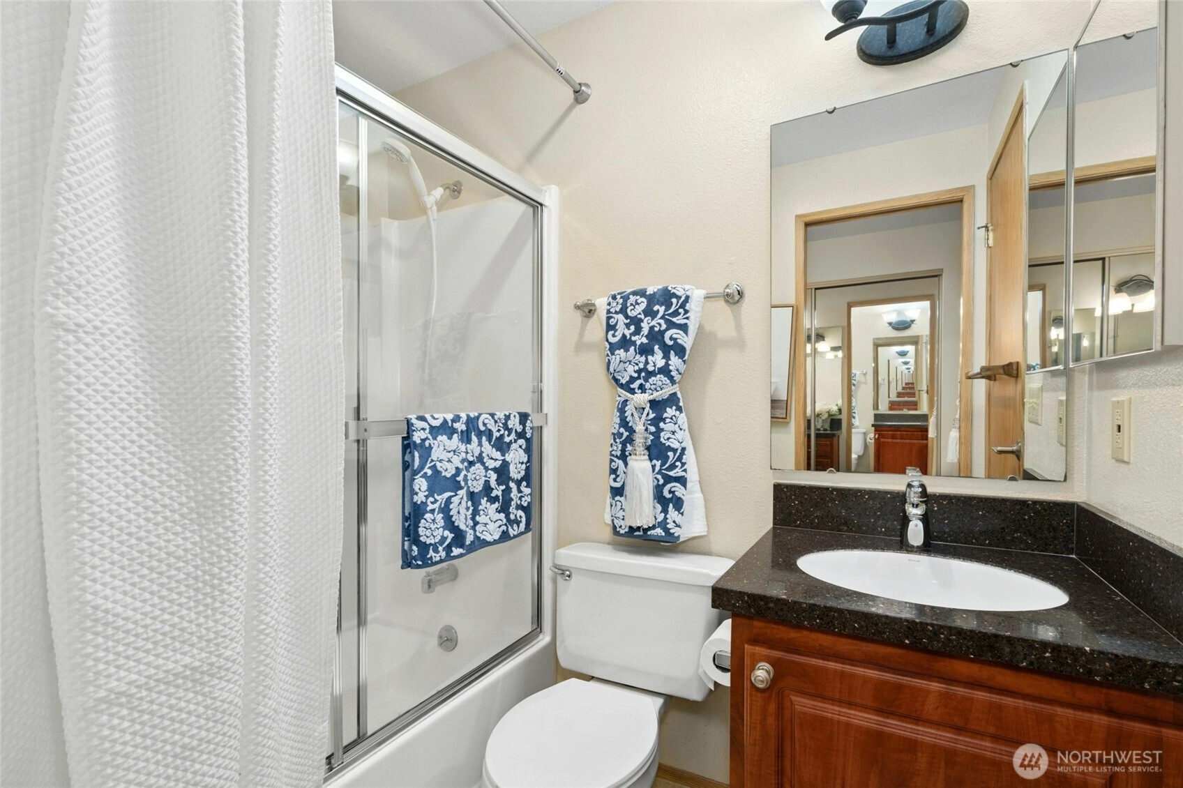 Welcome home to your top floor beautifully remodeled condo at Concord Hill featuring 2 bedrooms, 1.25 bathrooms and 897 SF. Bright, open and spacious floorplan with south-facing views. Chef's kitchen features SS appliances, cherry cabinets, black granite countertops & laminate floors. Entry skylight and impressive vaulted ceilings in the dining and living room with wood burning fireplace. Oversized Master Bedroom includes access to the private balcony and boasts multiple large closets. Fantastic conveniences include an in-unit Maytag Washer/Dryer and individual garage. Within walking distance to Factoria Mall, restaurants & Newport High School. Centrally located just minutes to I-405 and I-90. Award winning Bellevue Schools!