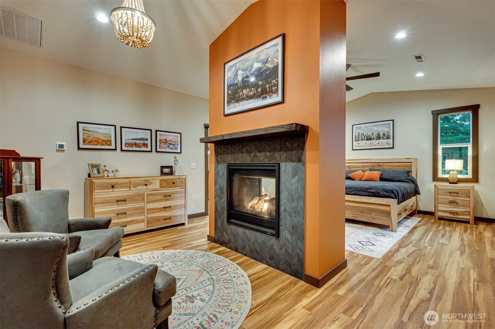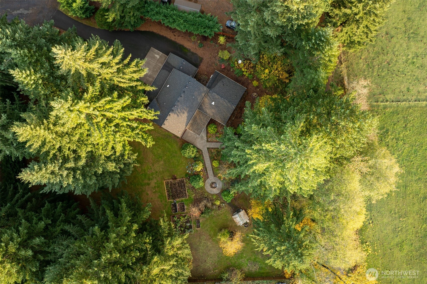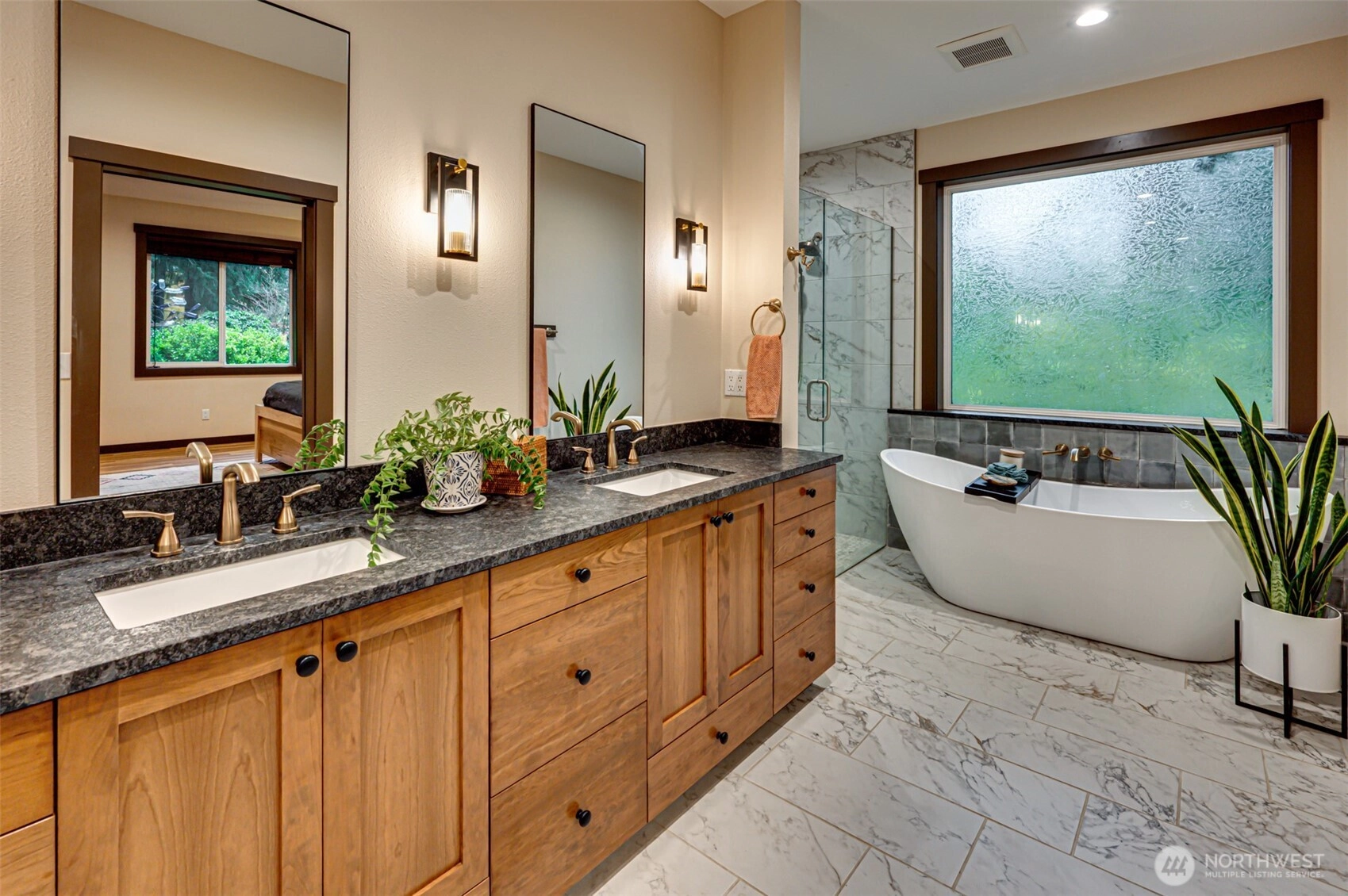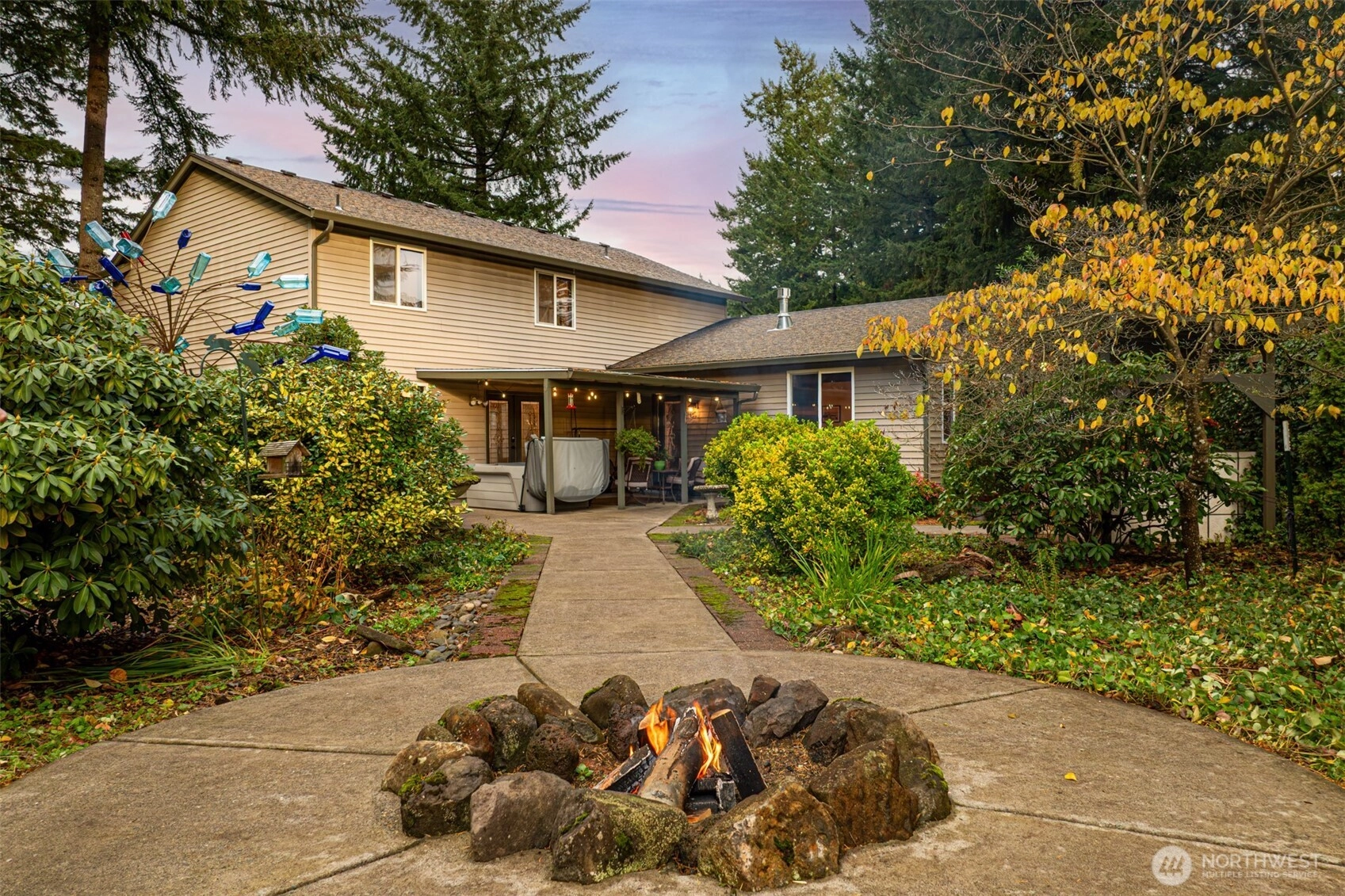 Welcome home! Beautifully maintained private acreage property with an open floor plan, LVP flooring, granite counters, and custom cabinets. The kitchen features stainless Frigidaire double ovens, convection microwave, and a farmhouse sink. Huge main-floor primary suite addition completed in 2023 with vaulted ceilings, dual-sided fireplace, heated tile floors, freestanding tub, and curbless shower. Upstairs offers four more bedrooms, including a second ensuite. Outside, enjoy the oversized covered patio, covered BBQ area, organic deer-proof gardens, 3-car garage, private well, and generator plug. Just 15 min to Battleground, and 40 minutes to PDX.