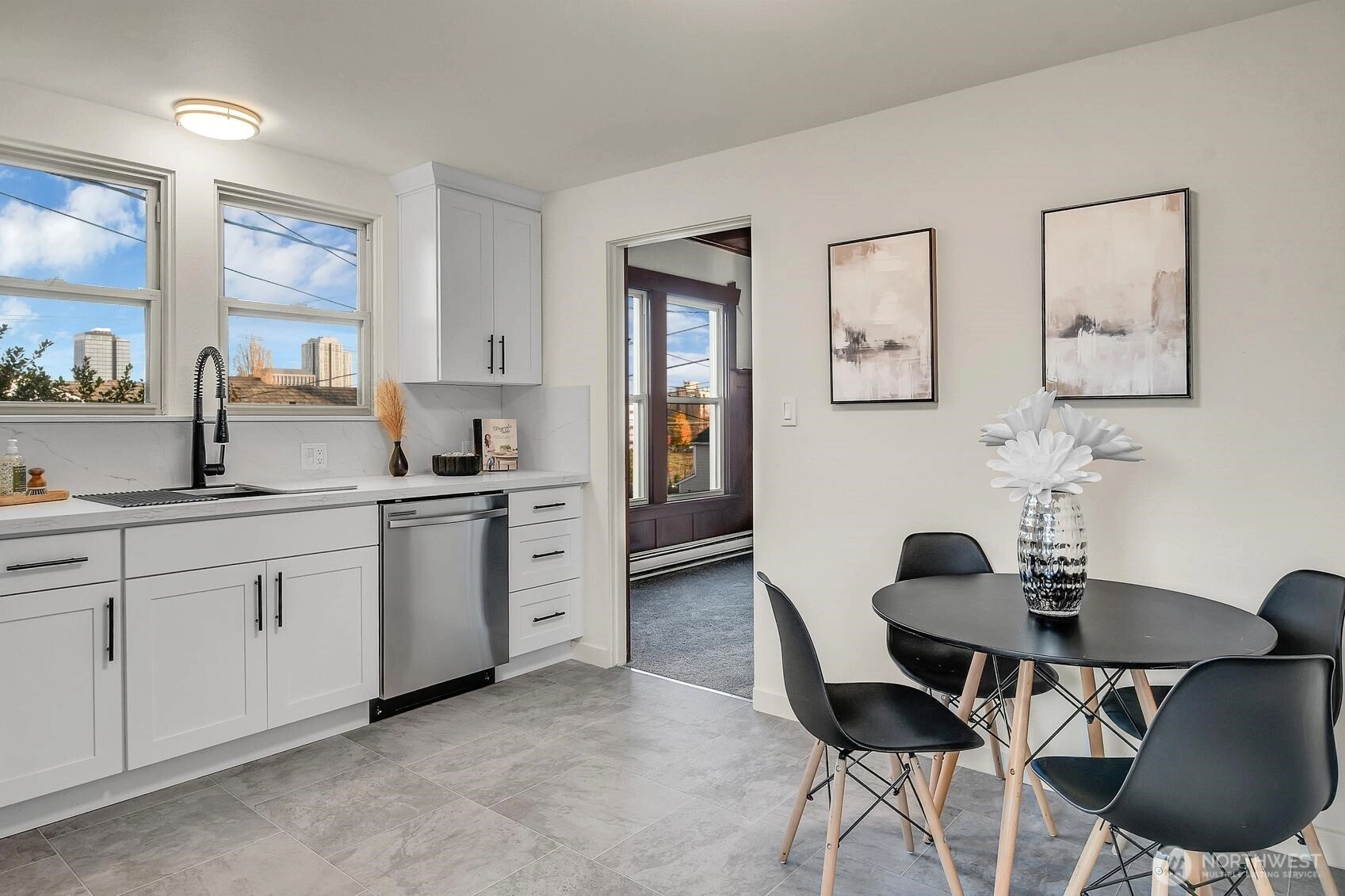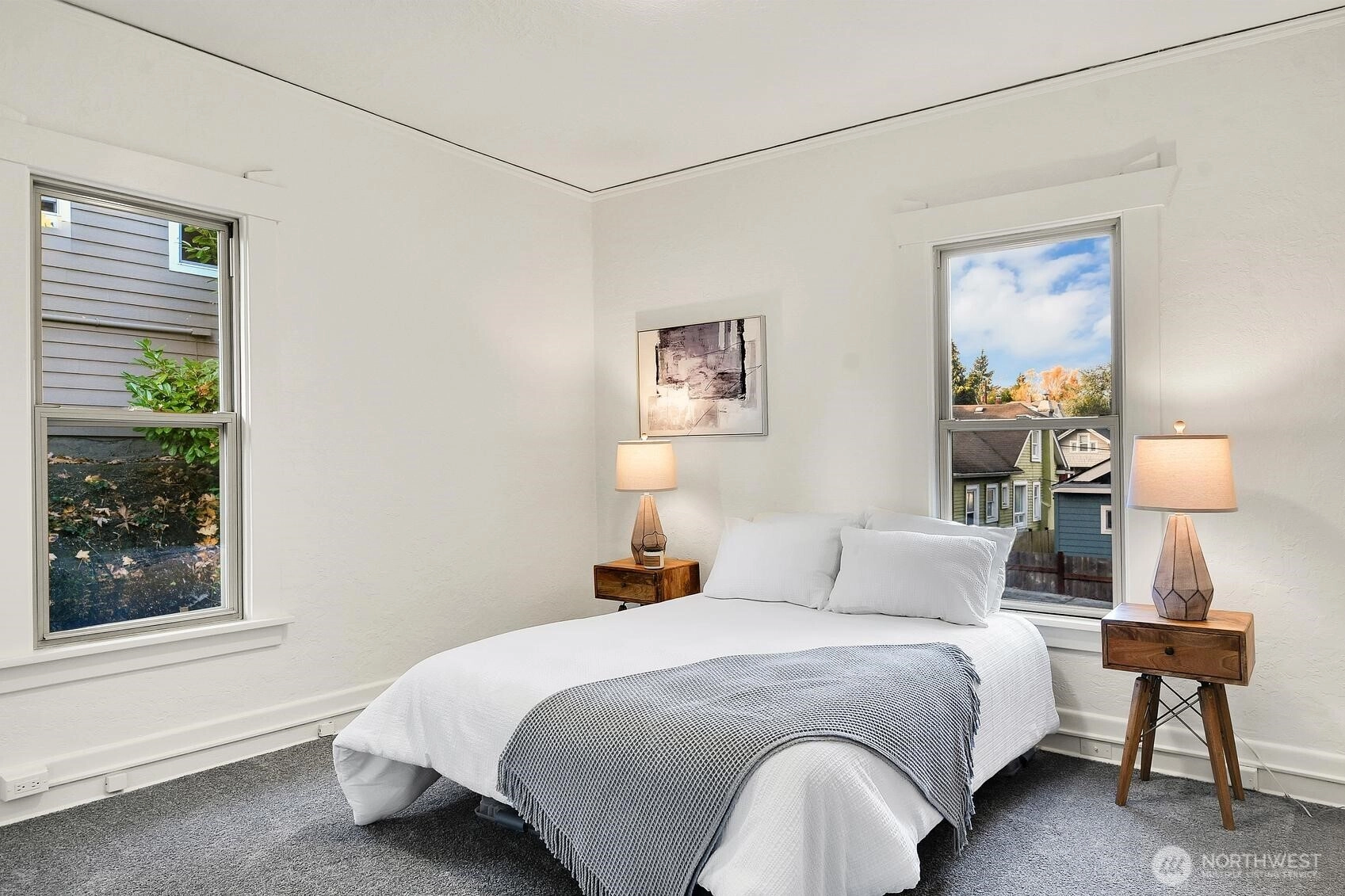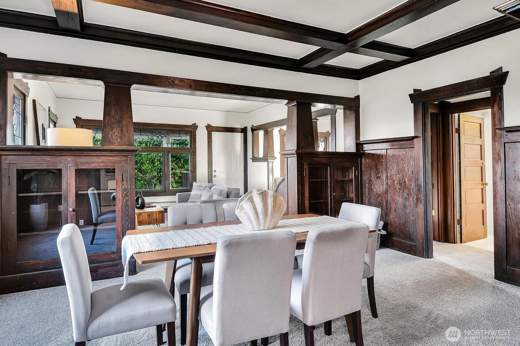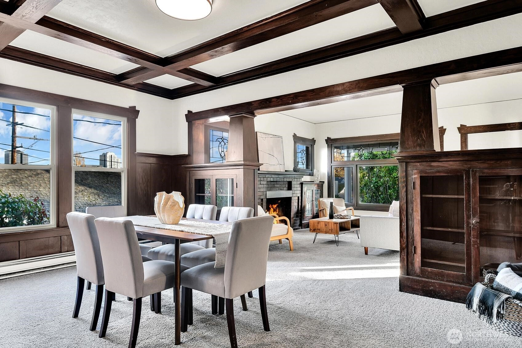 Wallingford 6-bed Craftsman lives like a duplex. Original dark-stained wainscoting, rich millwork, box-beam ceilings & built-in cabinetry lend true Craftsman charm. Light-filled living room features fireplace (sealed) & decorative leaded-glass transom windows throughout. Formal dining. All-new kitchen w/ white shaker-style cabinetry, quartz countertops, new sink, Samsung range & all SS appliances. New carpet & vinyl throughout. Upstairs captures city & territorial views. Lower level w/ separate entry & full 2nd kitchen offers great rental or multi-gen potential. Long private driveway w/ ample parking. Owner financing available. Moments to UW, DT Seattle & Green Lake the best of in-city living.